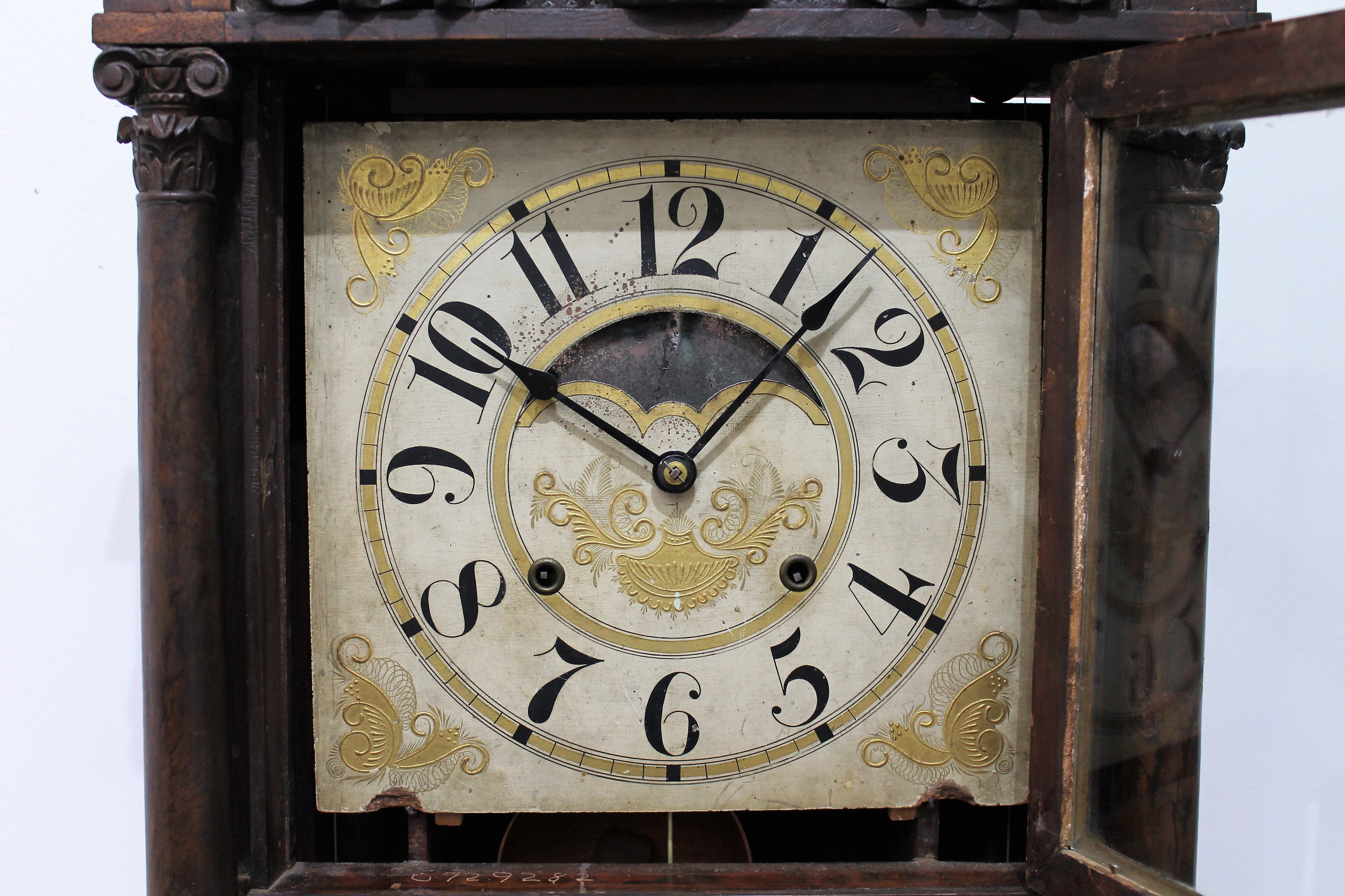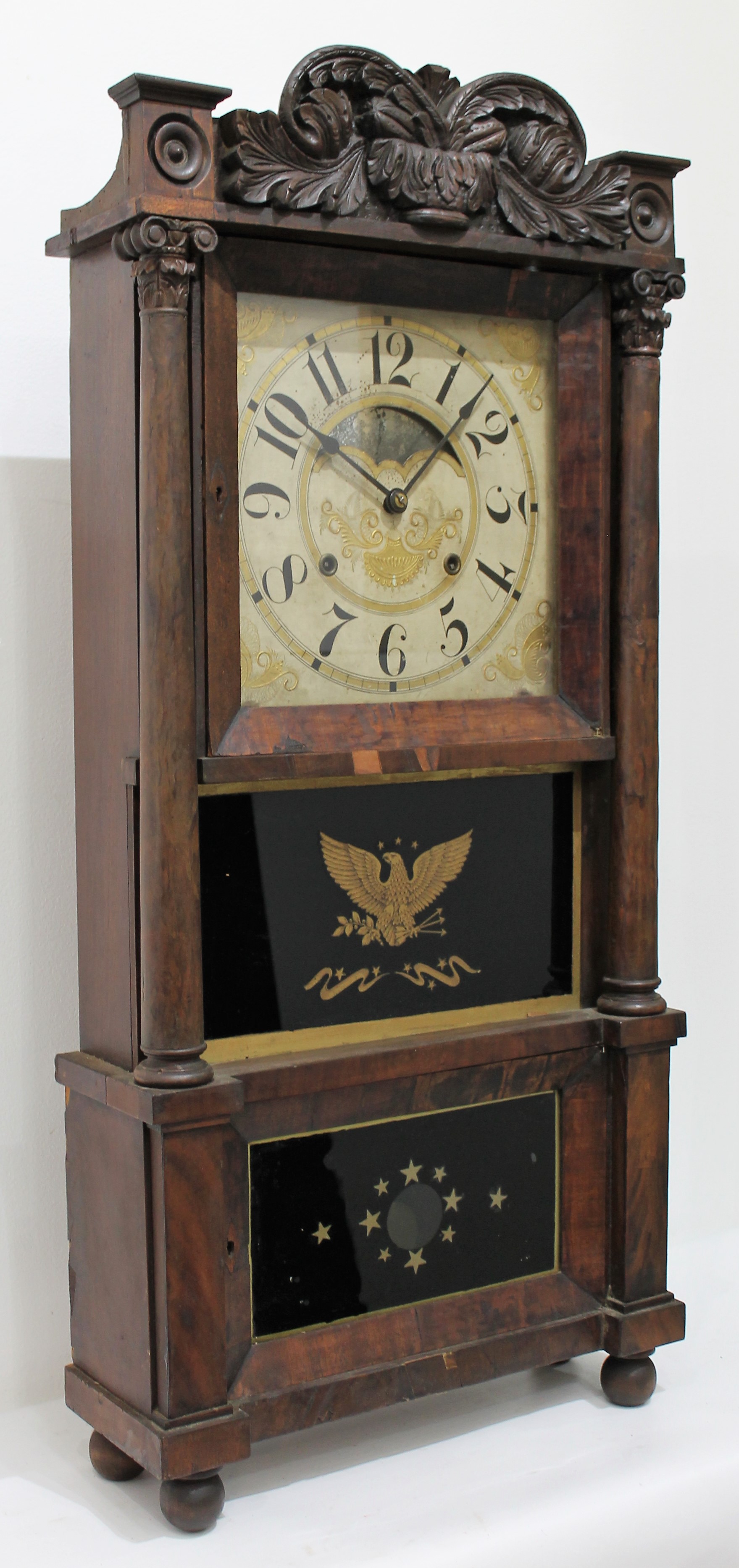 C. & L.C. Ives “Patent Brass Eight Day Clock”, 1830-1837. Although most of the label is gone, enough is present in conjunction with the characteristic movement to identify the makers. The case is 38 inches tall on ball feet front and back, with an attractive carved splat. The full columns are veneered in figured