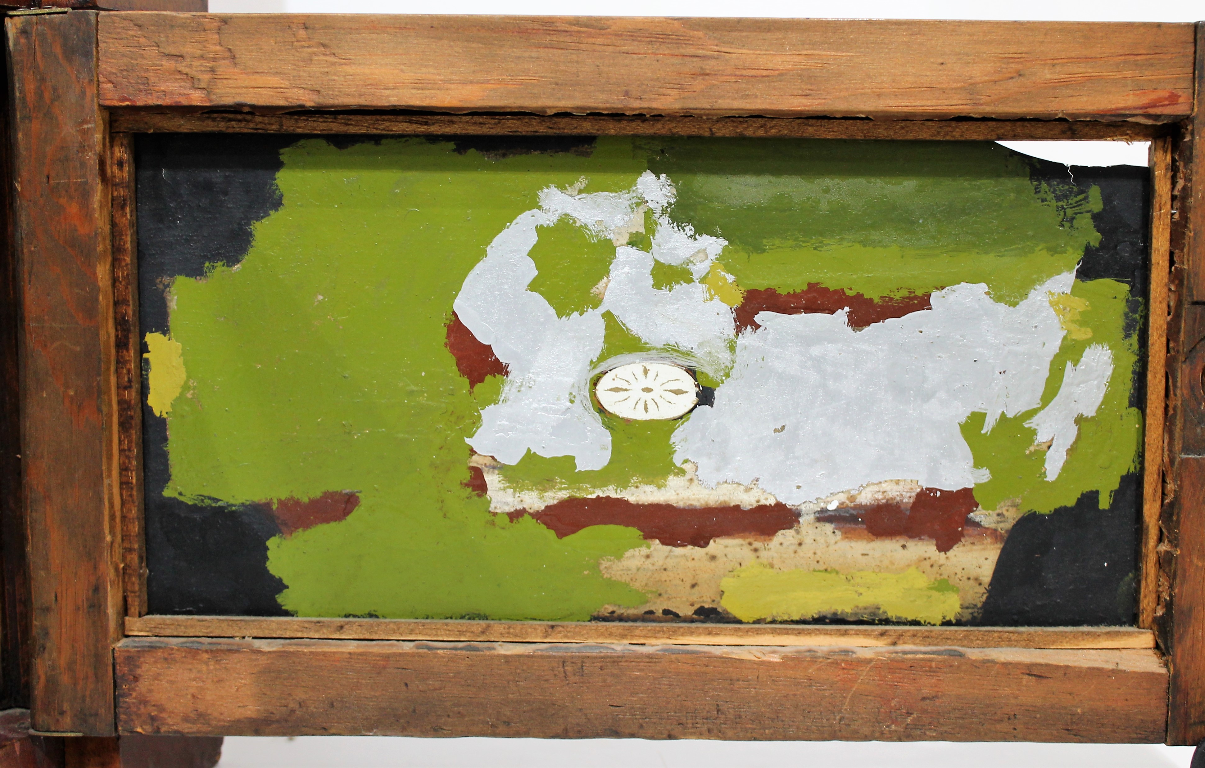 as have the chimneys on top, the dial glass and mirror are modern, the columns have been repainted, the splat is quite wrong. The bottom door glass is a period replacement, the tablet touched up and a piece missing in the upper left corner. Inside it’s