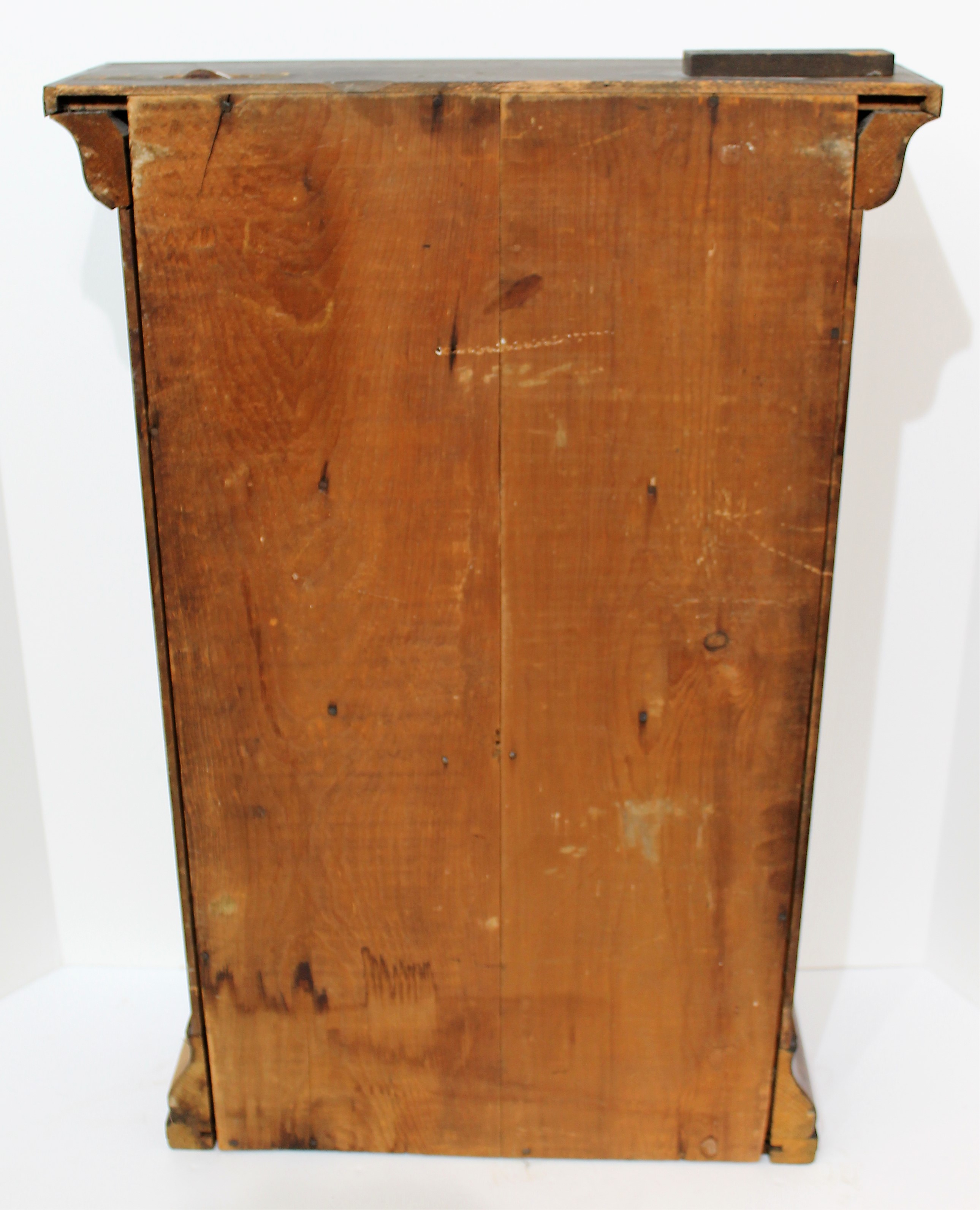 bob. A decent label inside with wear. One wooden dust cover for a weight pulley remains. The veneer on the right