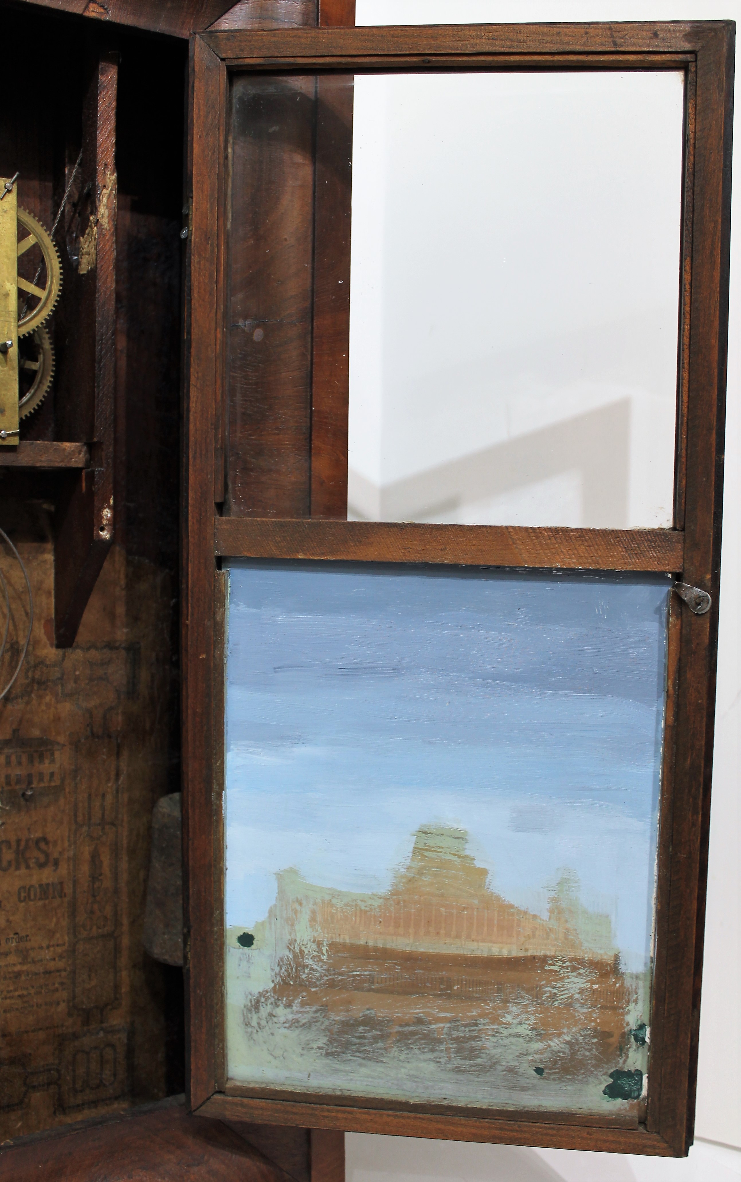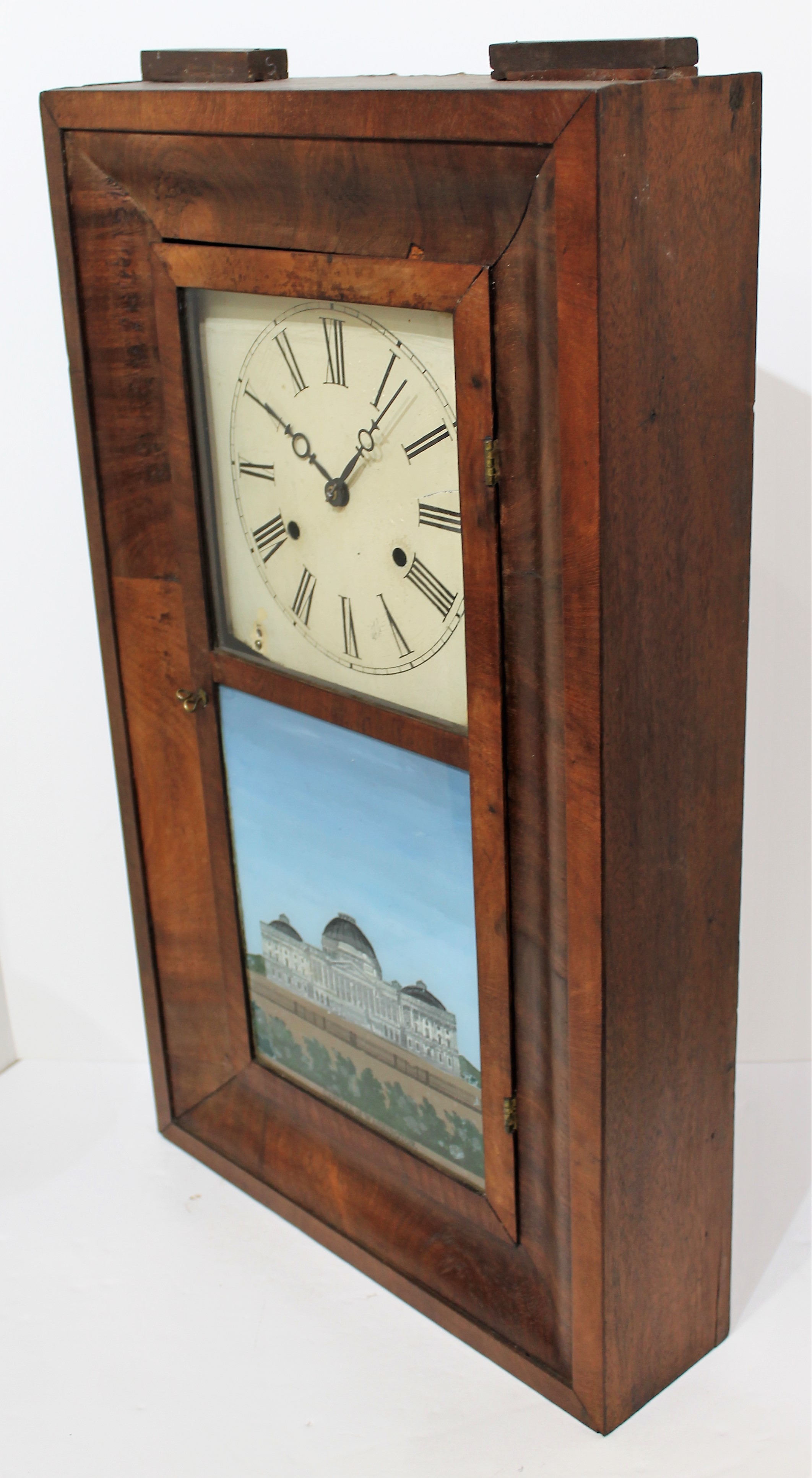 a Jerome movement; it is running and striking with two old weights. A good label. Collectable for the tablet. $50-$150.