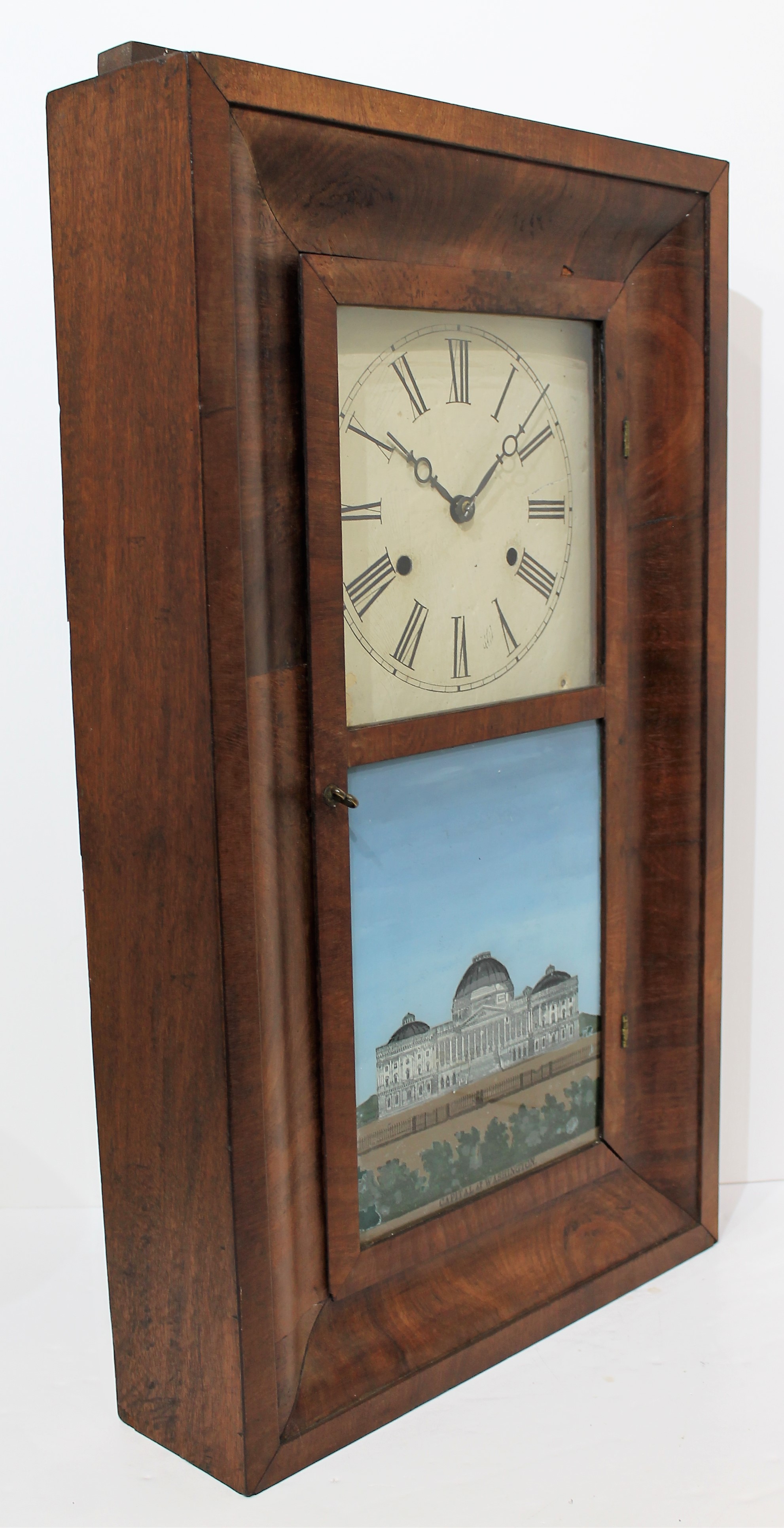 made after Jerome moved his operation to New Haven in 1845. The 26-inch case, veneered in flame mahogany with a worn finish,