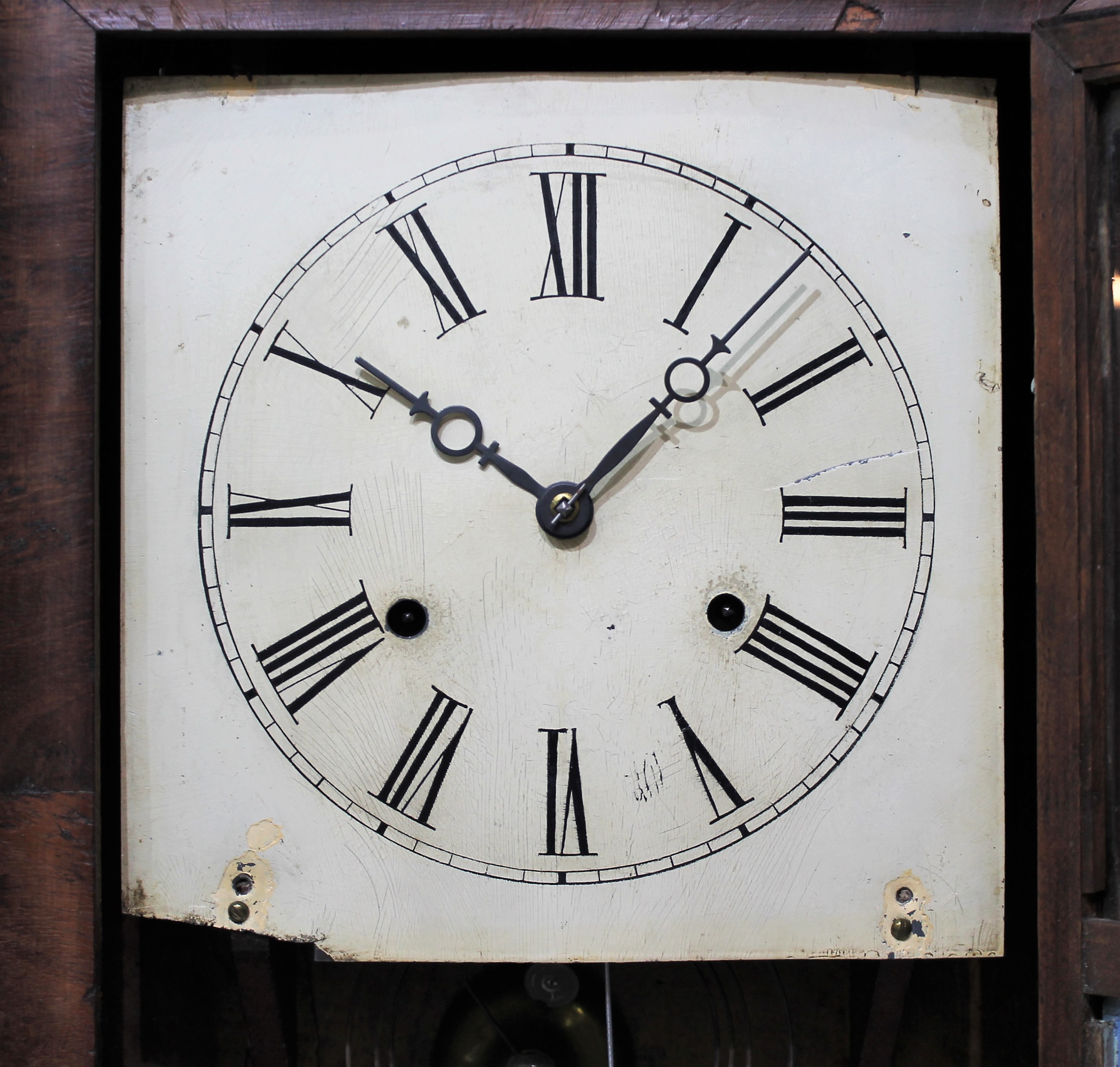 paint, with some inpainting. The hands are proper. The 30-hour time-and-strike brass movement is unsigned but looks like