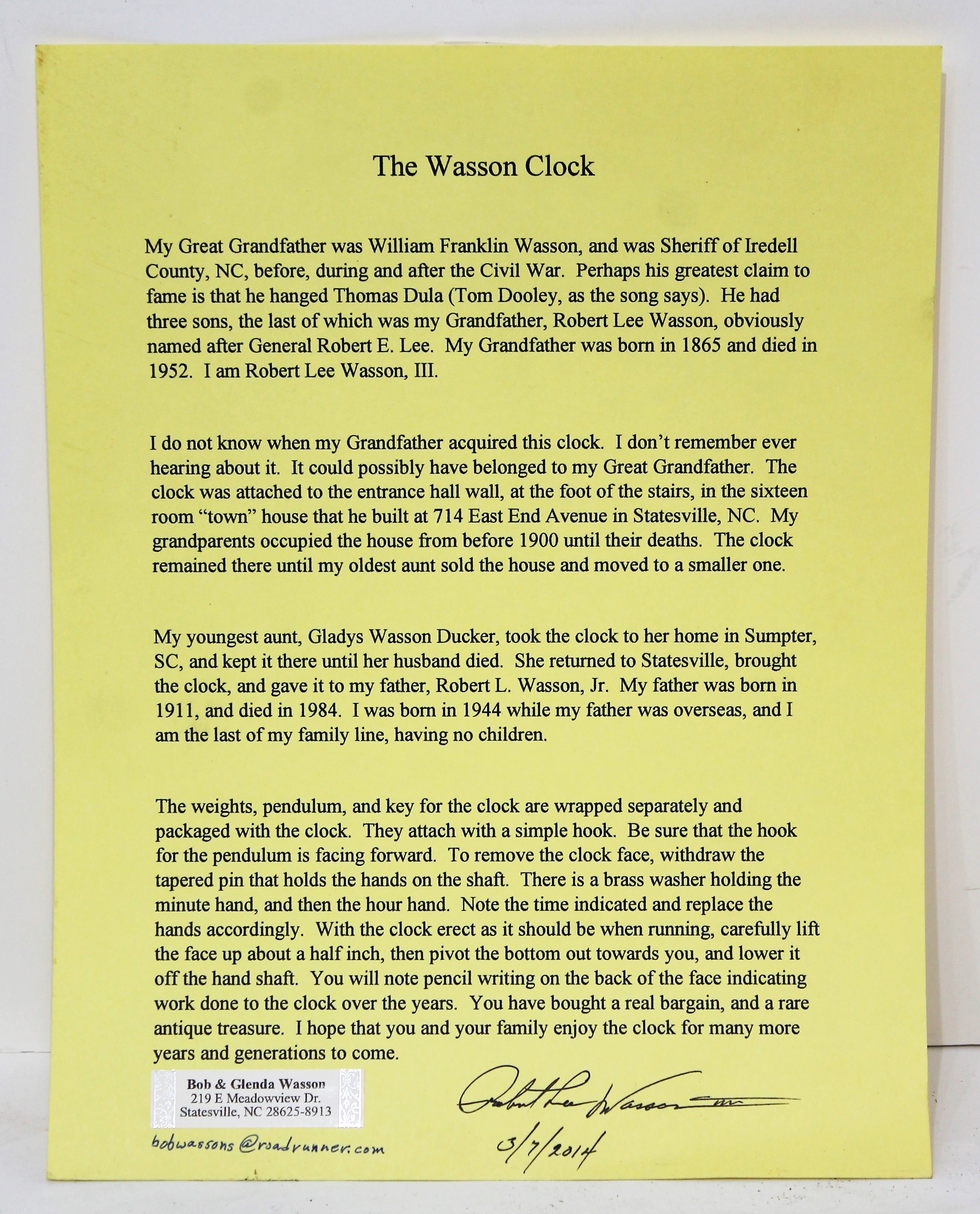 and a period pendulum bob. A good label inside, and a letter describing the provenance of this clock. “Hang down your