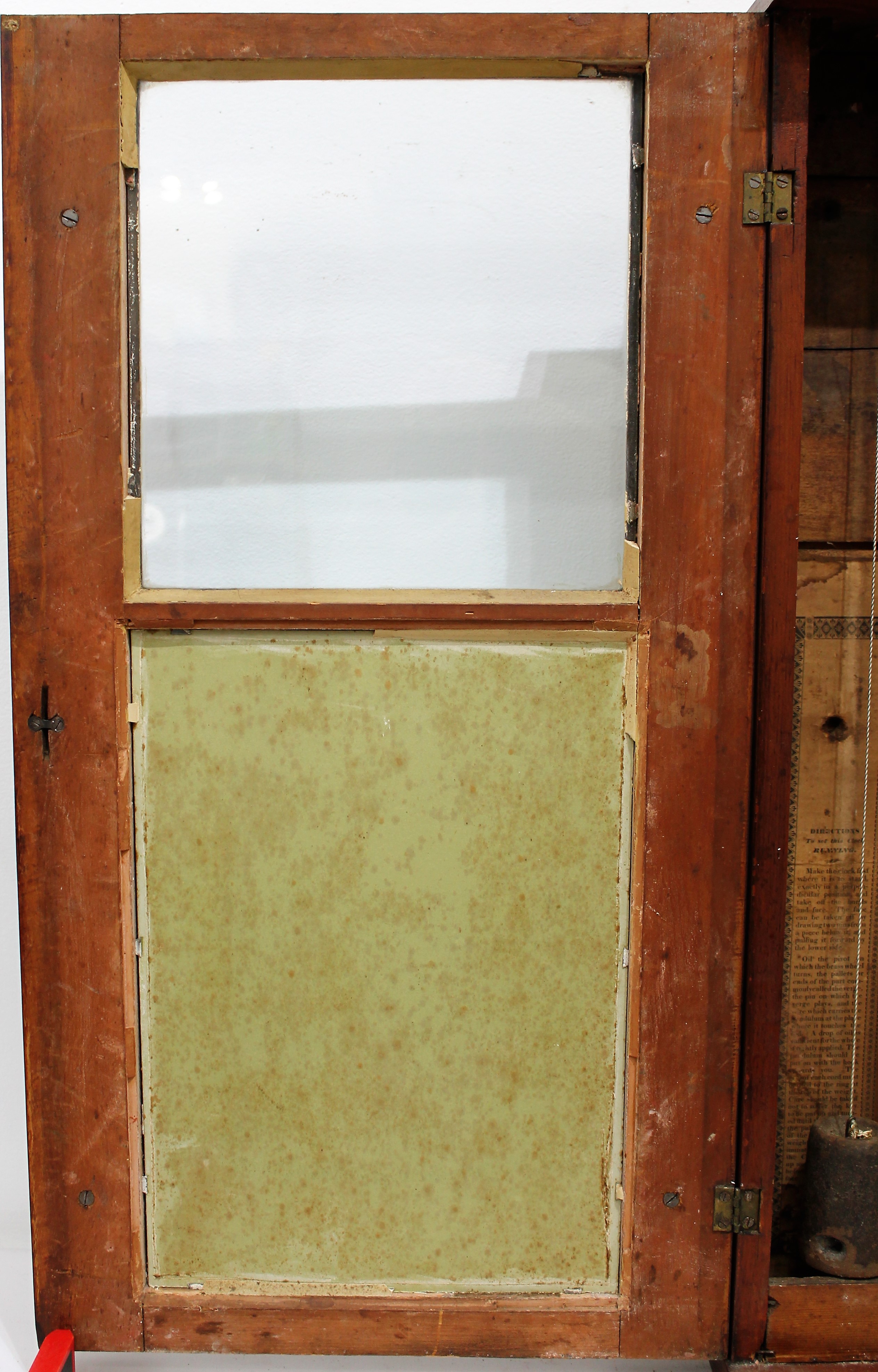 right winding port. The 30-hour, time-and-strike wooden movement will strike but runs only for a minute or so, with period weights