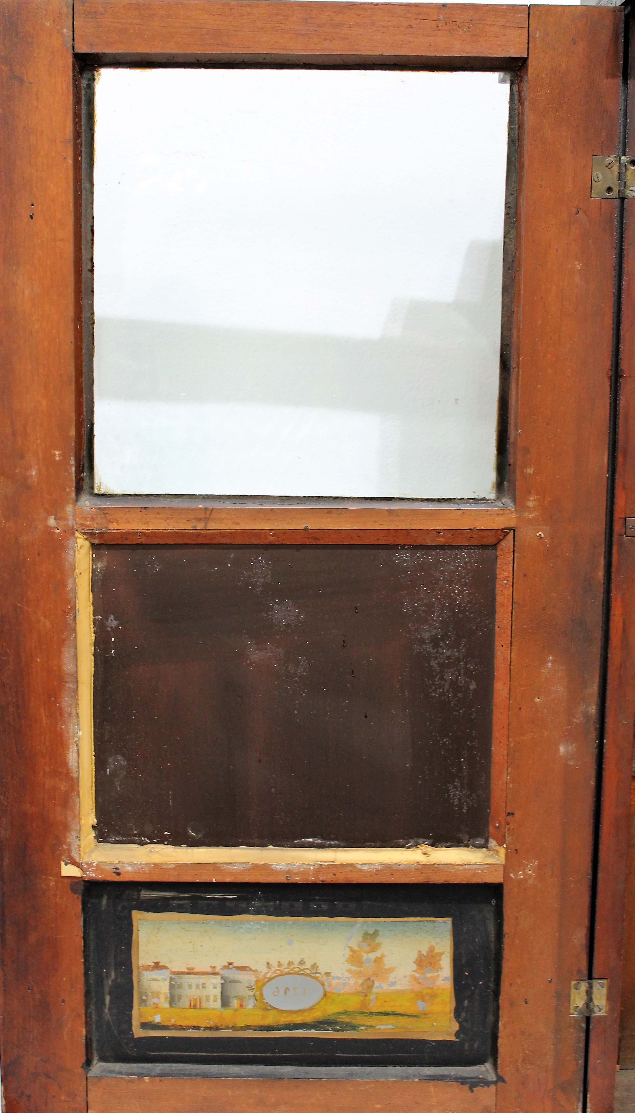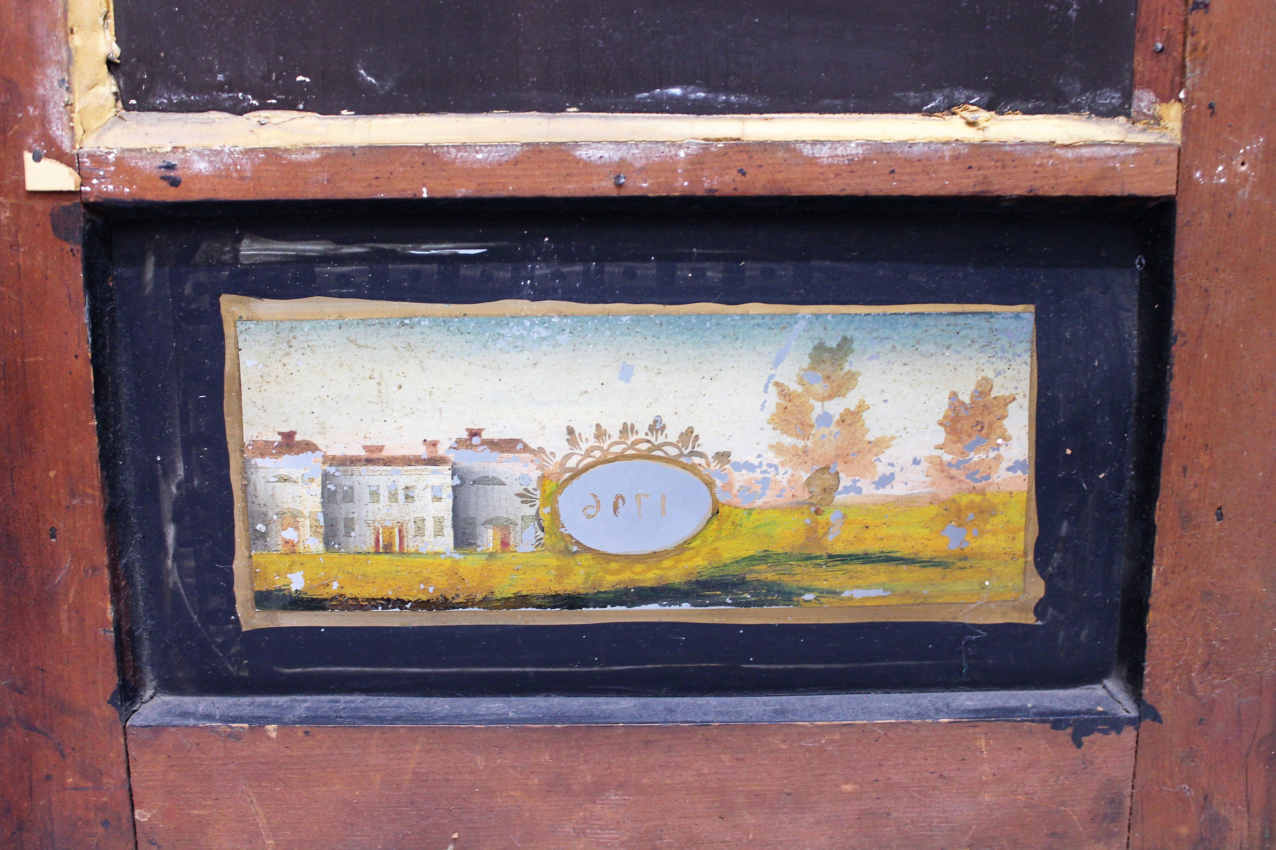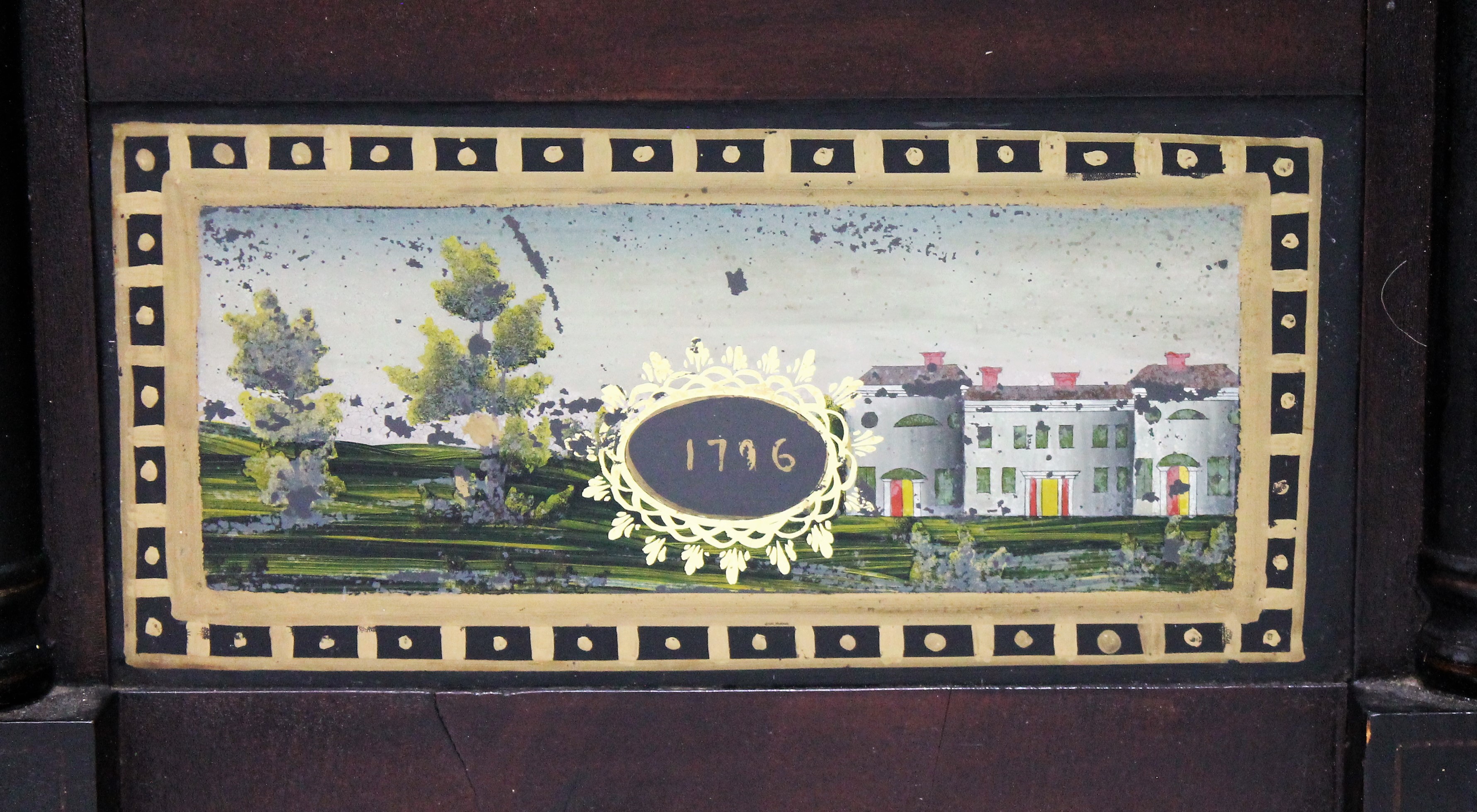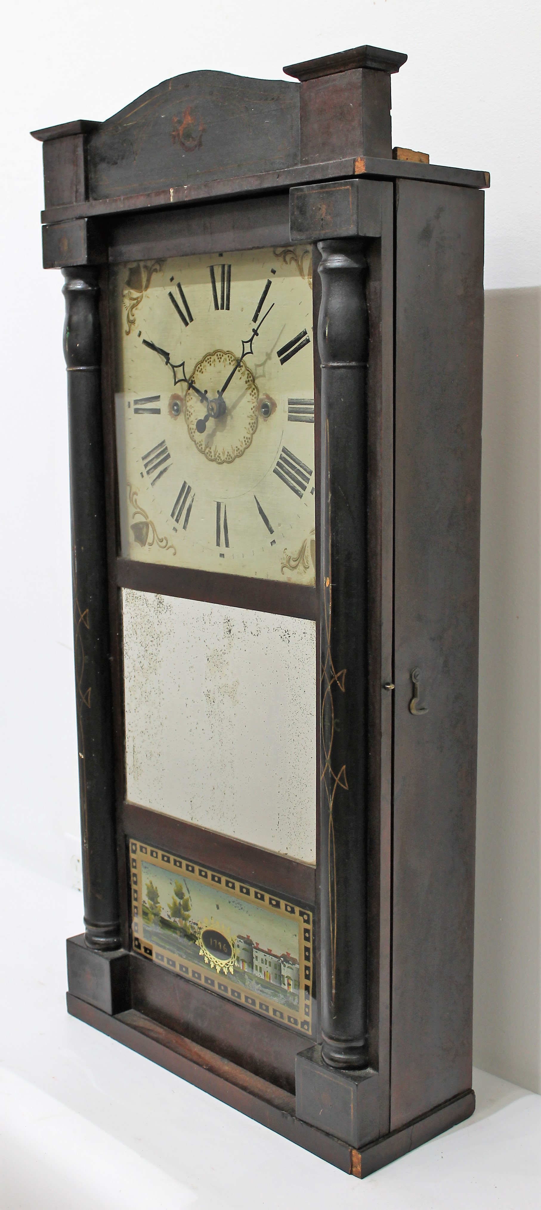 Unknown maker 30-hour shelf clock, ca. 1830. Too much of the label is gone here for me to determine a maker, perhaps you can? If so, let me know! The case is 35 inches tall over a very dark mahogany veneer finish. The half-columns and splat look original to me, with unusual stenciling. All three glasses are original, with some reglazing and rebacking of the small but original tablet in the bottom glass. The wooden dial is reasonably clean but faded; the hands are appropriate. The 30-hour time-and-strike wooden groaner movement was untested as the weight cables are missing (and there is no bob); this clock does not come with weights, but groaner weights can be purchased in Parts (#605). This clock falls in that gray area of “part it out/save it”. You decide. $50-$150.