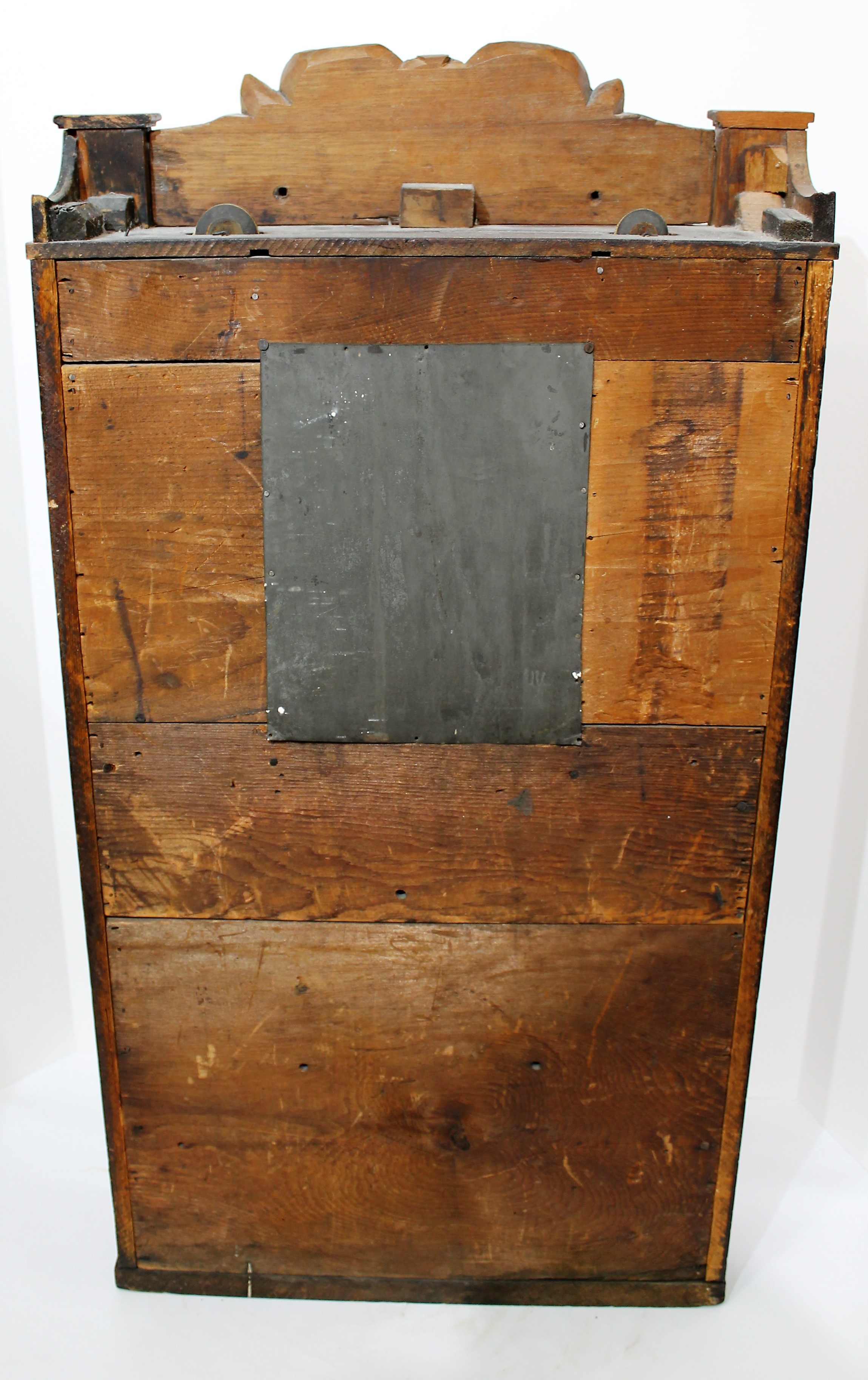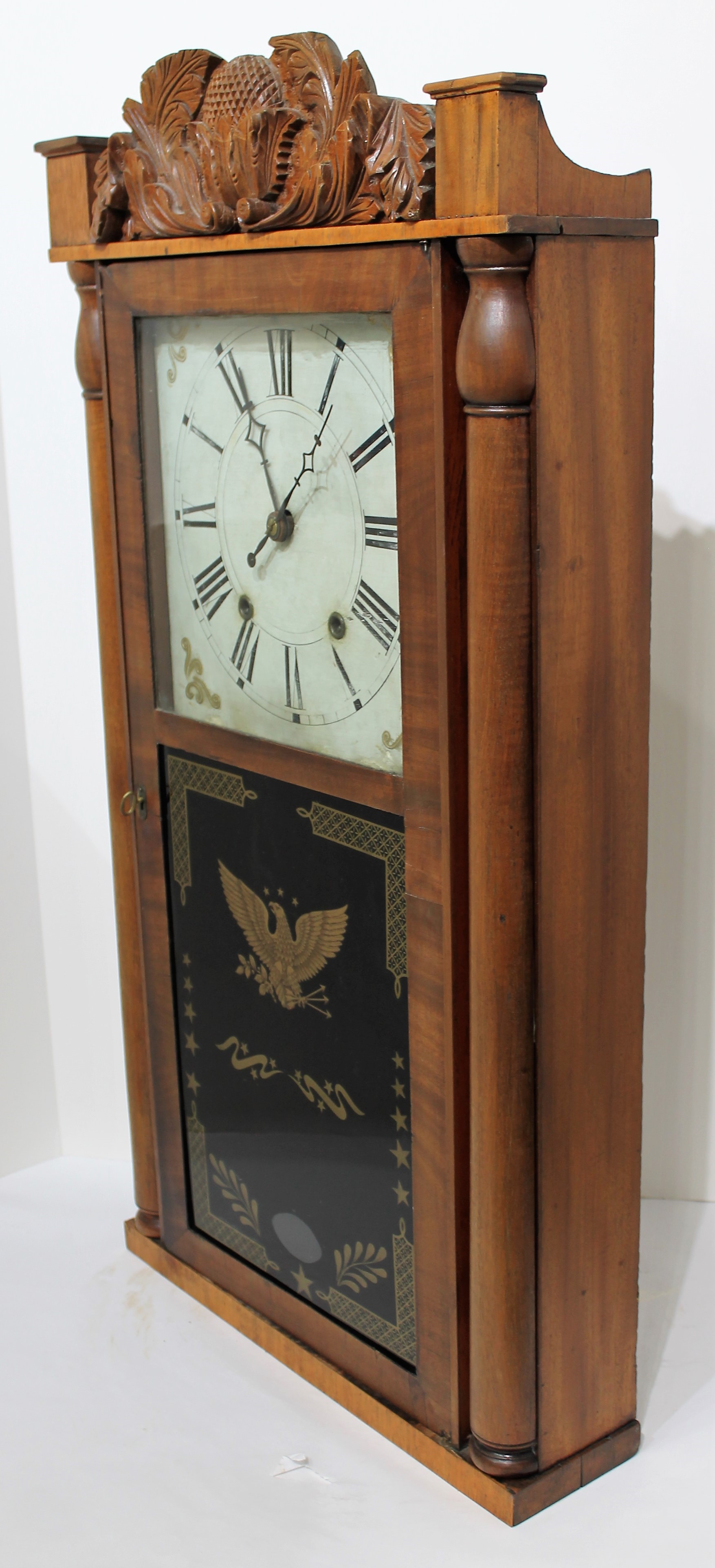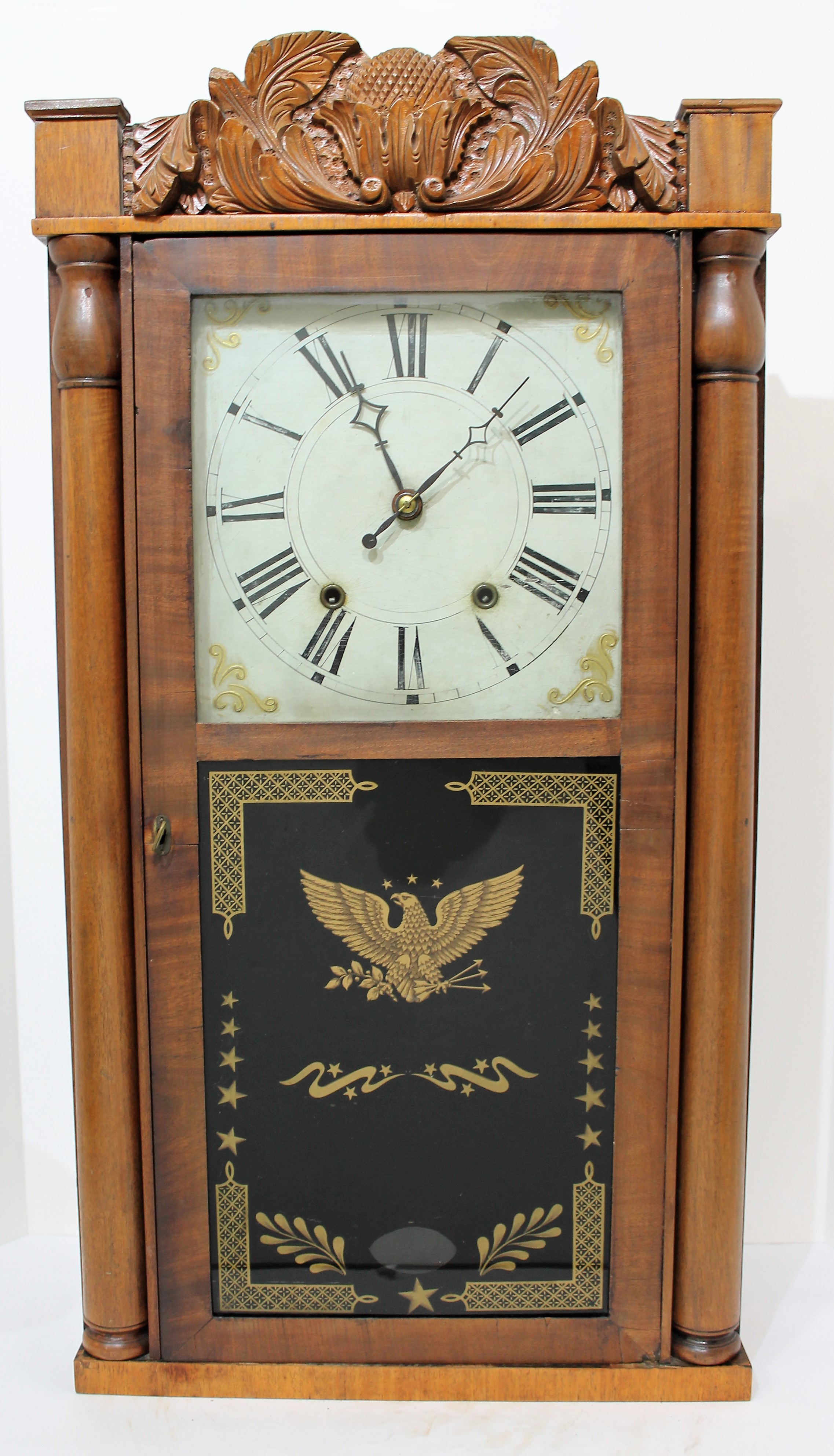 Eli Terry, Jr. & Co. Thirty-hour shelf clock, 1835-1841. A 32-inch case veneered in mahogany and refinished to blandness. The splat is outstanding, the dial glass is old and possibly