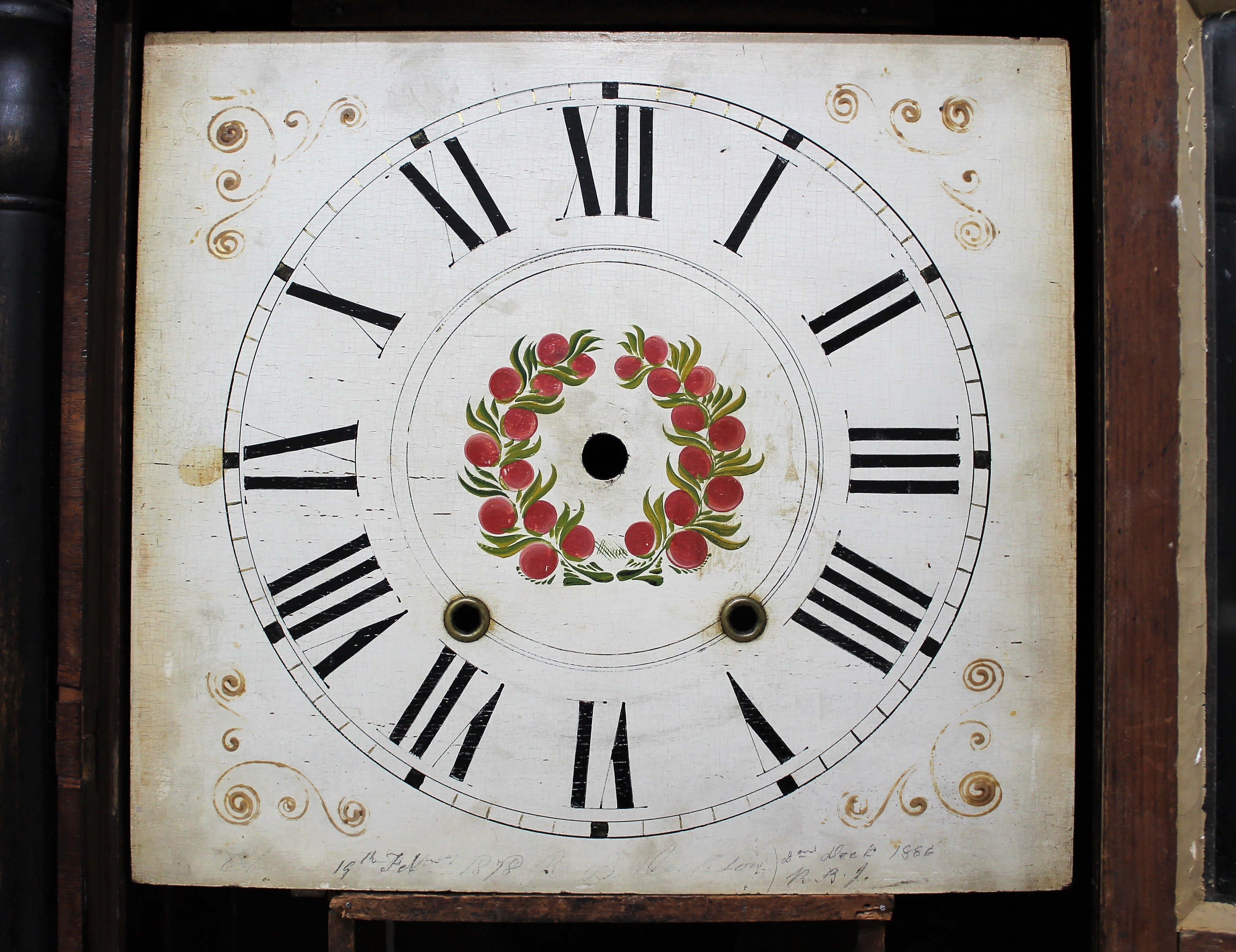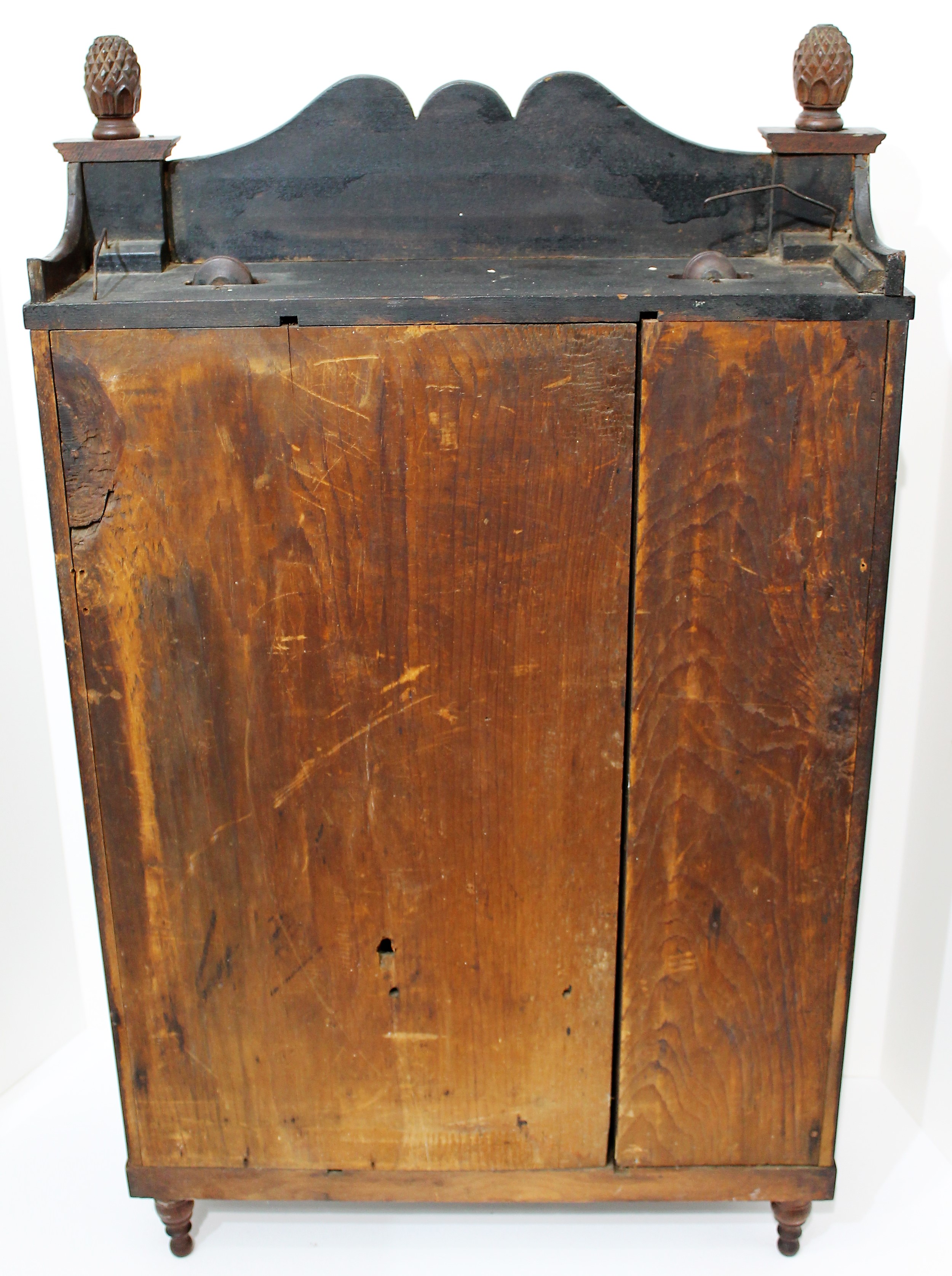 29.5-inch case with the original carved pineapple finials and stenciled splat. The columns seem to have been painted black and