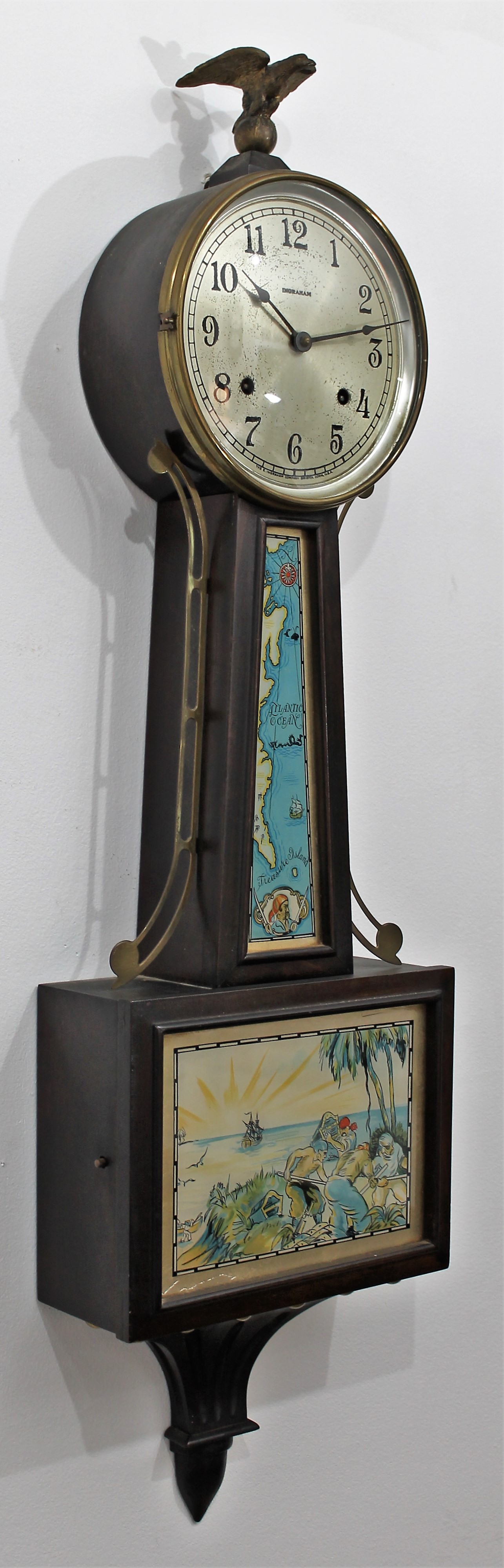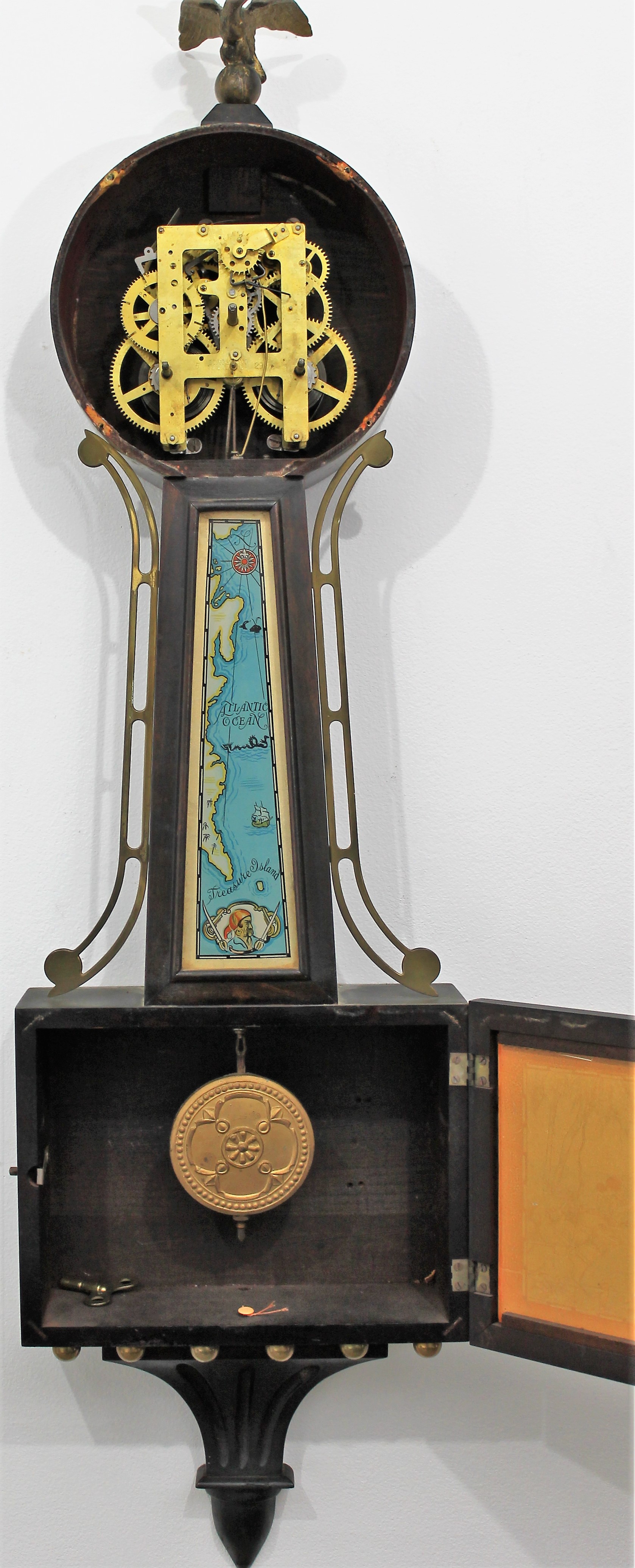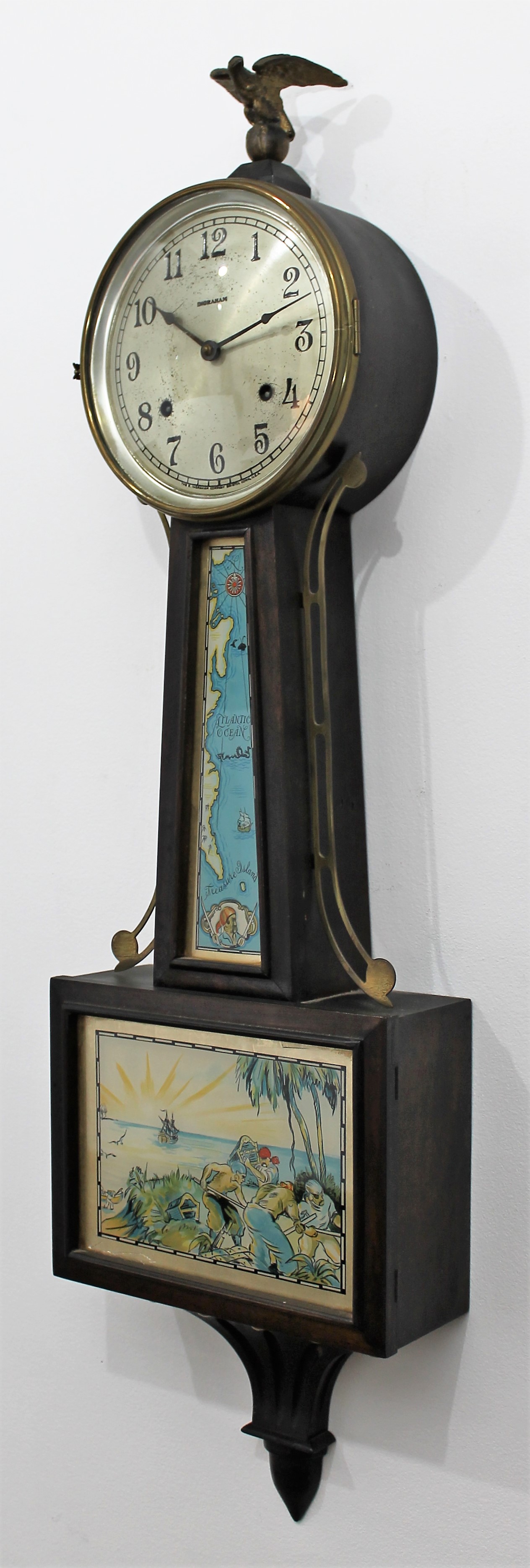 E. Ingraham Co. “Treasure”, ca. 1934. A 39-inch clock in solid mahogany with decal images on the throat and lower glass depicting Treasure Island, or to our younger viewers,