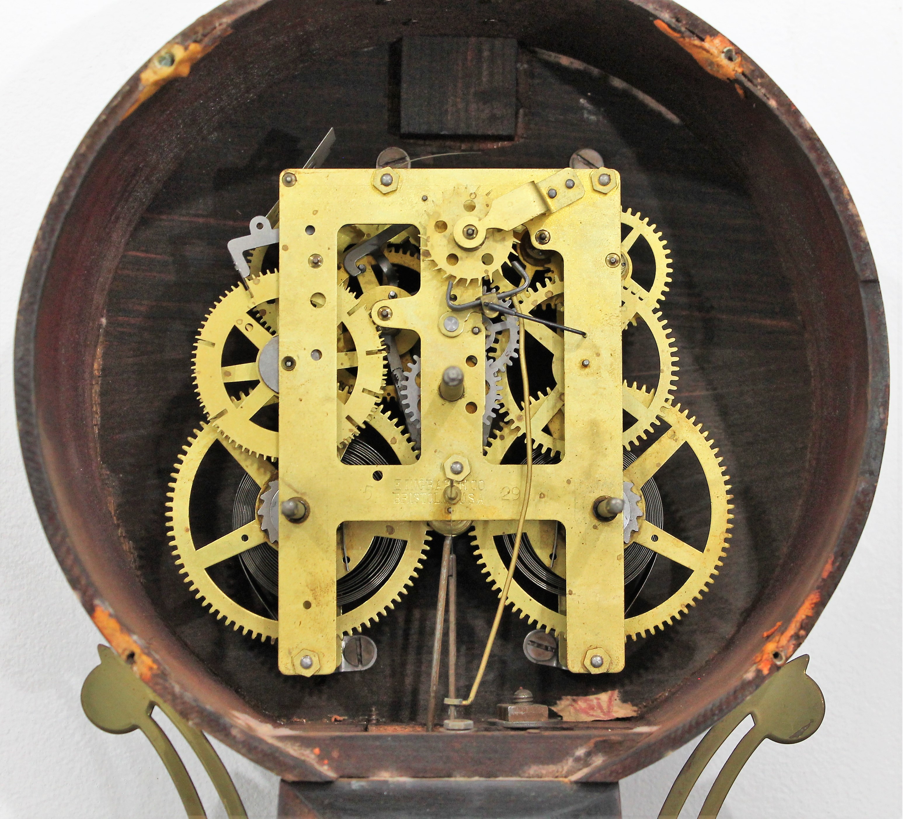 in the throat. A large detachable pendulum bob, no label inside or on the back. Solid brass side arms and solid brass
