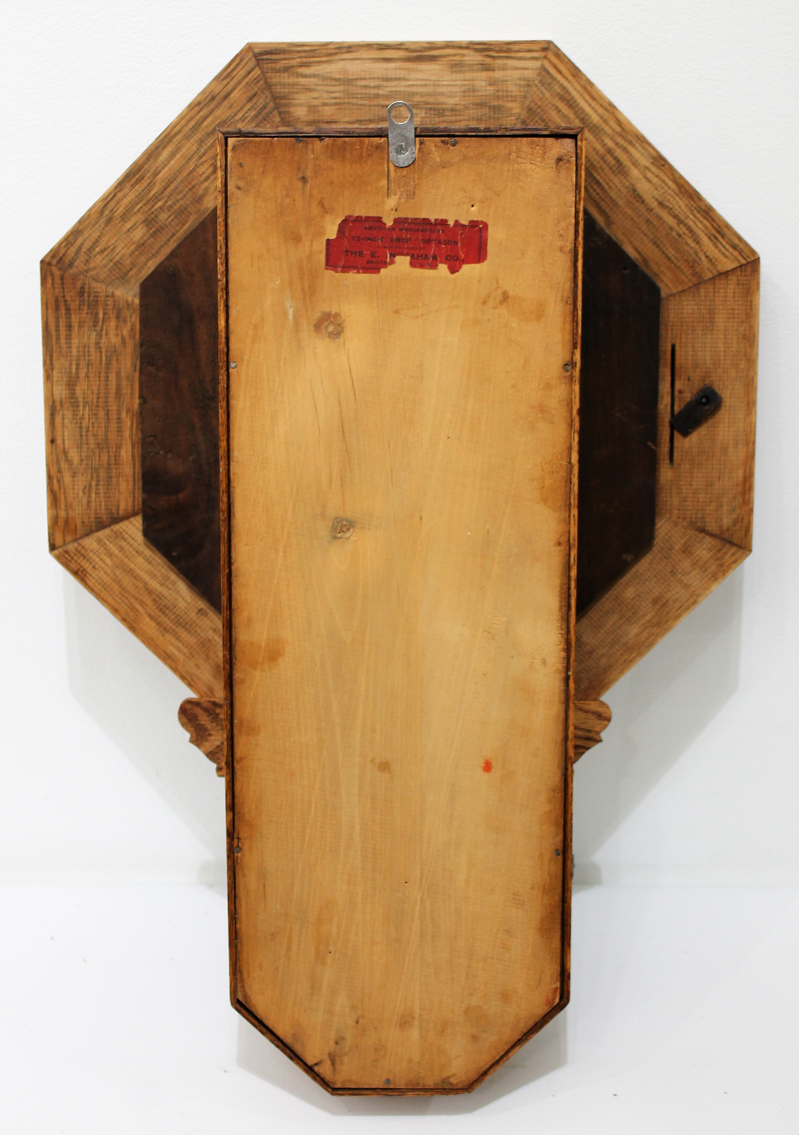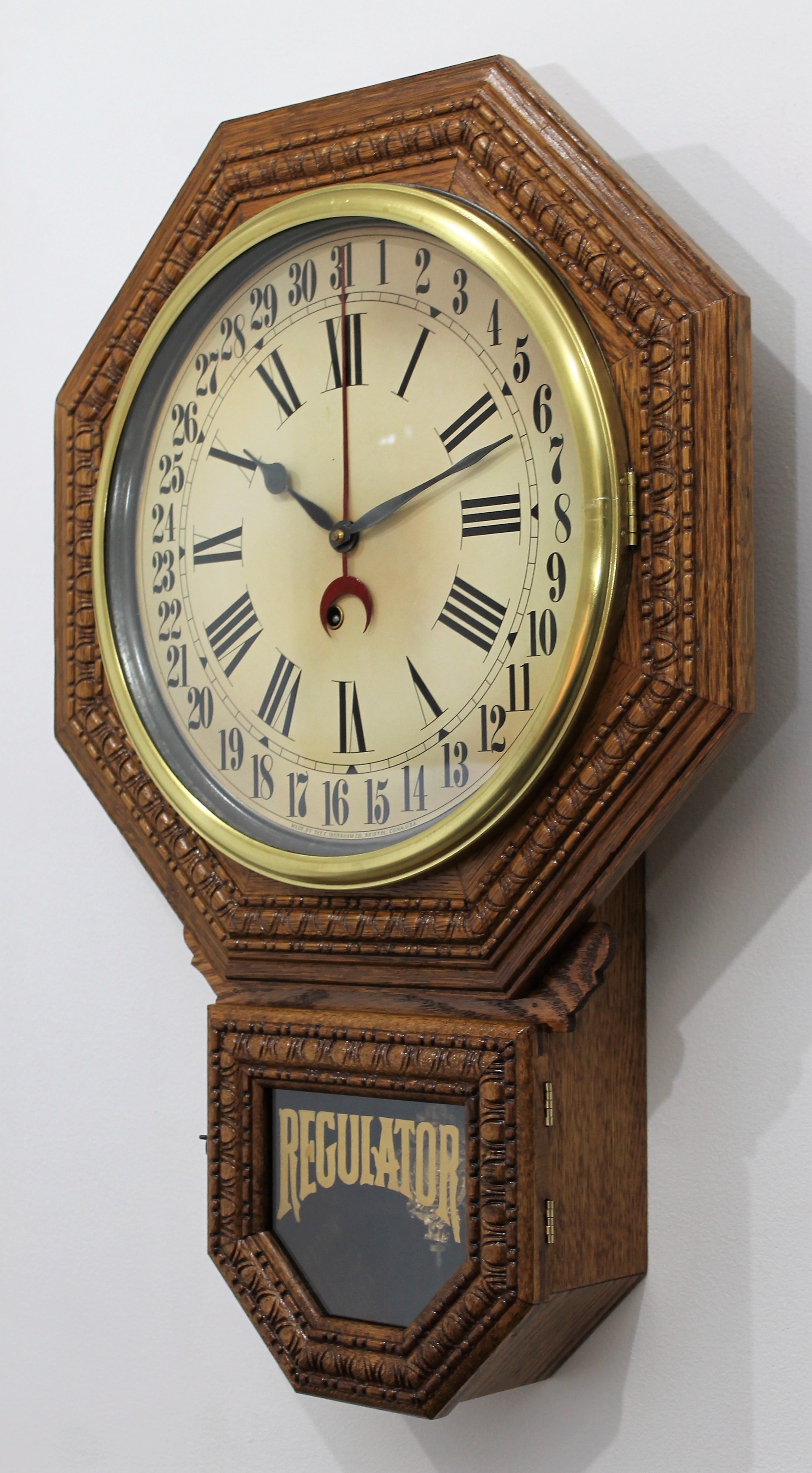 E. Ingraham “Drop Octagon” calendar, ca. 1915. The 25-inch oak case has been nicely refinished; the dial glass is old in a modern brass bezel, and the 12-inch dial is old paper,