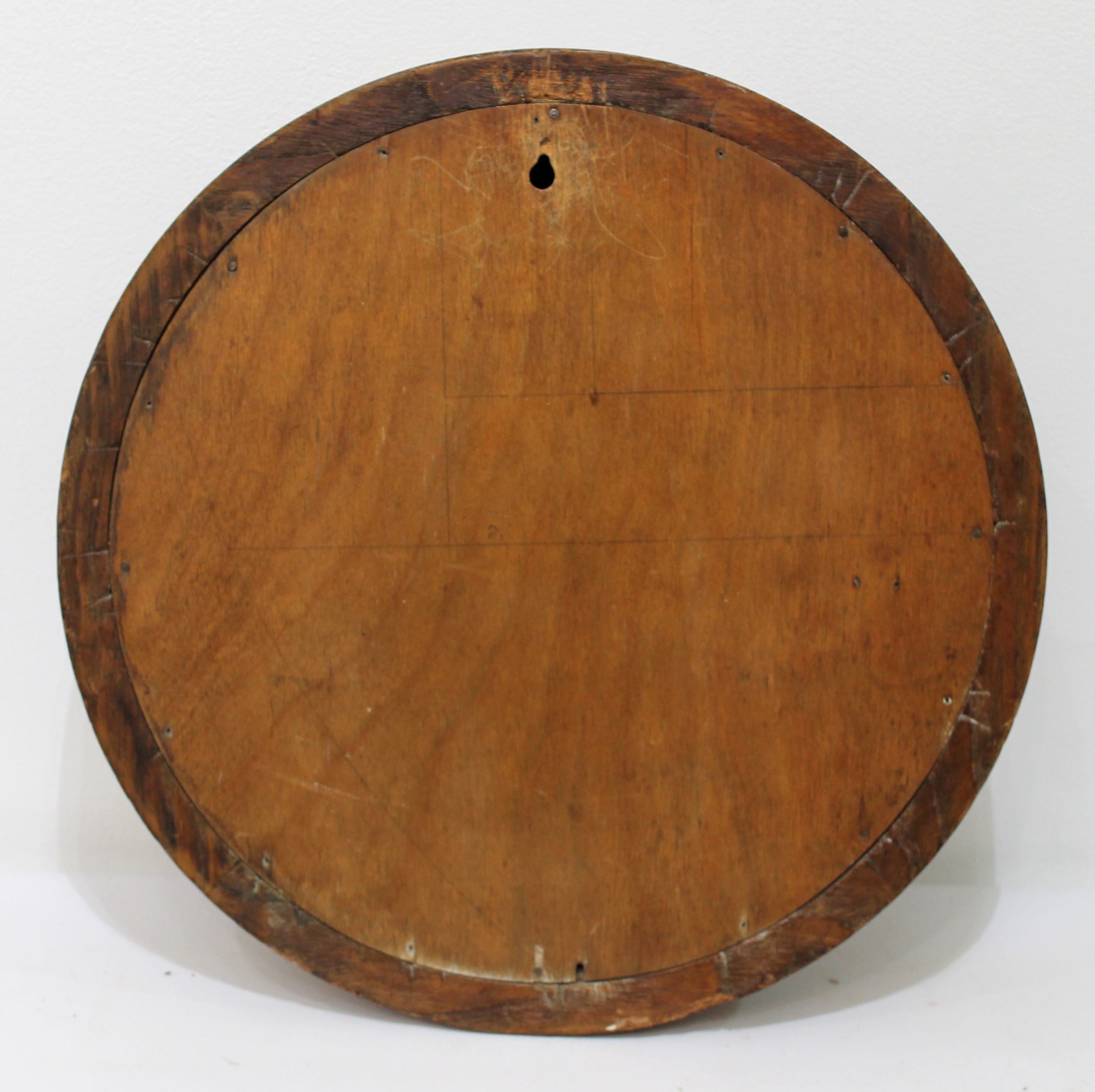 oak case with a 12-inch dial. The dial glass is old, the signed, painted dial chipped up and with some stains. The hands
