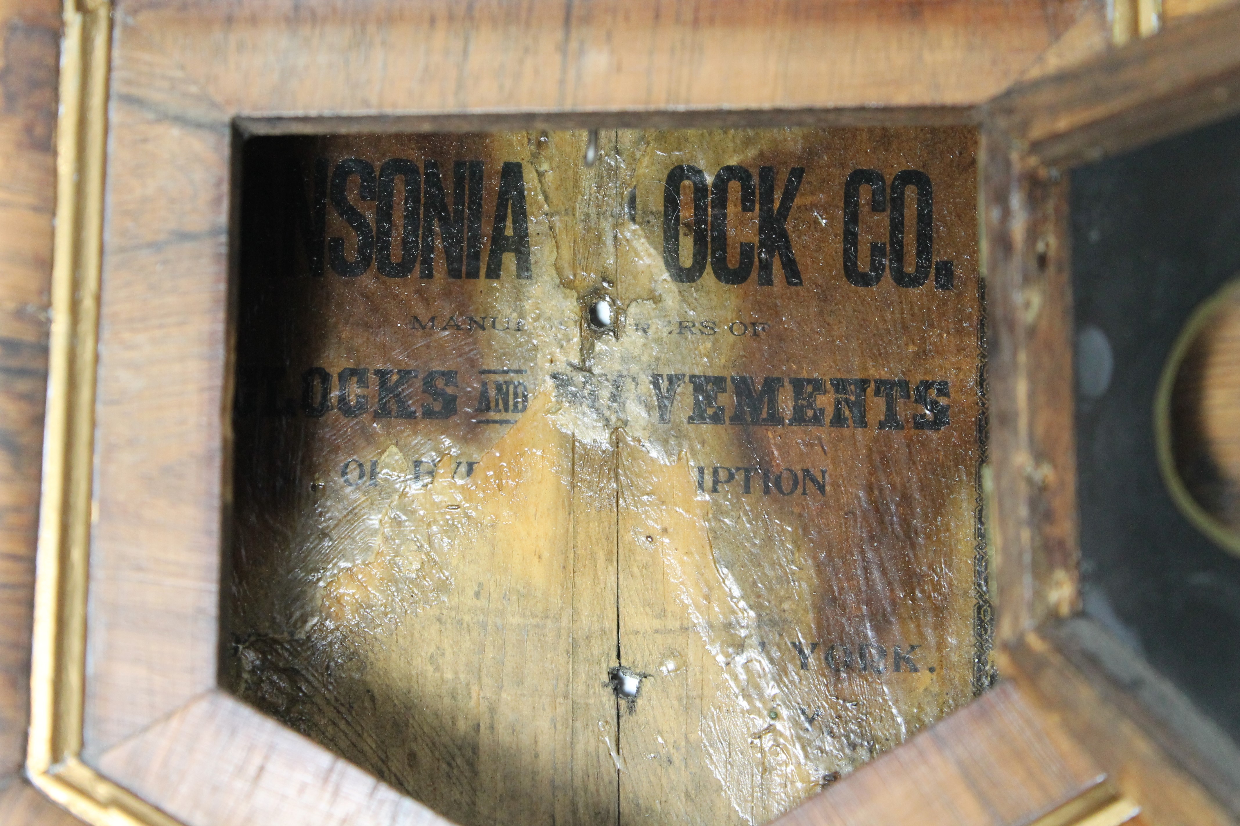 and likely original. The 10-inch dial is paper in reasonable condition for its age, signed at the bottom and the Ansonia logo. The 8-day, time-only movement is running without hesitation; note how it was mounted at an angle to avoid interference between the
