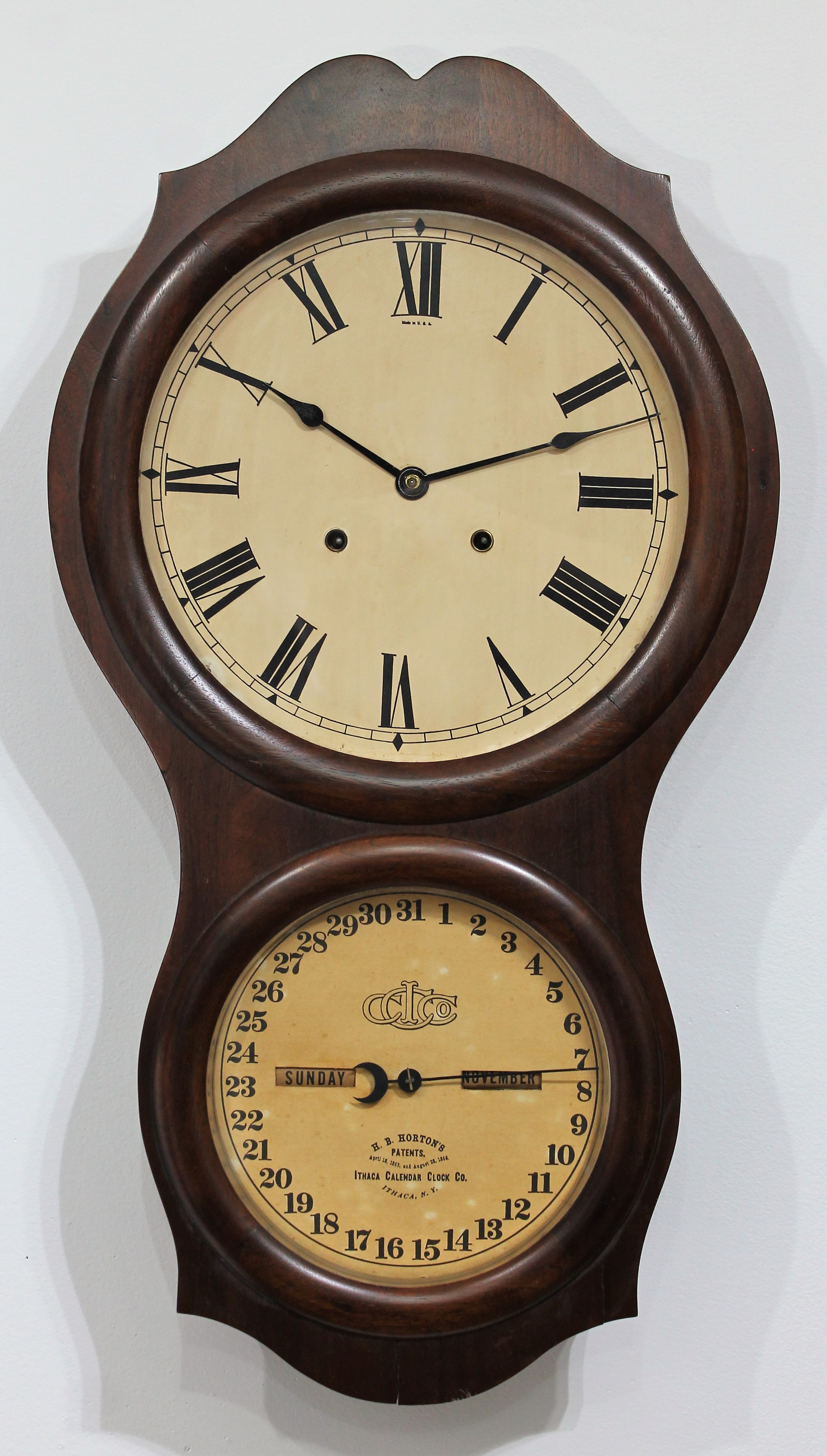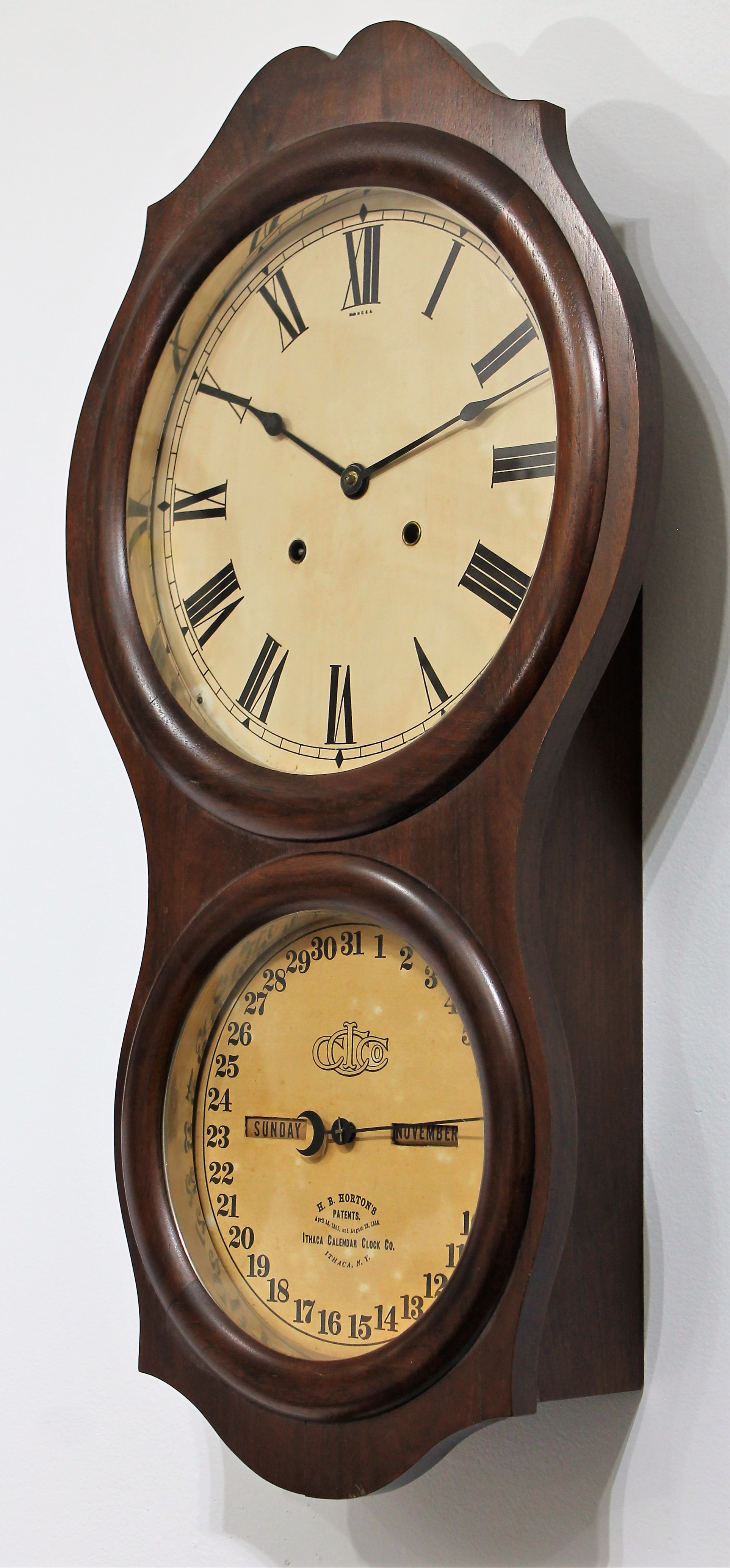 Ithaca Calendar Clock Co. “No. 4 Office”, 1869-1918. This was a reliable seller for ICCC, with simple design and good readability. The walnut case is 28.5-inches long with a 12-inch