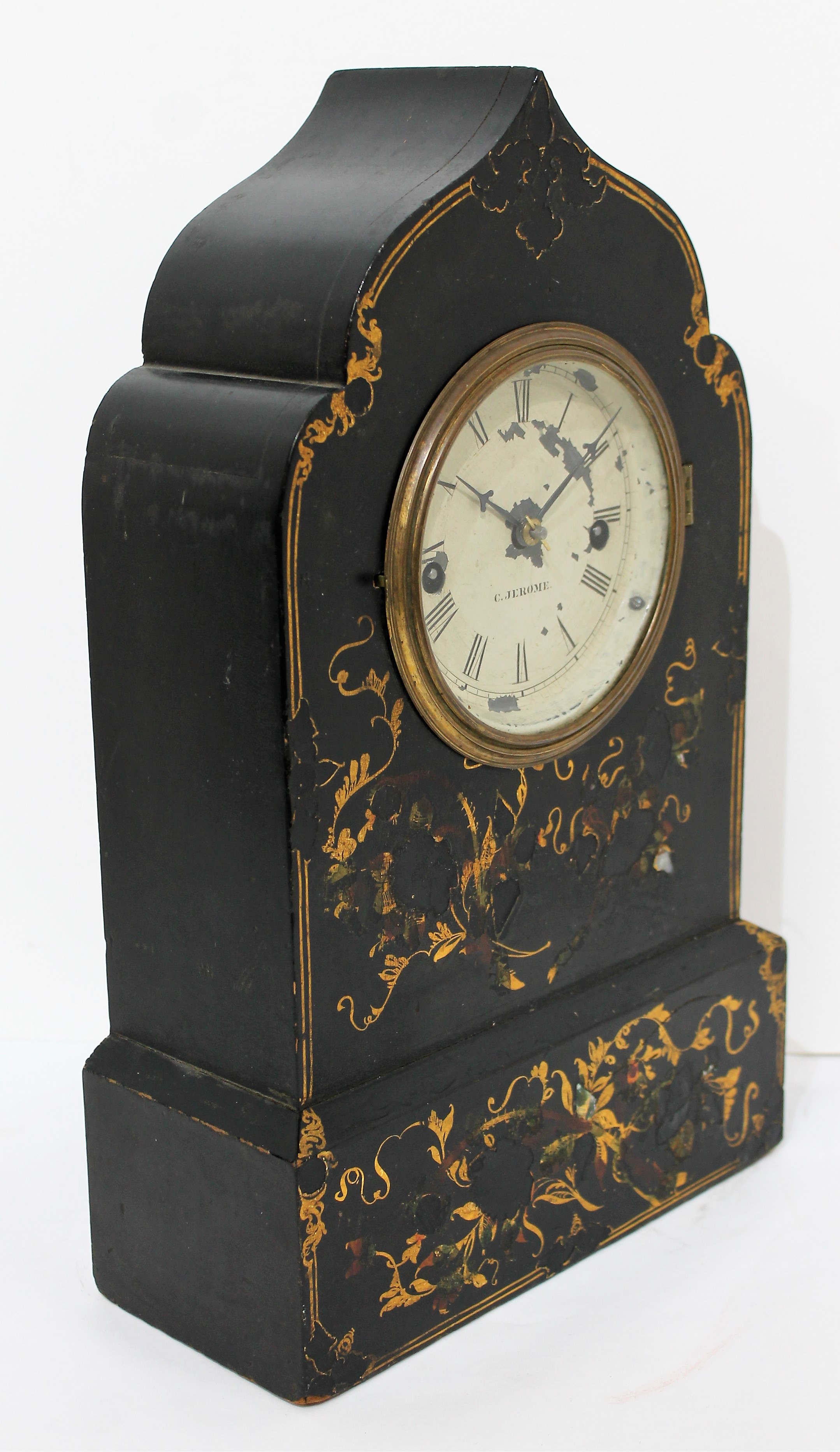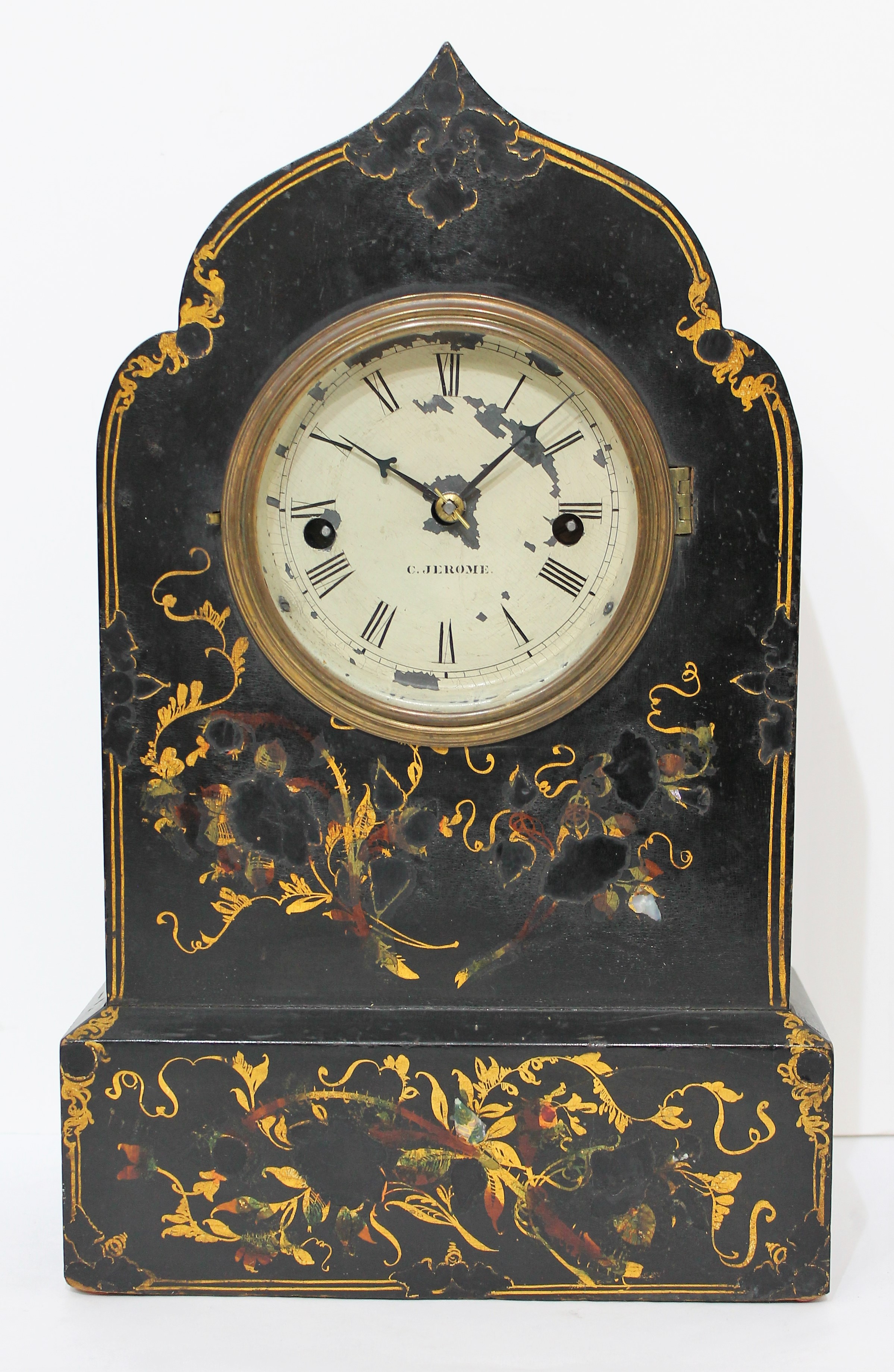Chauncey Jerome paper mâché MOP fusee shelf clock, 1845-1855. A 15-inch paper mâché over wood case with gilt decorations, flowers, and mother of pearl (MOP) on the front. Most of the MOP