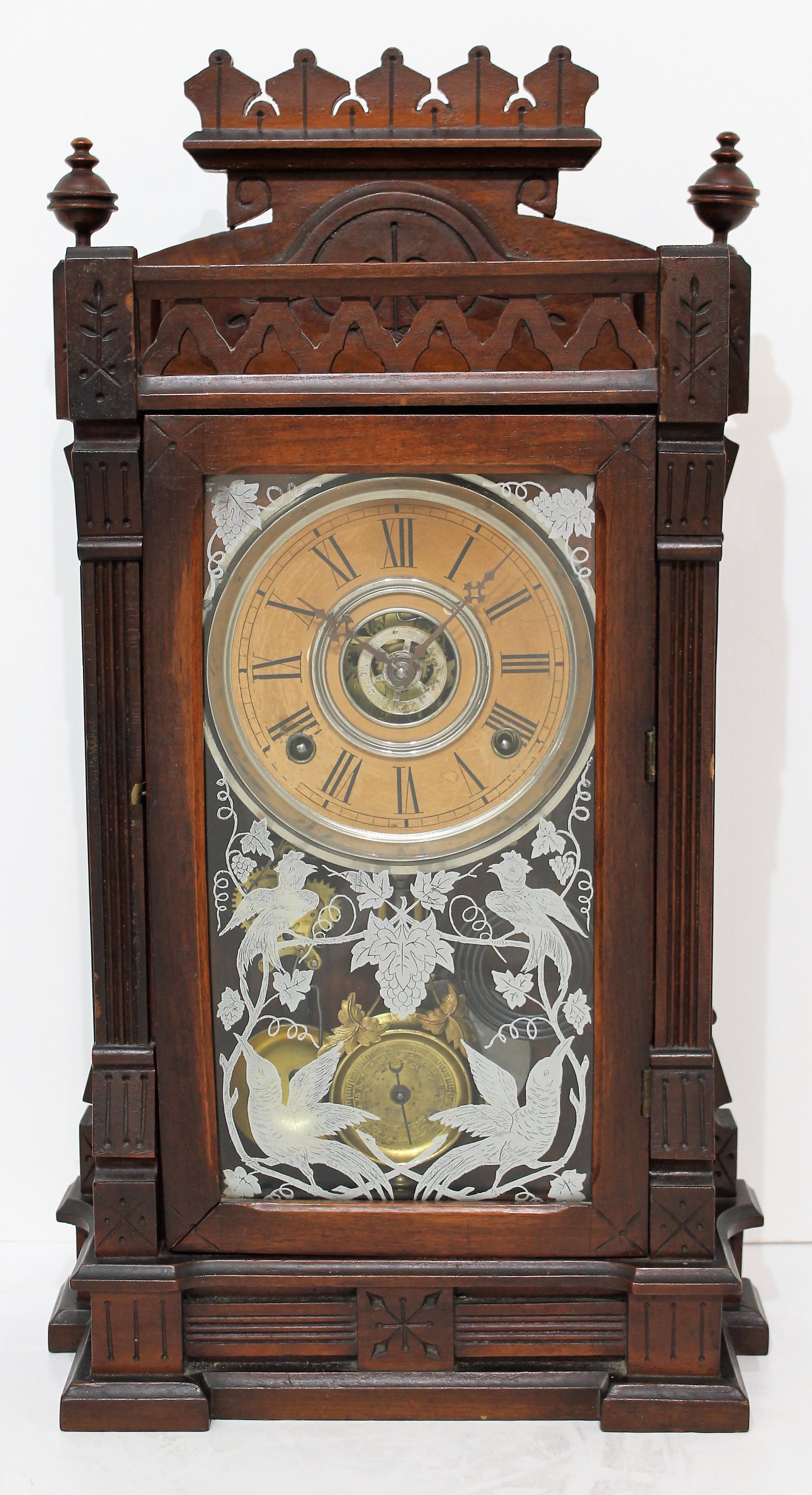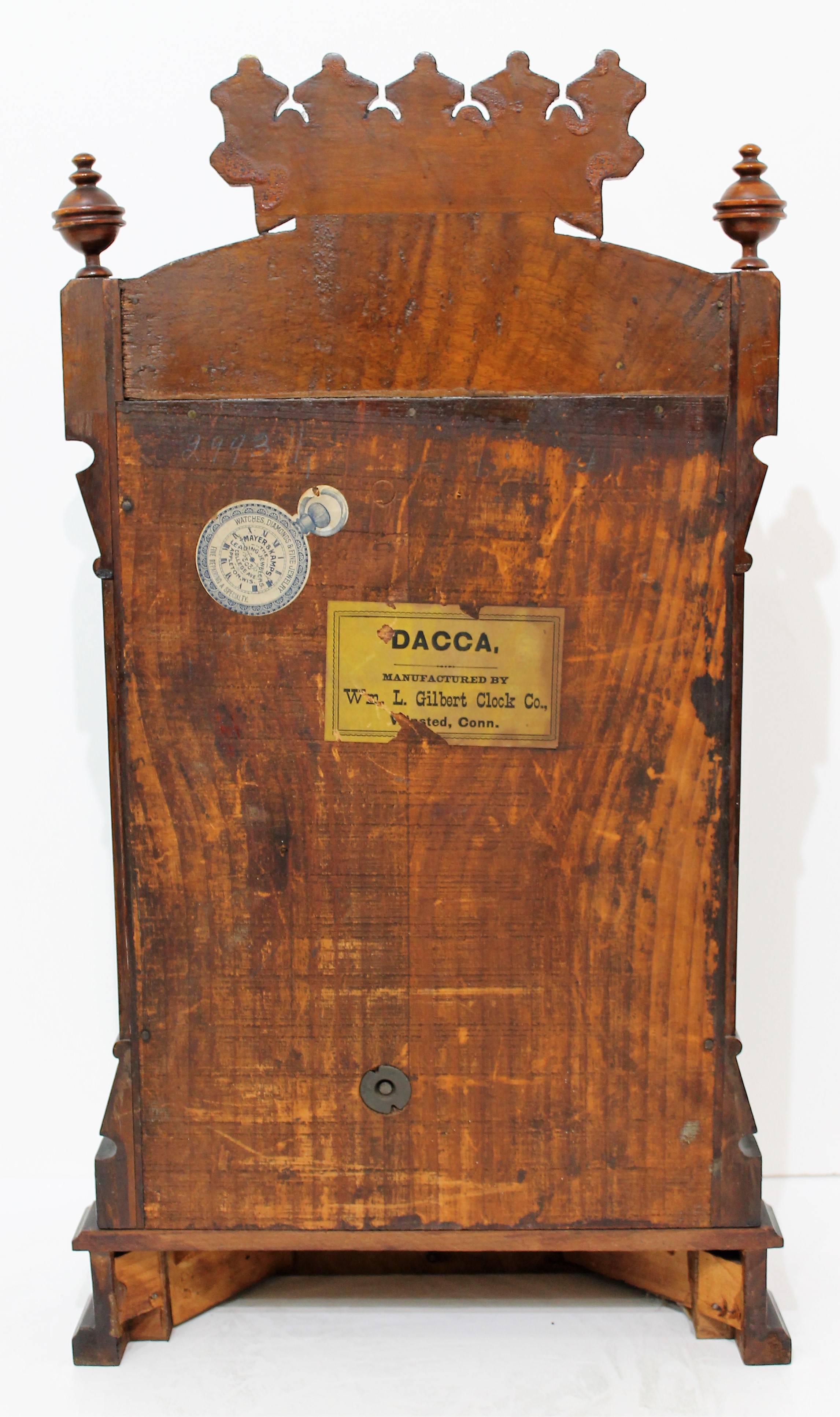 Wm. Gilbert Clock Co. “Dacca”, ca. 1885. A 21.25-inch walnut case with an old/original finish and lots of patina. It is missing the two front-corner finials. The