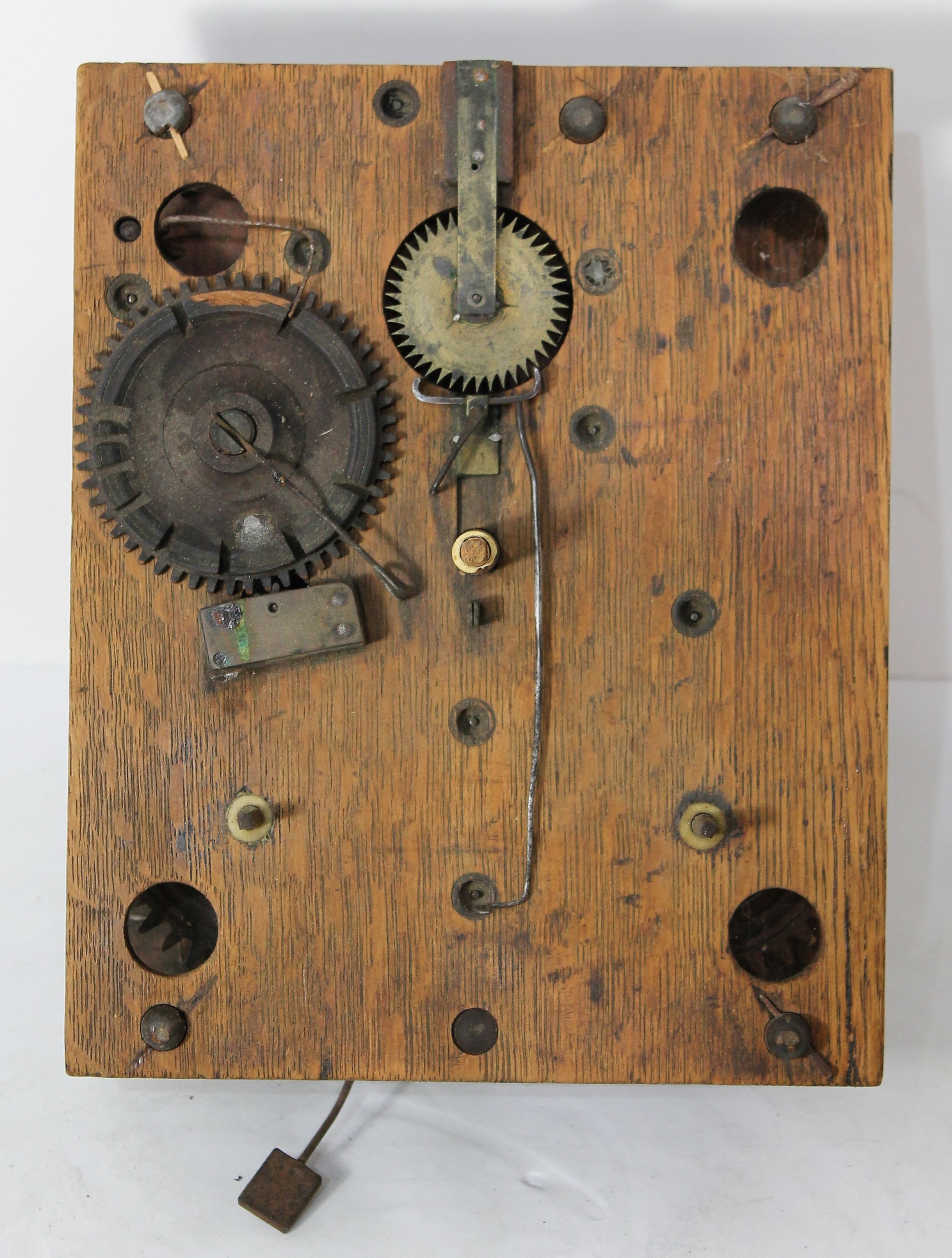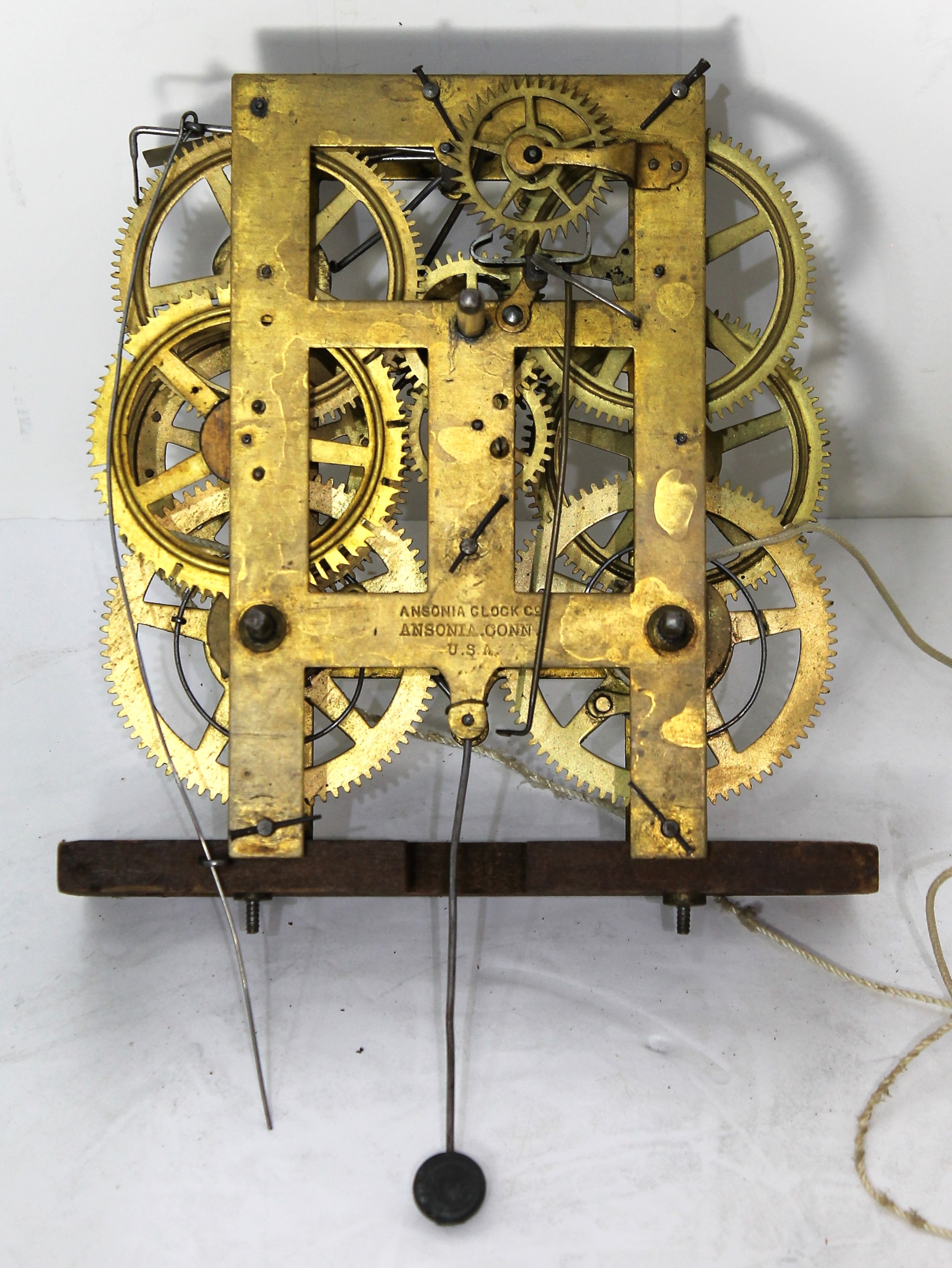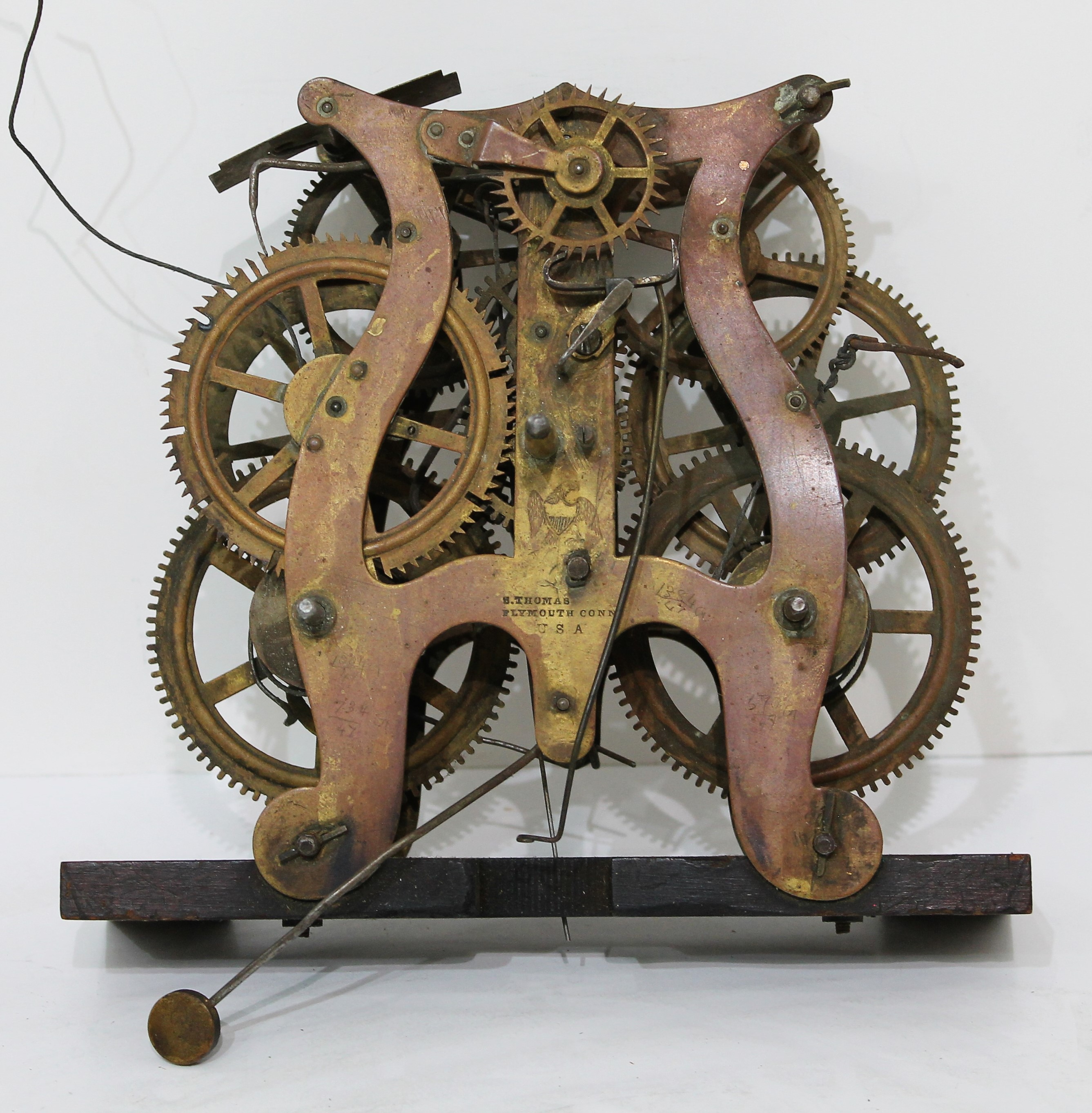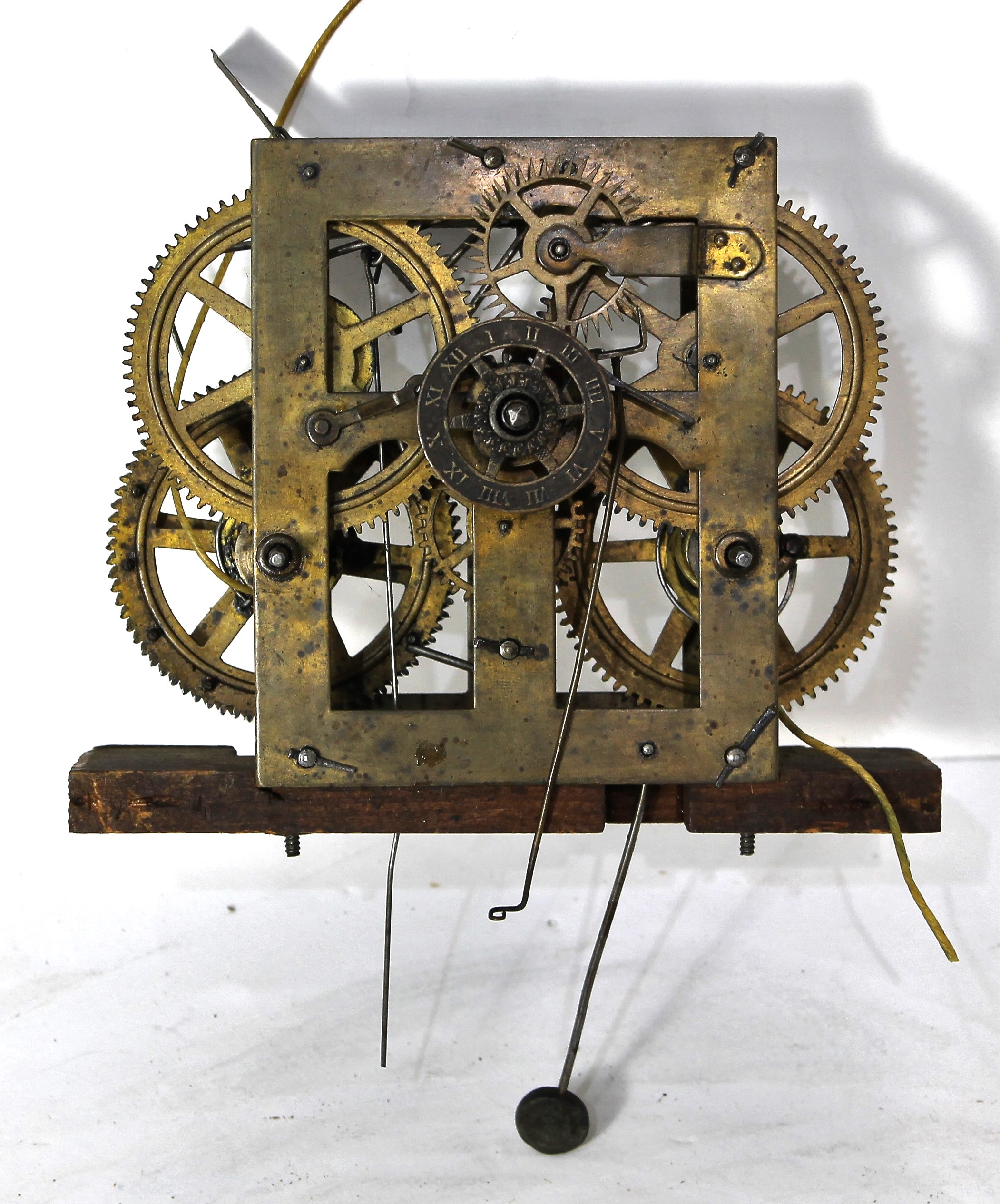 time-and-strike brass movement. Movement is signed and is mounted to a large wooden block. It calls for a 13-inch pendulum