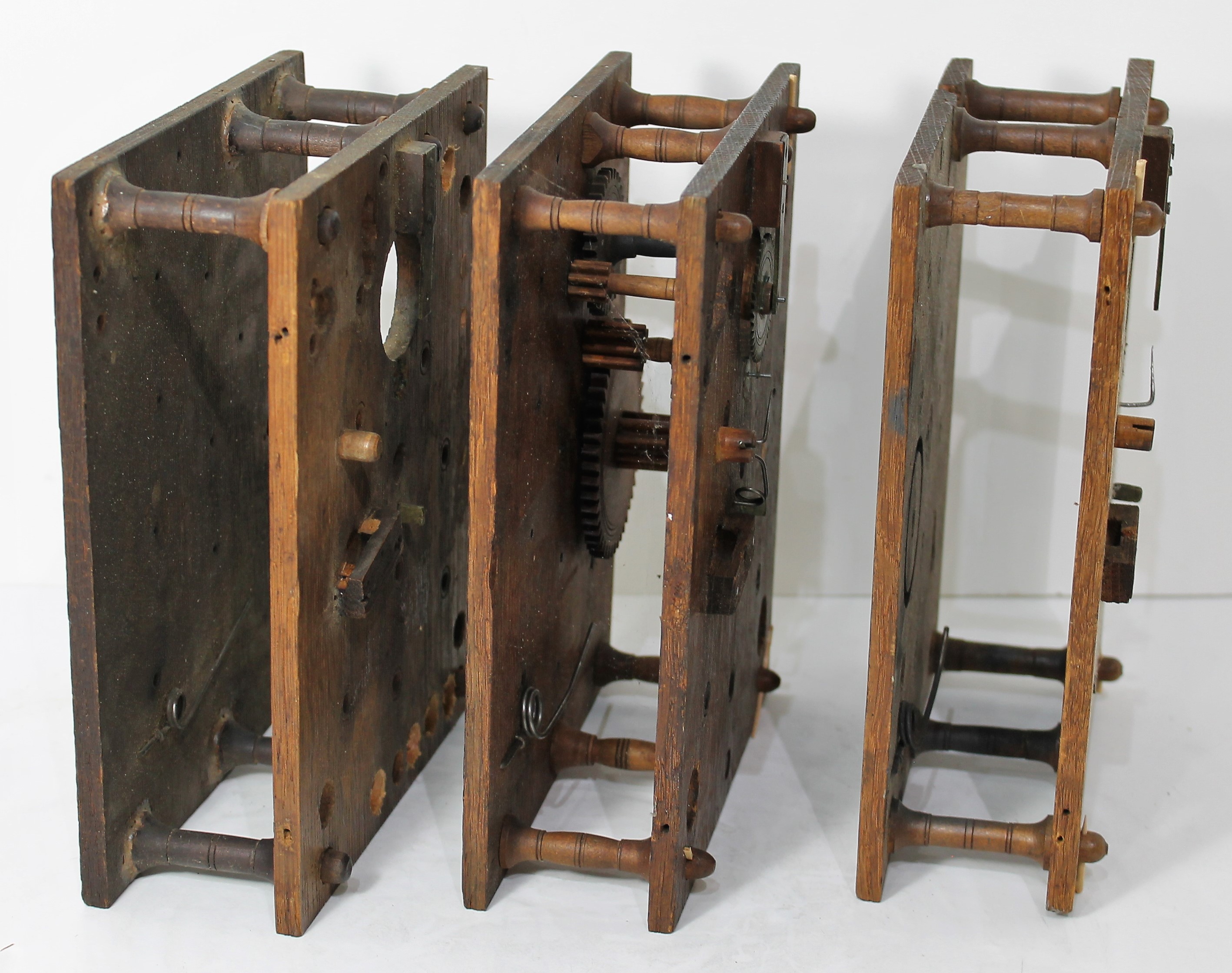 Three wooden movement plates. One has a couple of gears remaining. $25-$50.