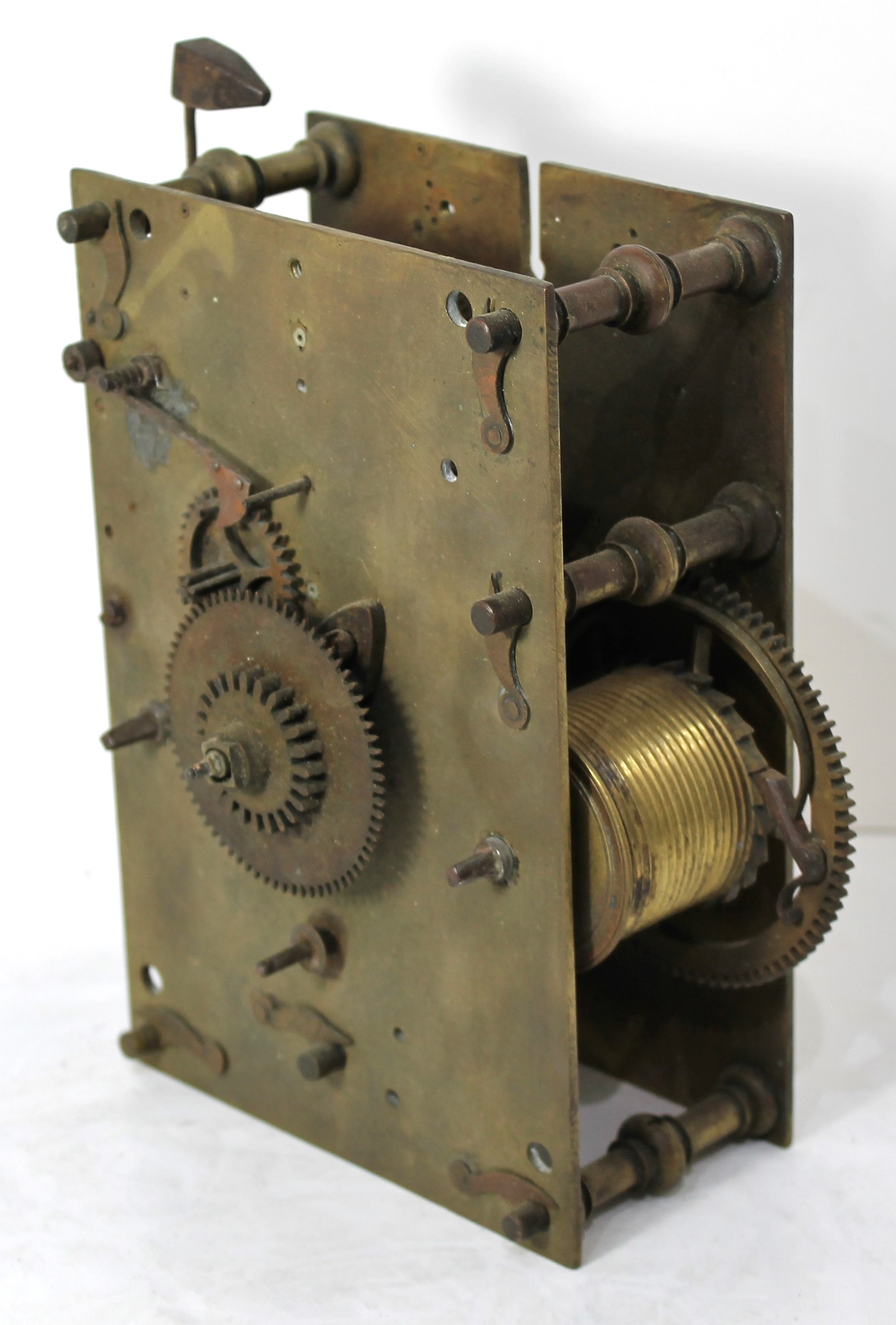 Early Joseph Ives strap brass movement. Weight driven, 8-day, time-and-strike movement with one pewter winding drum (on the strike side) and one replaced drum. Not