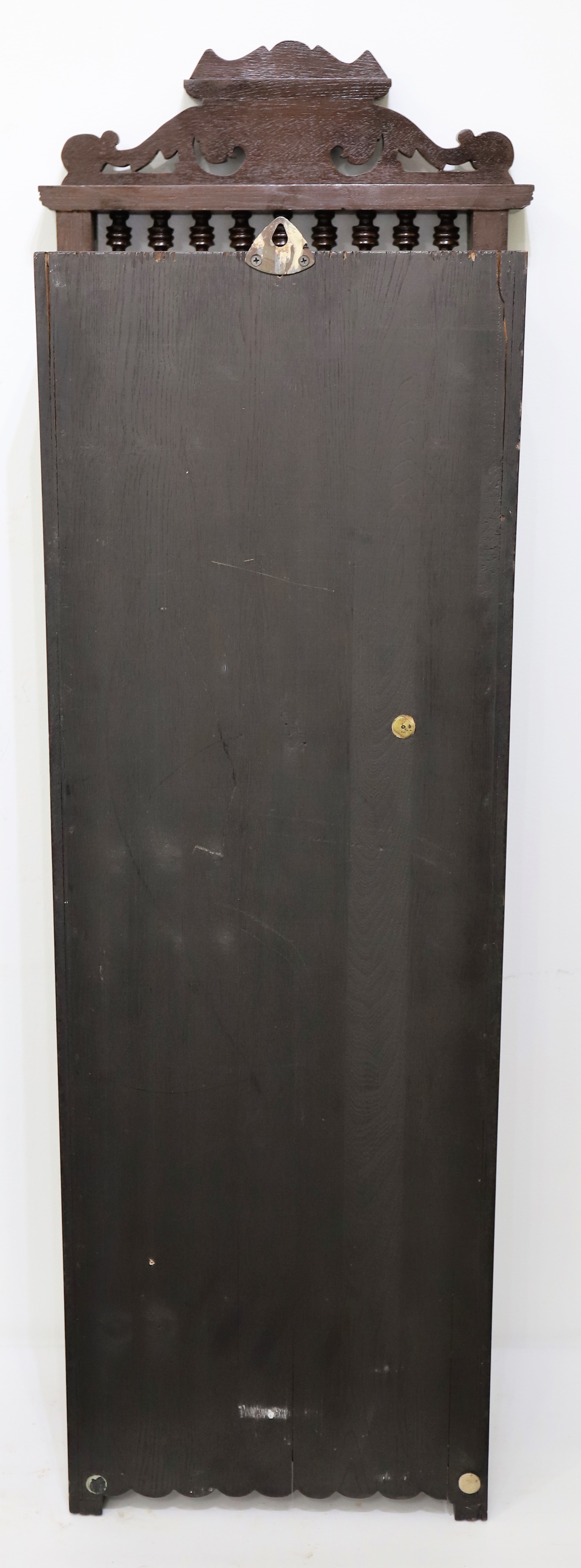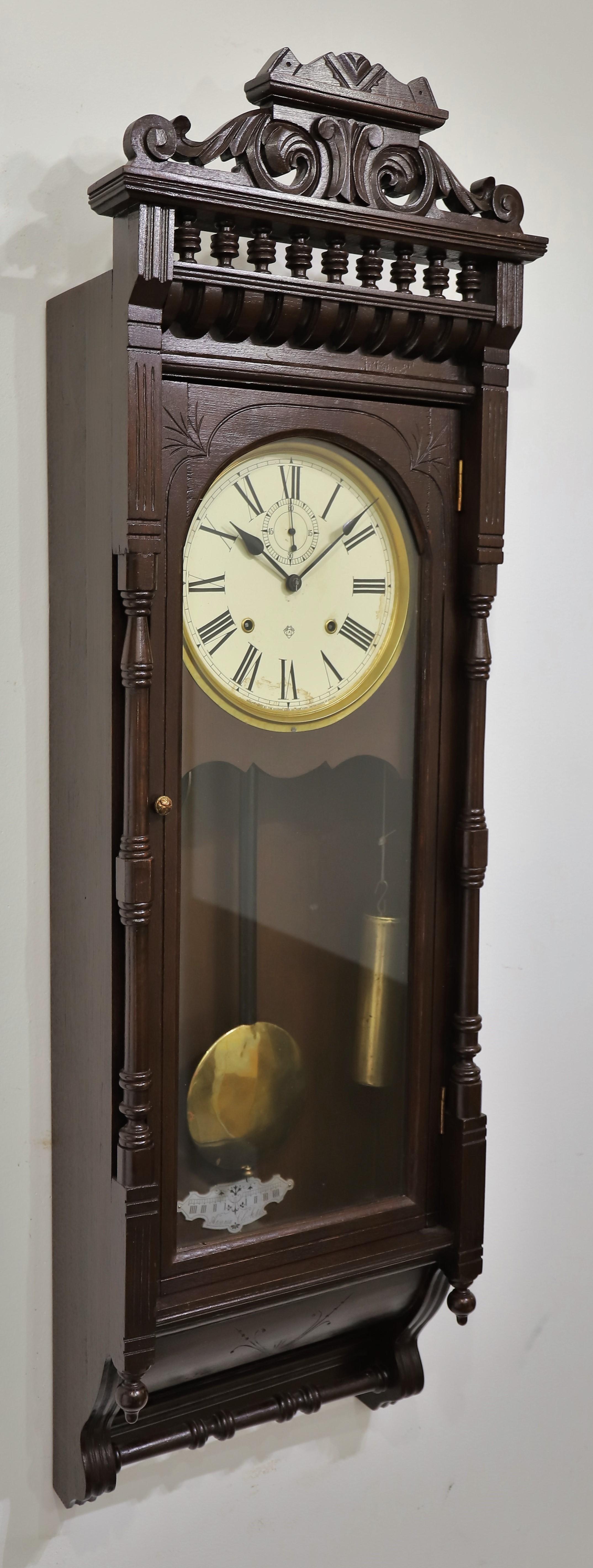 Ansonia Clock Co. “Santa Fe” REPRODUCTION,ca. 1990. A 52-inch hardwood case stained very darkly to resemble black walnut or mahogany. The carvings and trim pieces