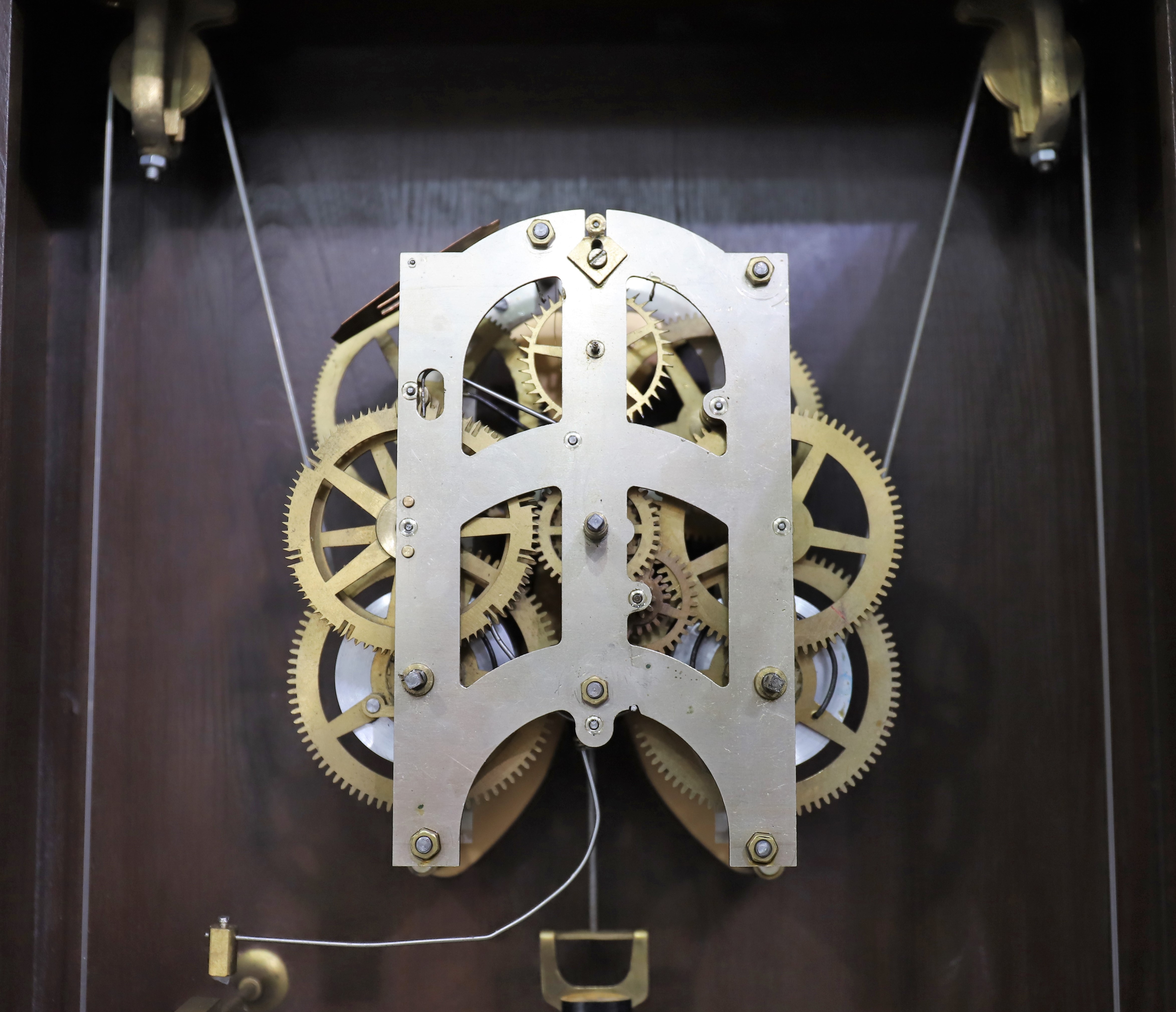 and needs cleaning at a minimum. It is driven by two brass weights that do not match, both are old, maybe the only old things