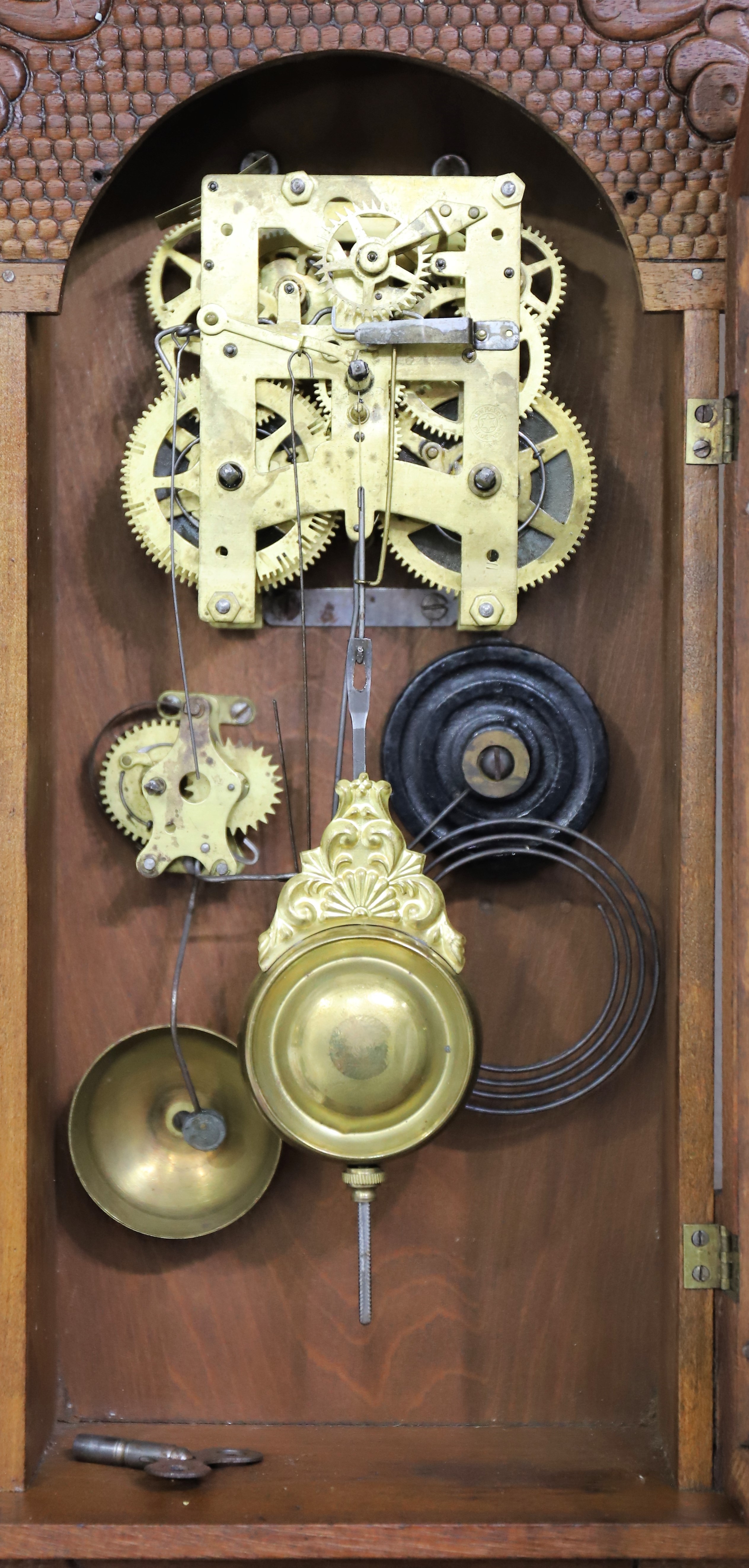 glass is old with a gold stencil, the dial is old, yellowed paper with old hands. The 8-day, time-and-strike movement is die-stamped
