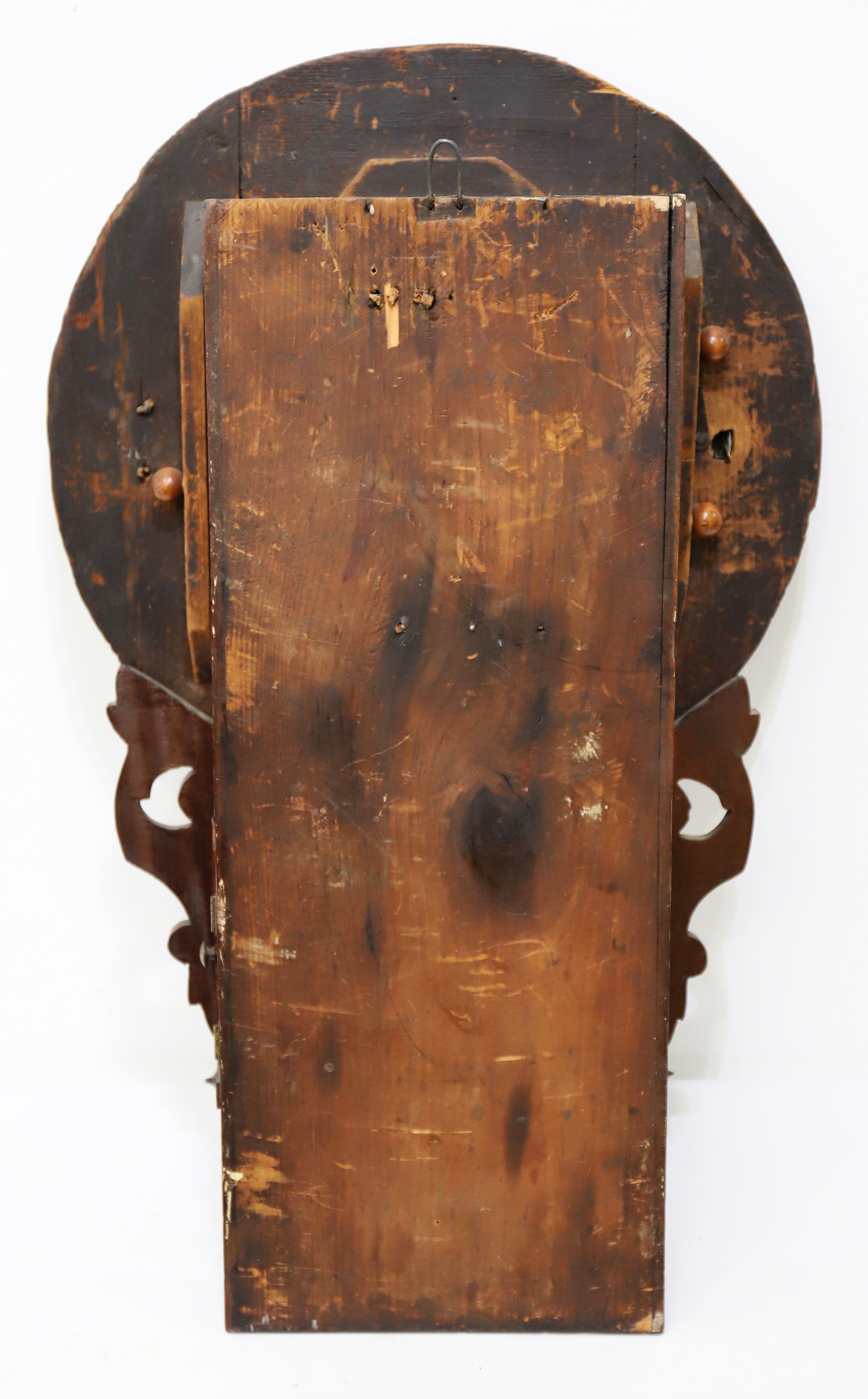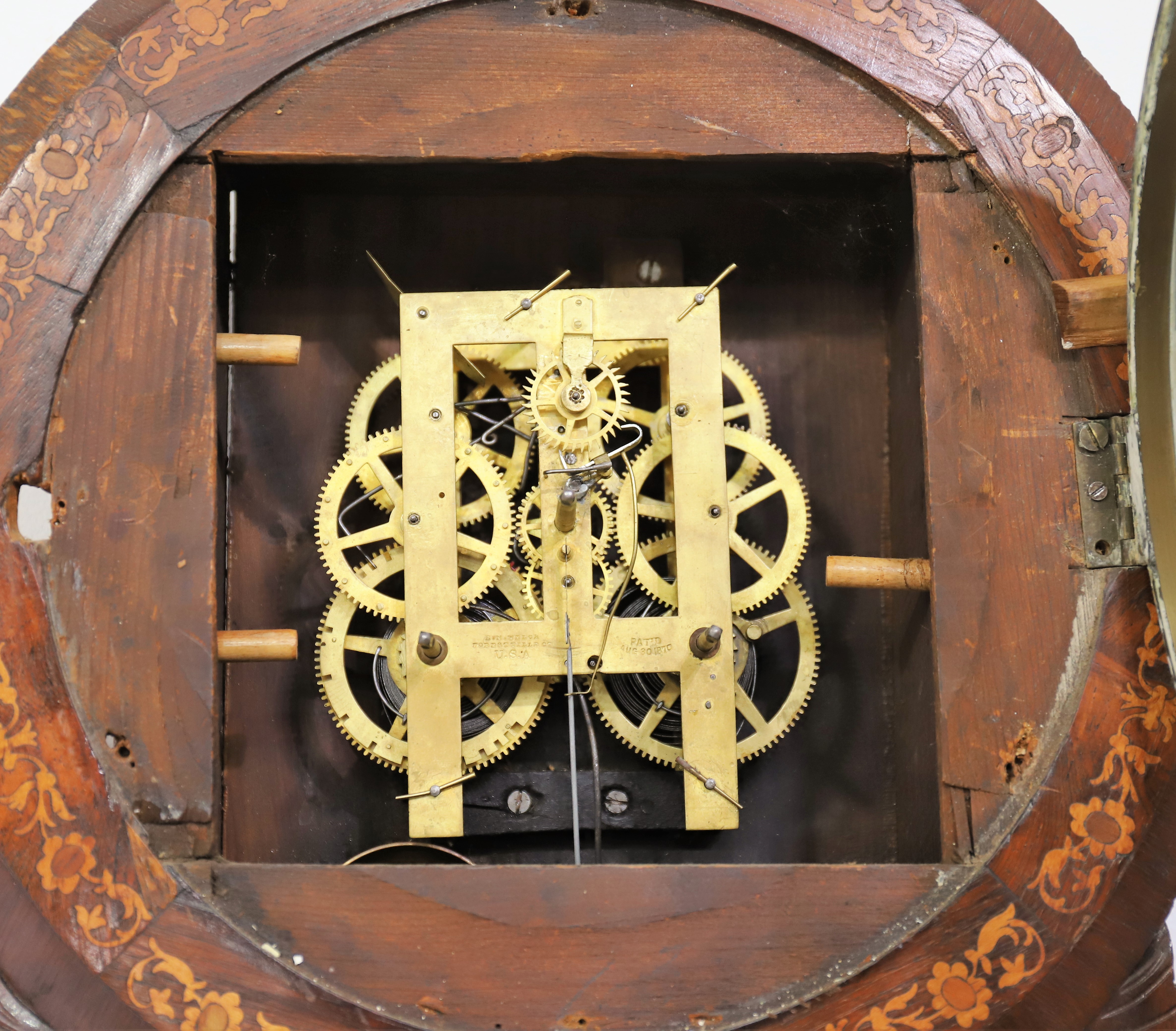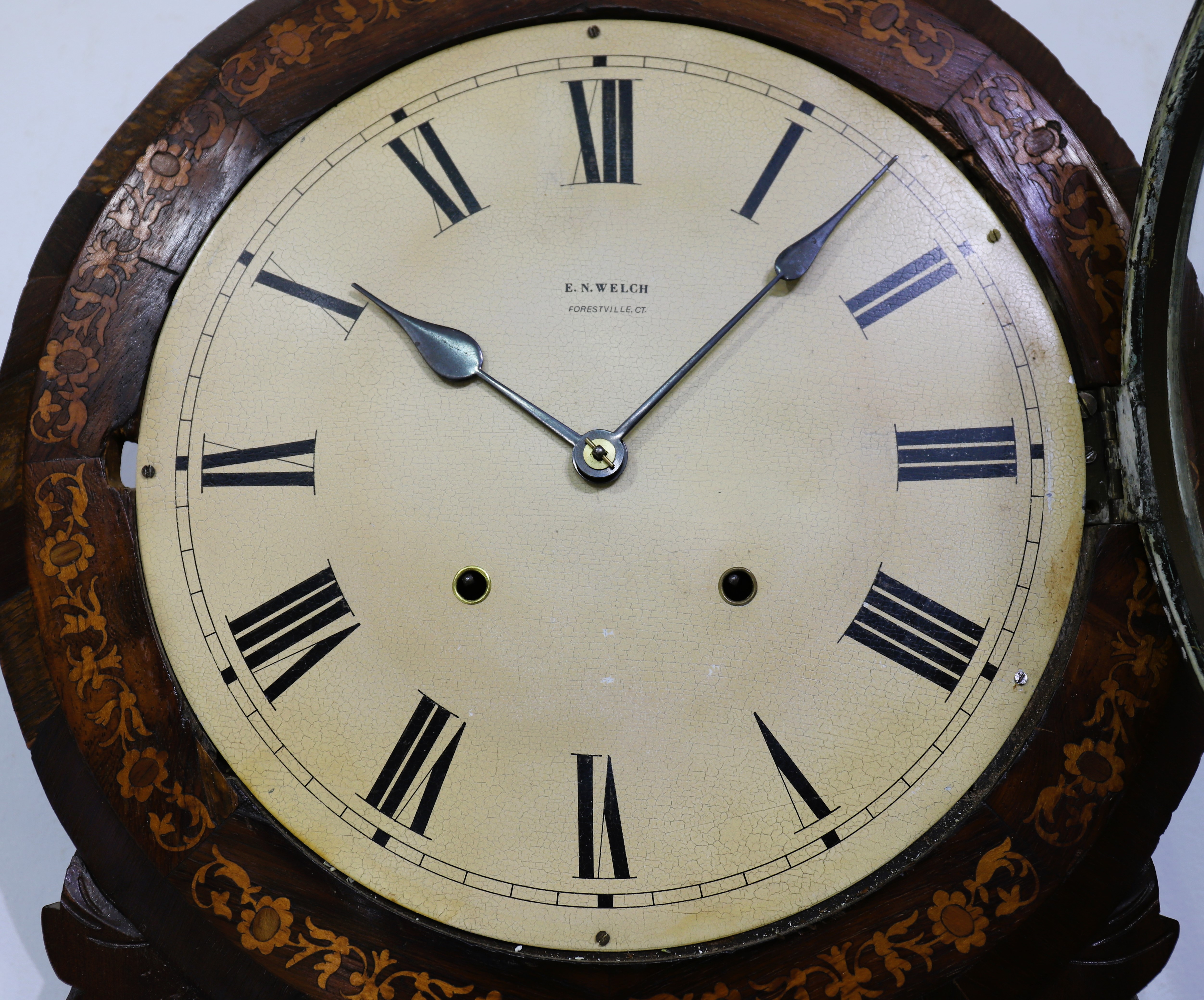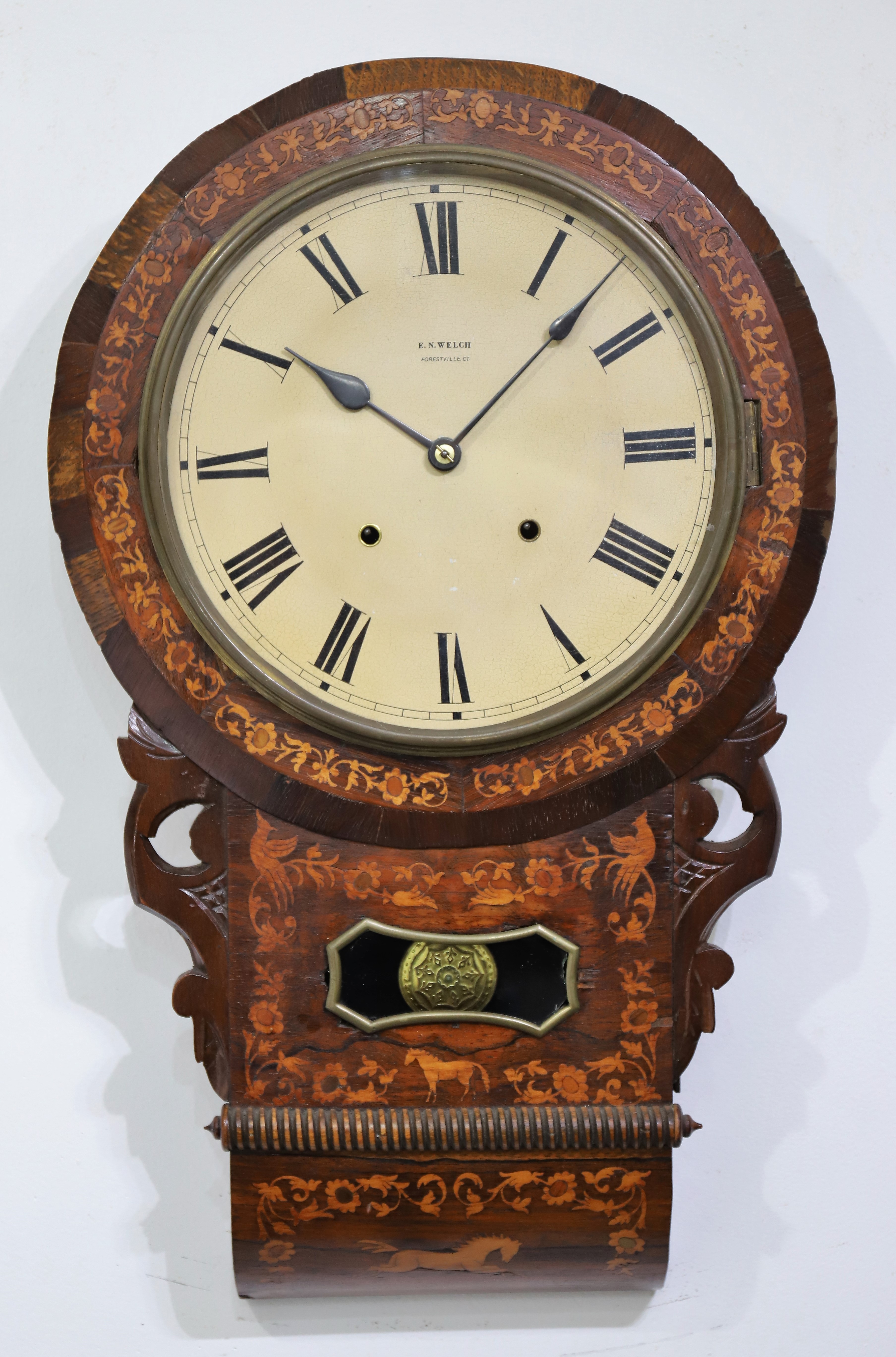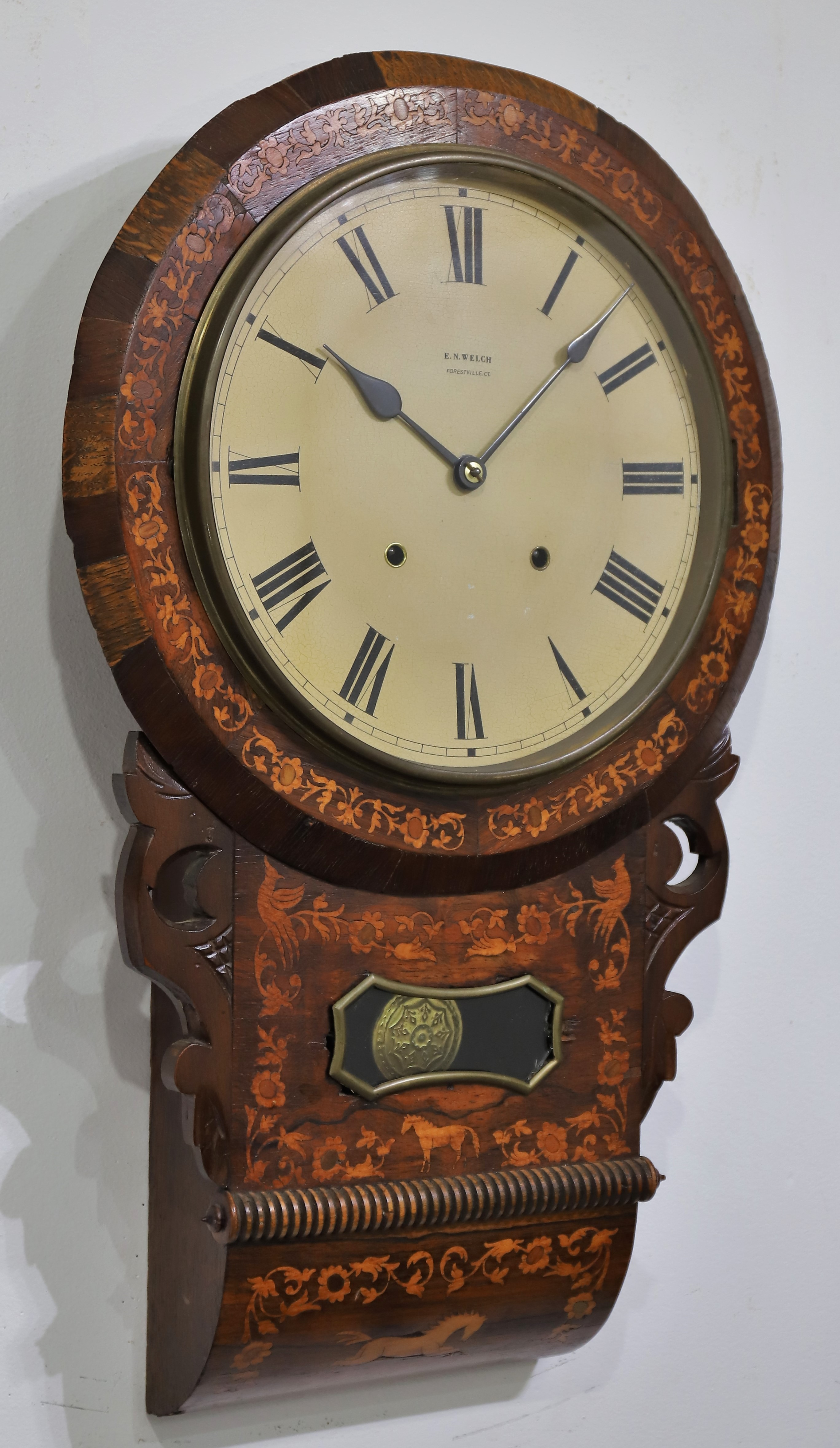 round-drop wall clock with an inlaid case made in England and an E.N. Welch 8-day, time-and-strike movement. The inlay on the