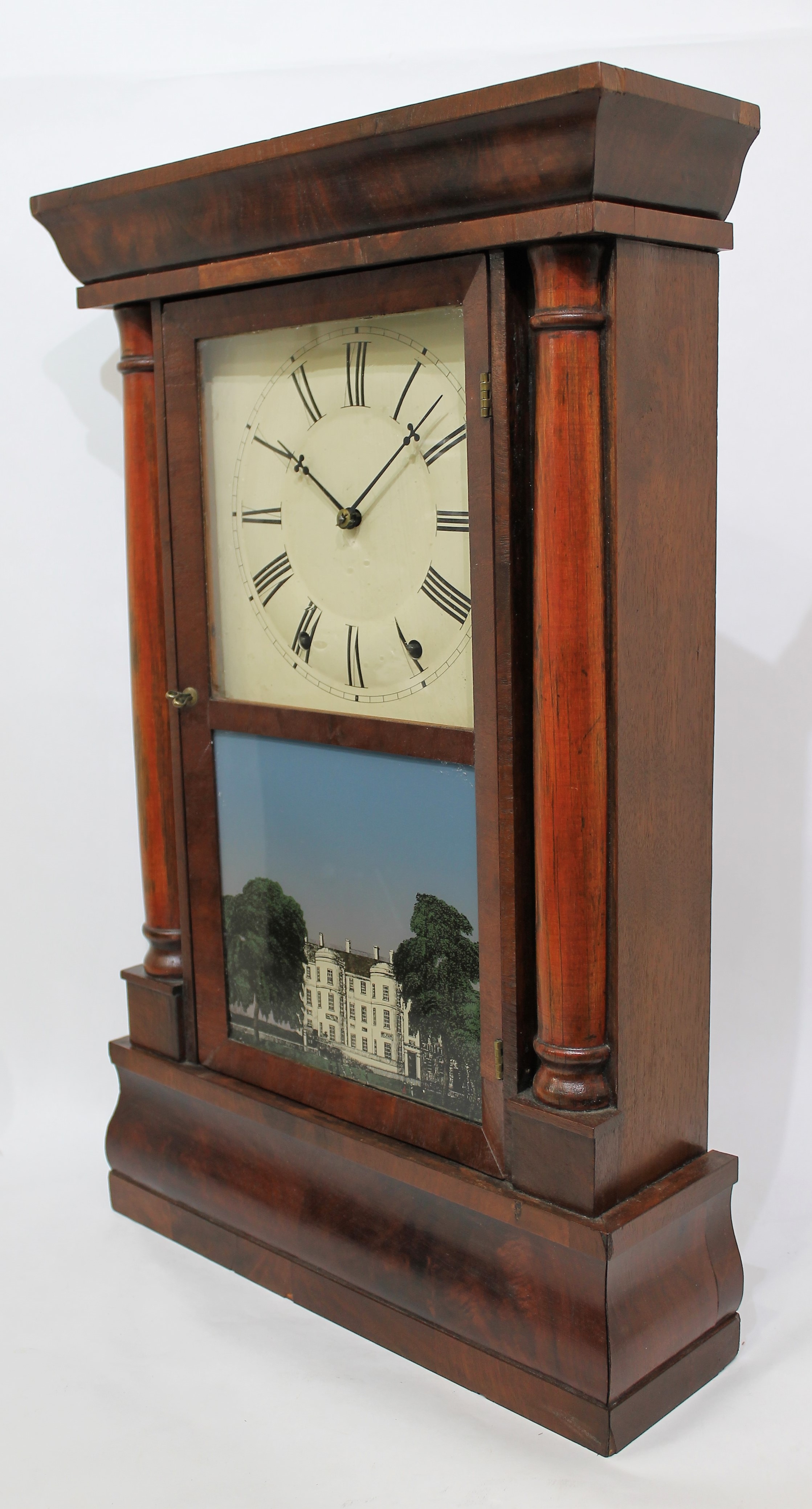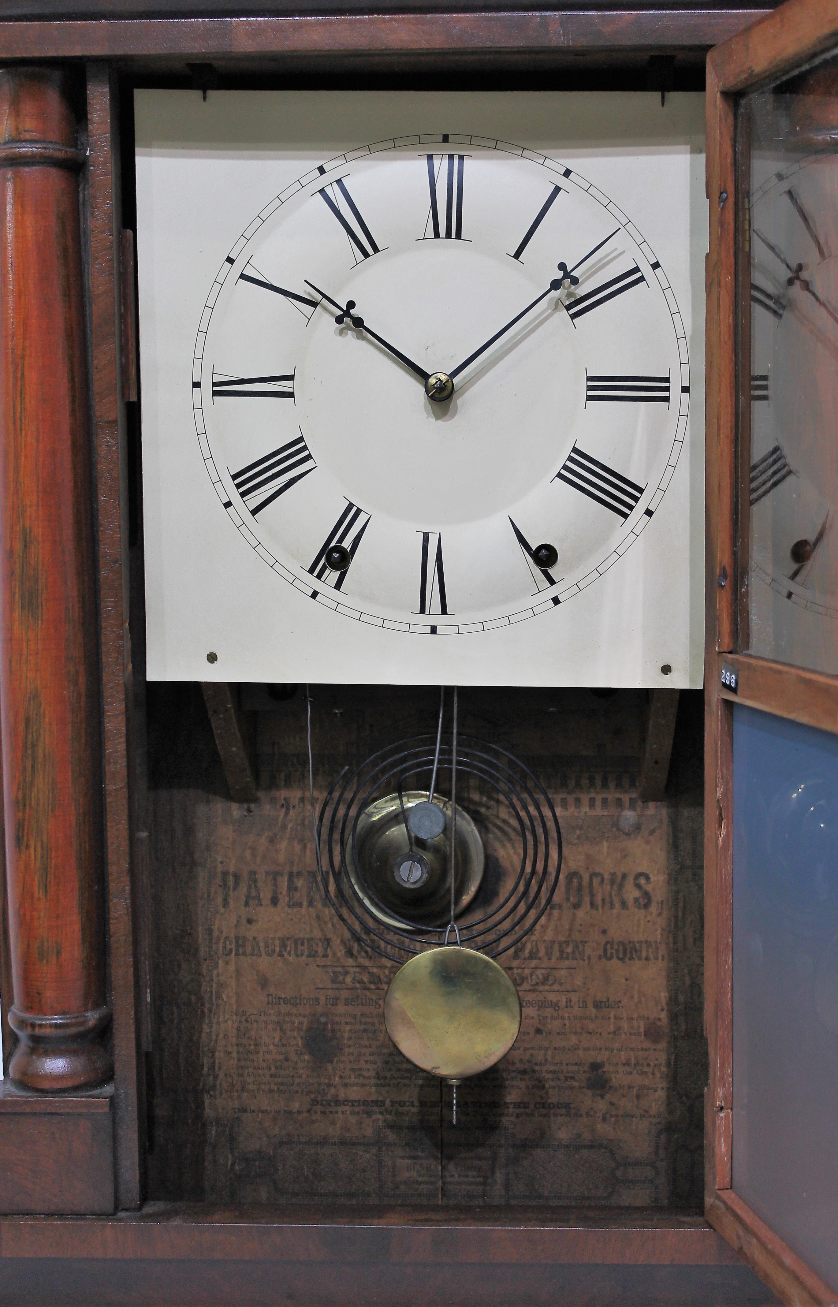 Chauncey Jerome shelf clock, 1845-1855. A refinished 24-inch column & cornice case with flame mahogany veneer along the bottom. The half-columns were probably originally