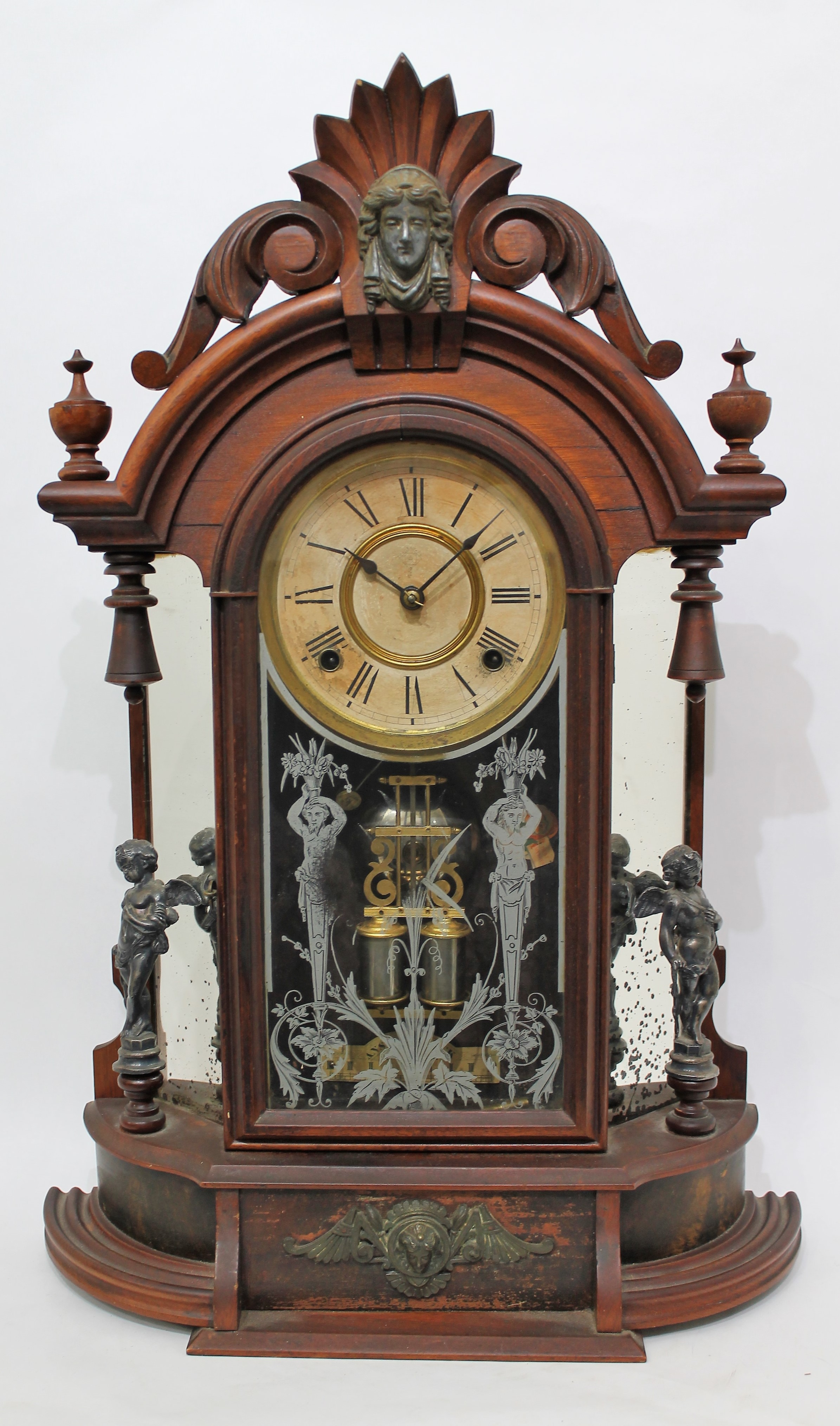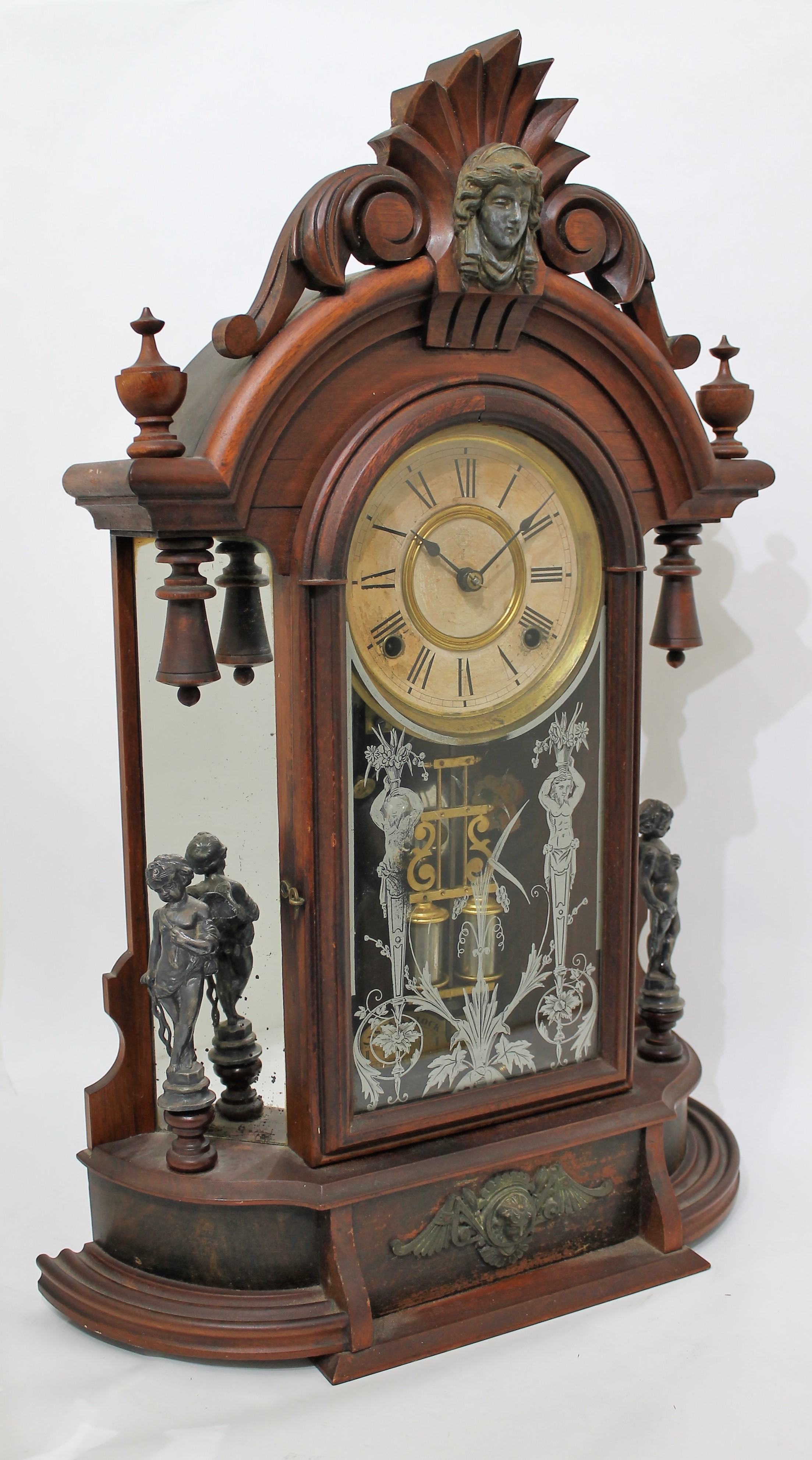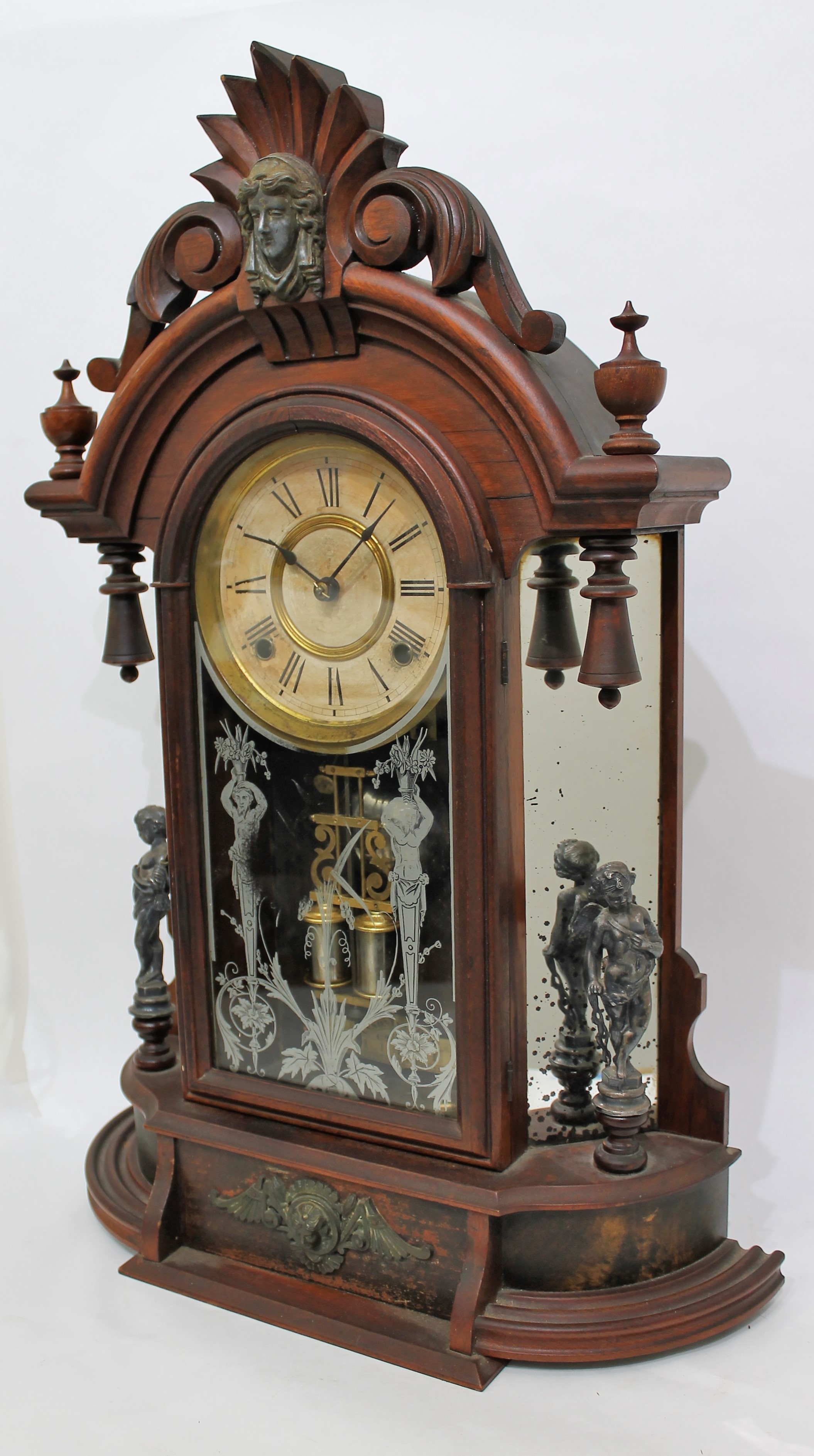 Ansonia Clock Co. “Triumph”, ca. 1880. Ansonia’s iconic mirrorside in very original condition. The finish on the 24-inch black walnut case is old and dusty but everything
