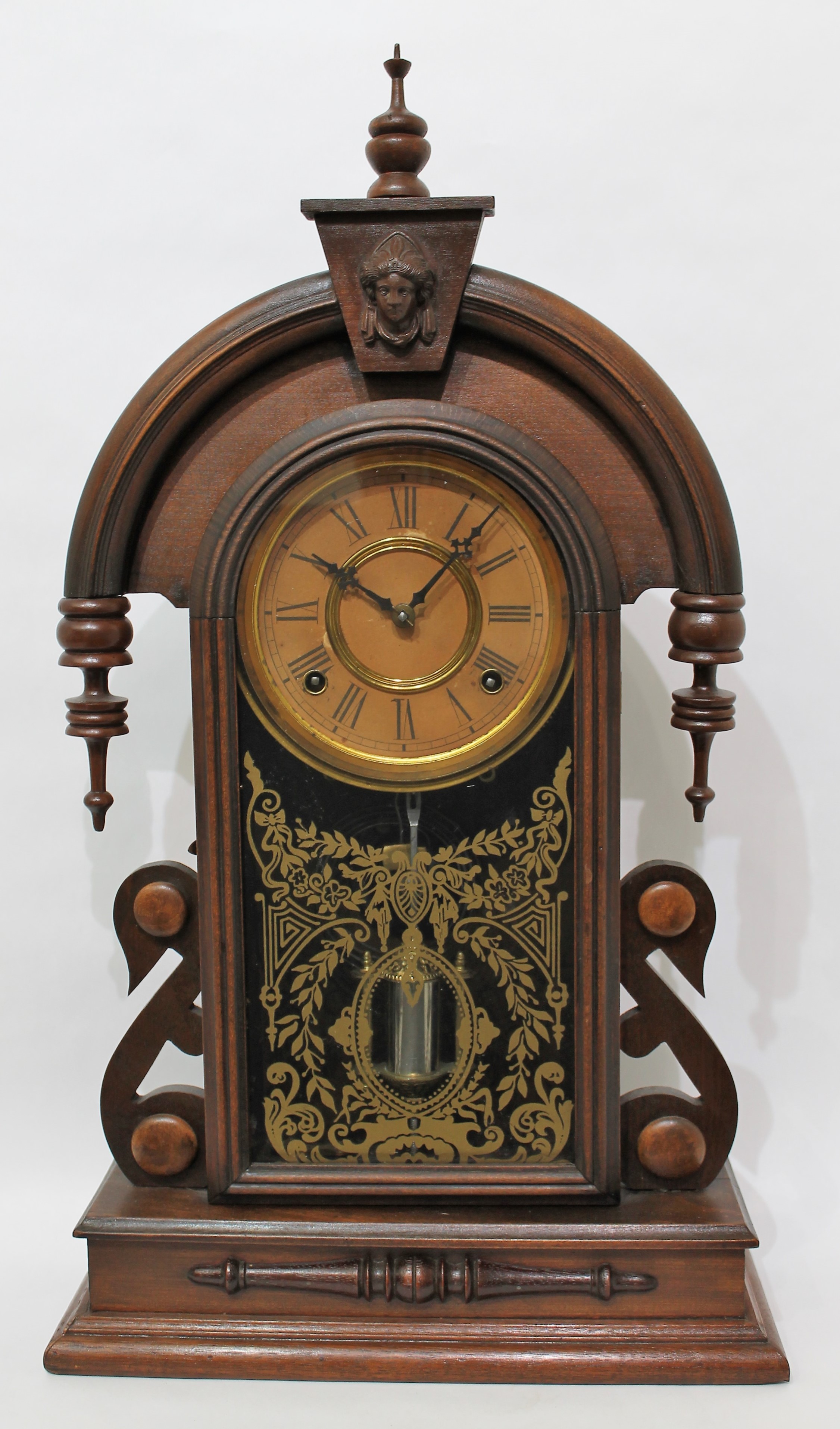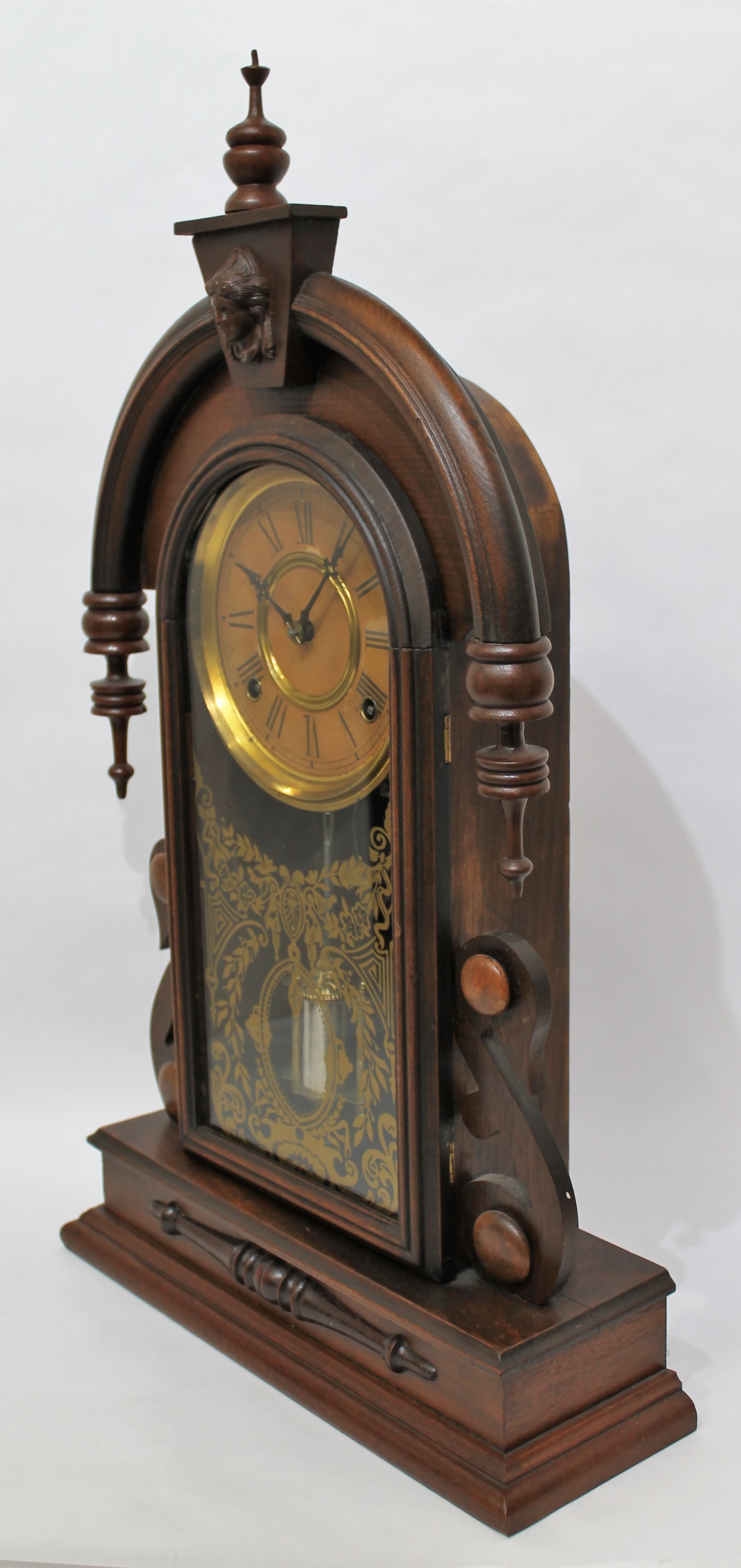 the hands are period but not as shown in the catalog illustrations. The 8-day time and half-hour strike movement is die-stamped
