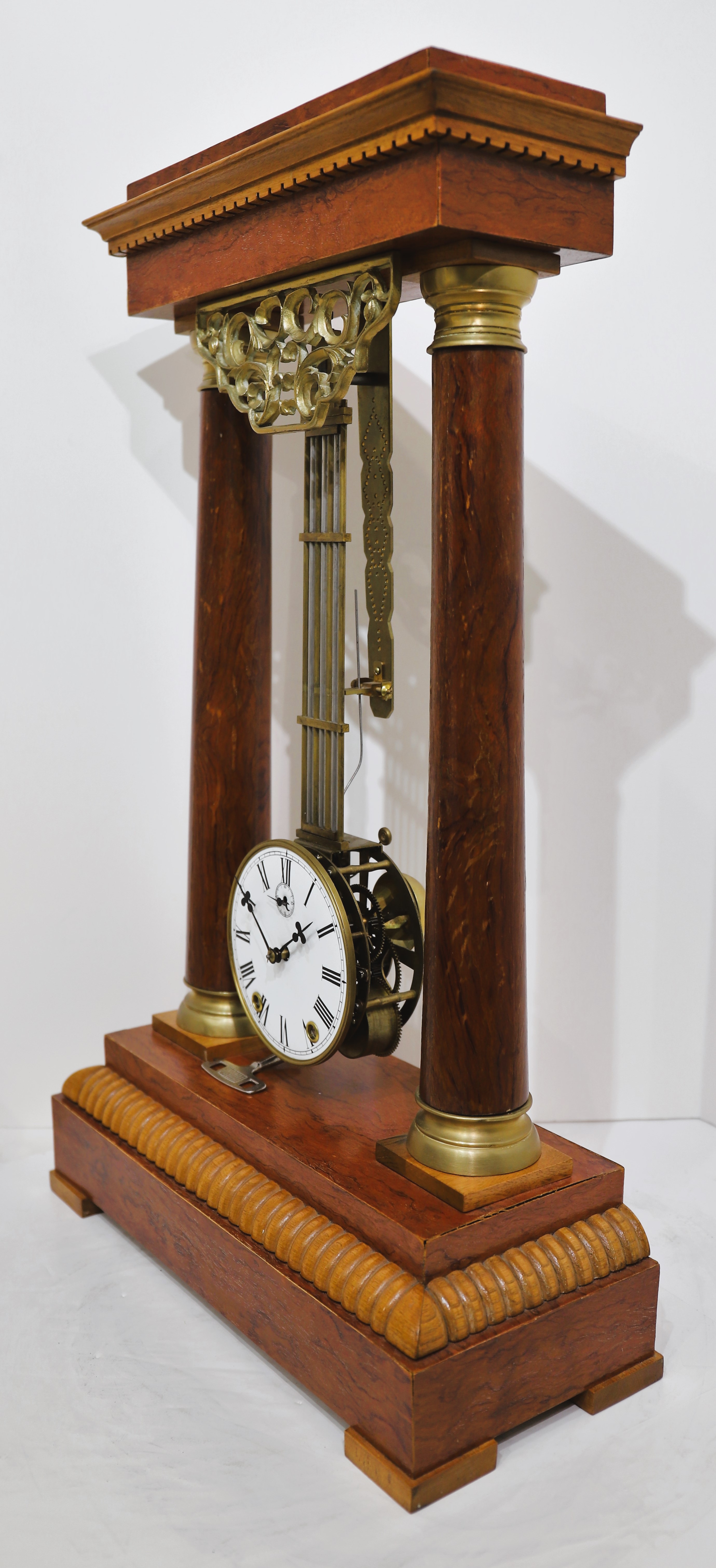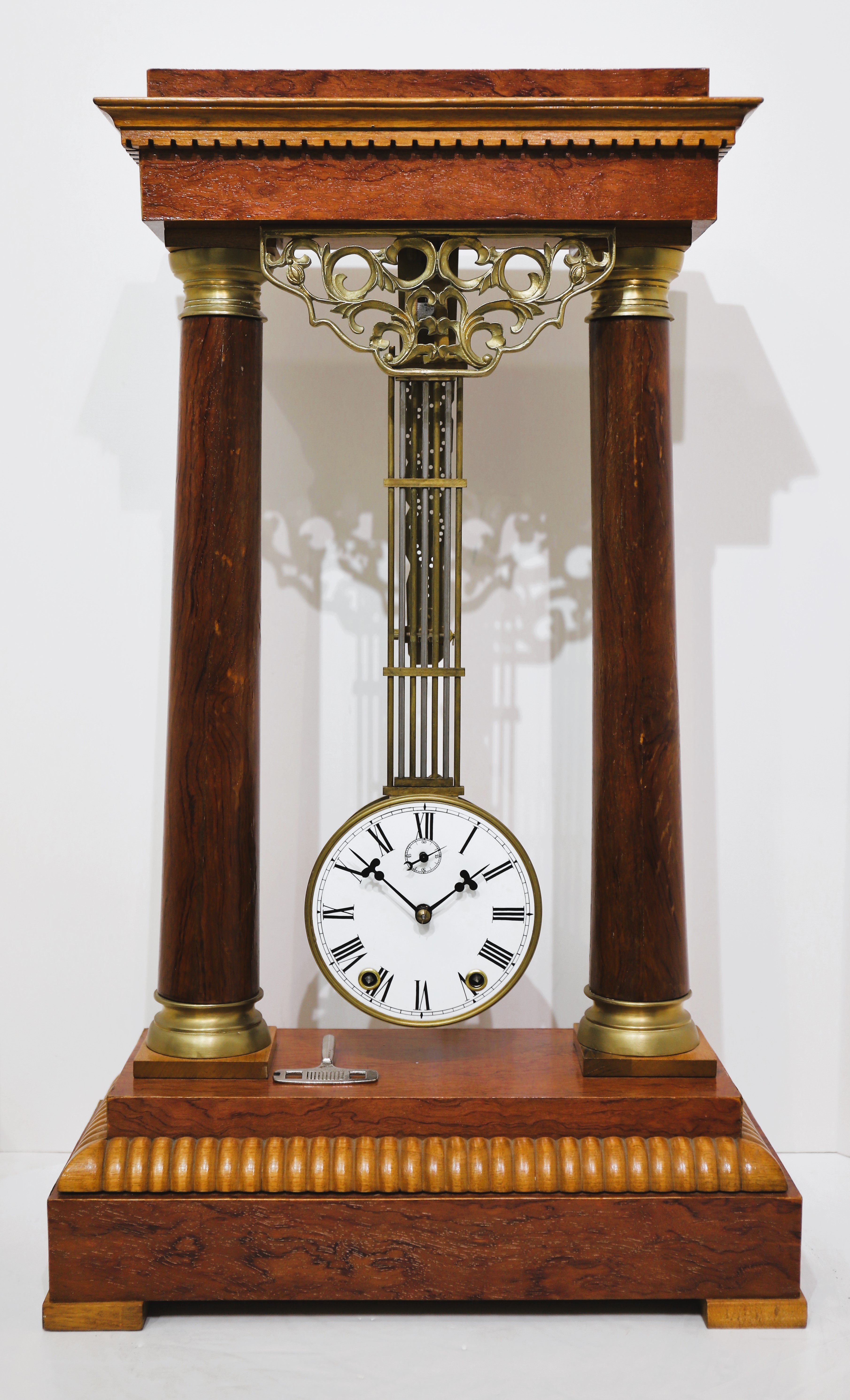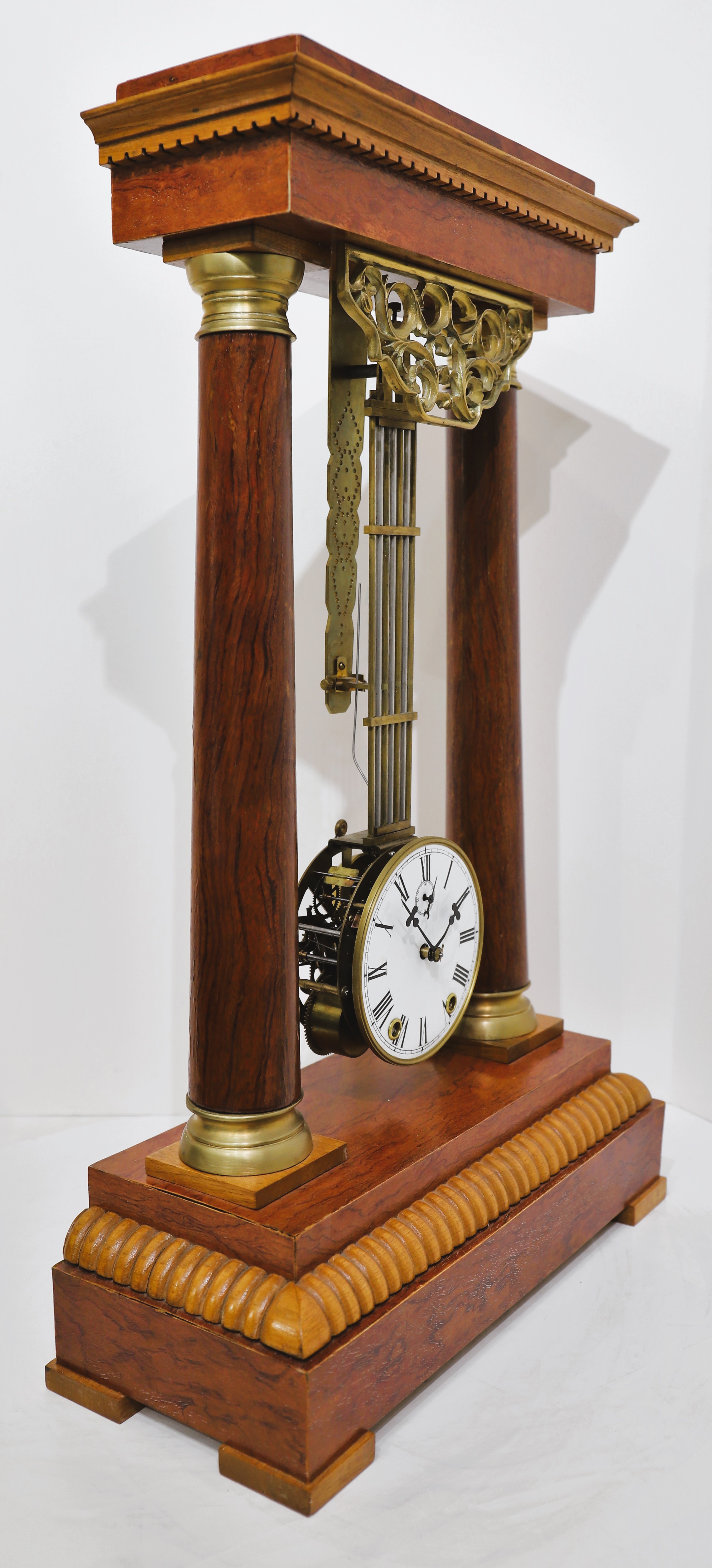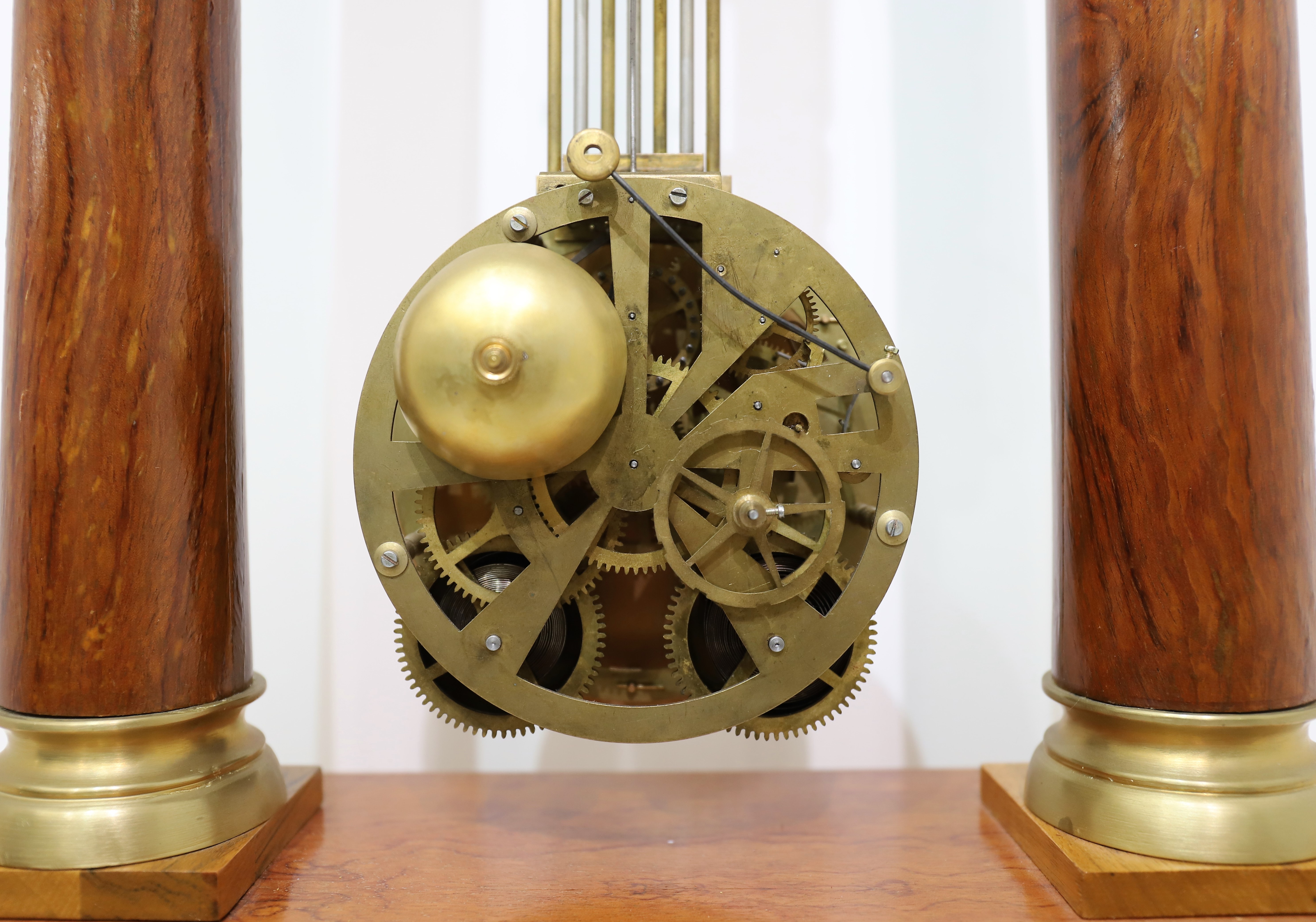 back behind the clock. The dial is porcelain. The movement is a pinwheel escapement, running 8 days and striking on the