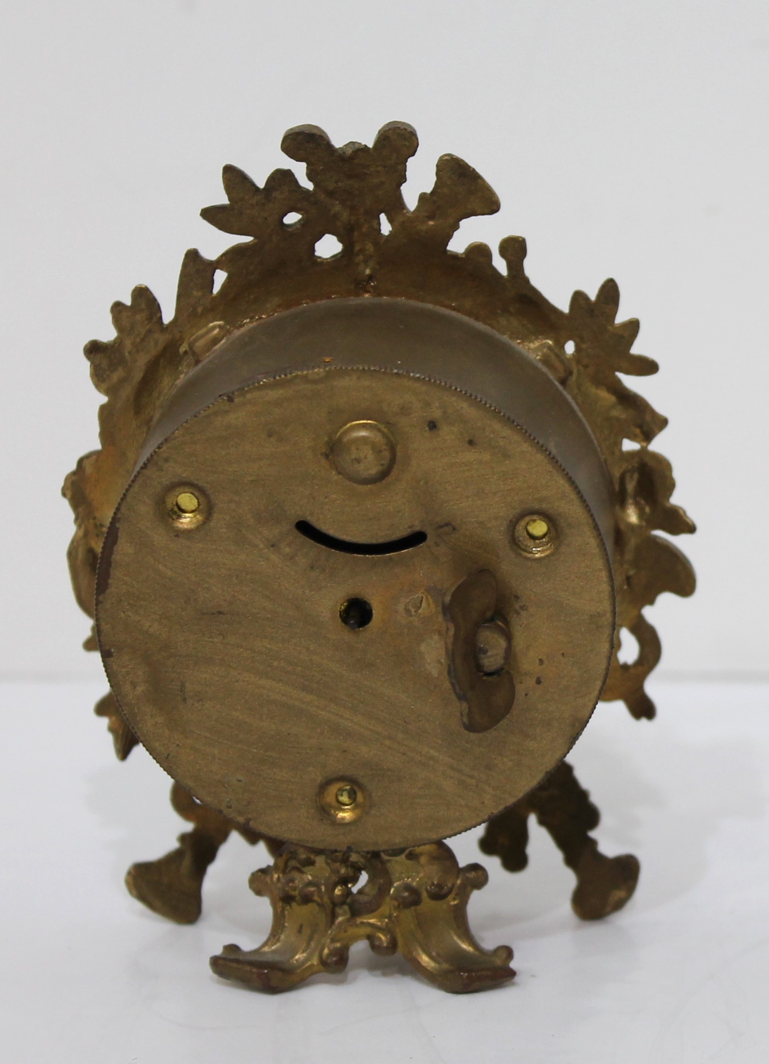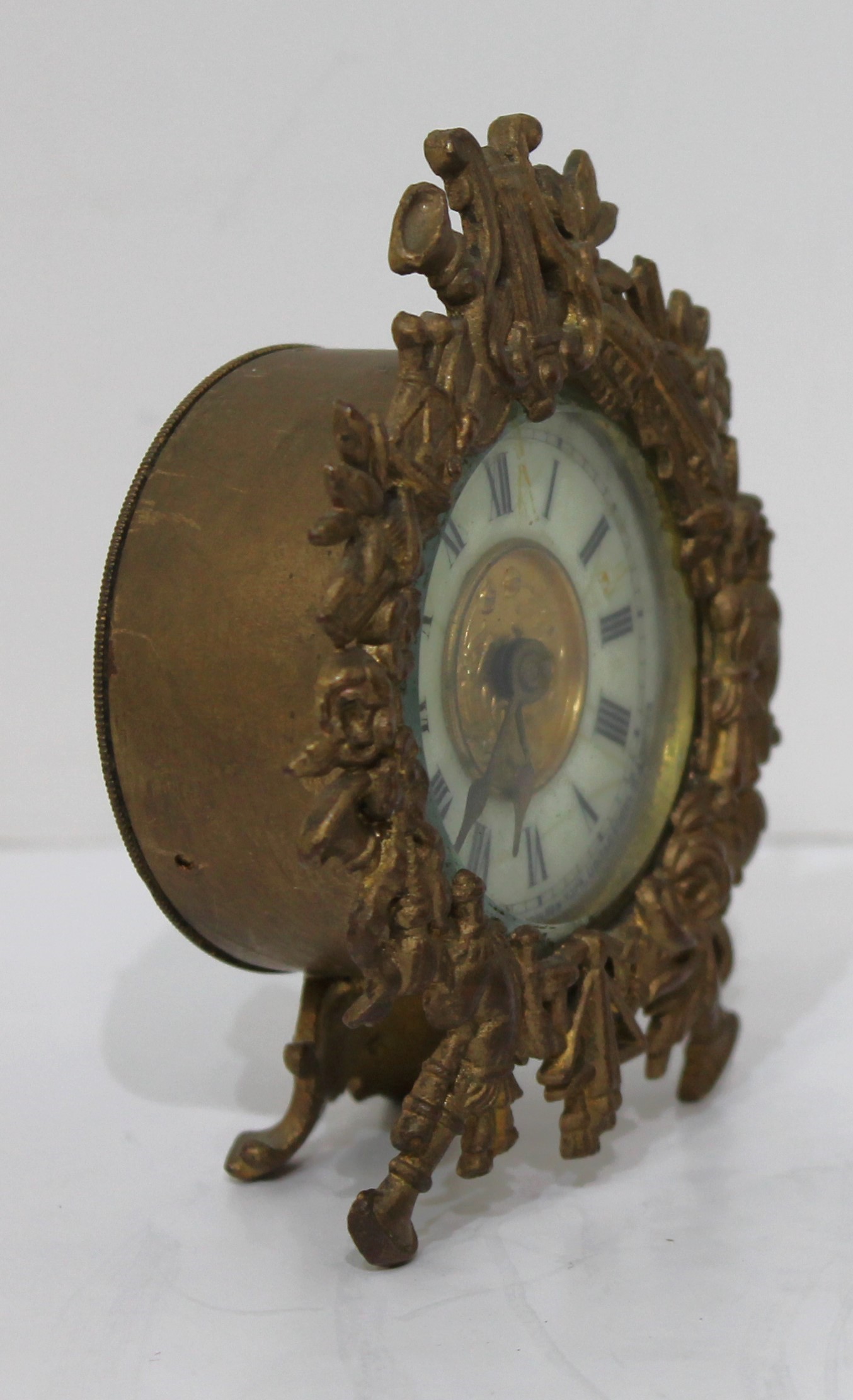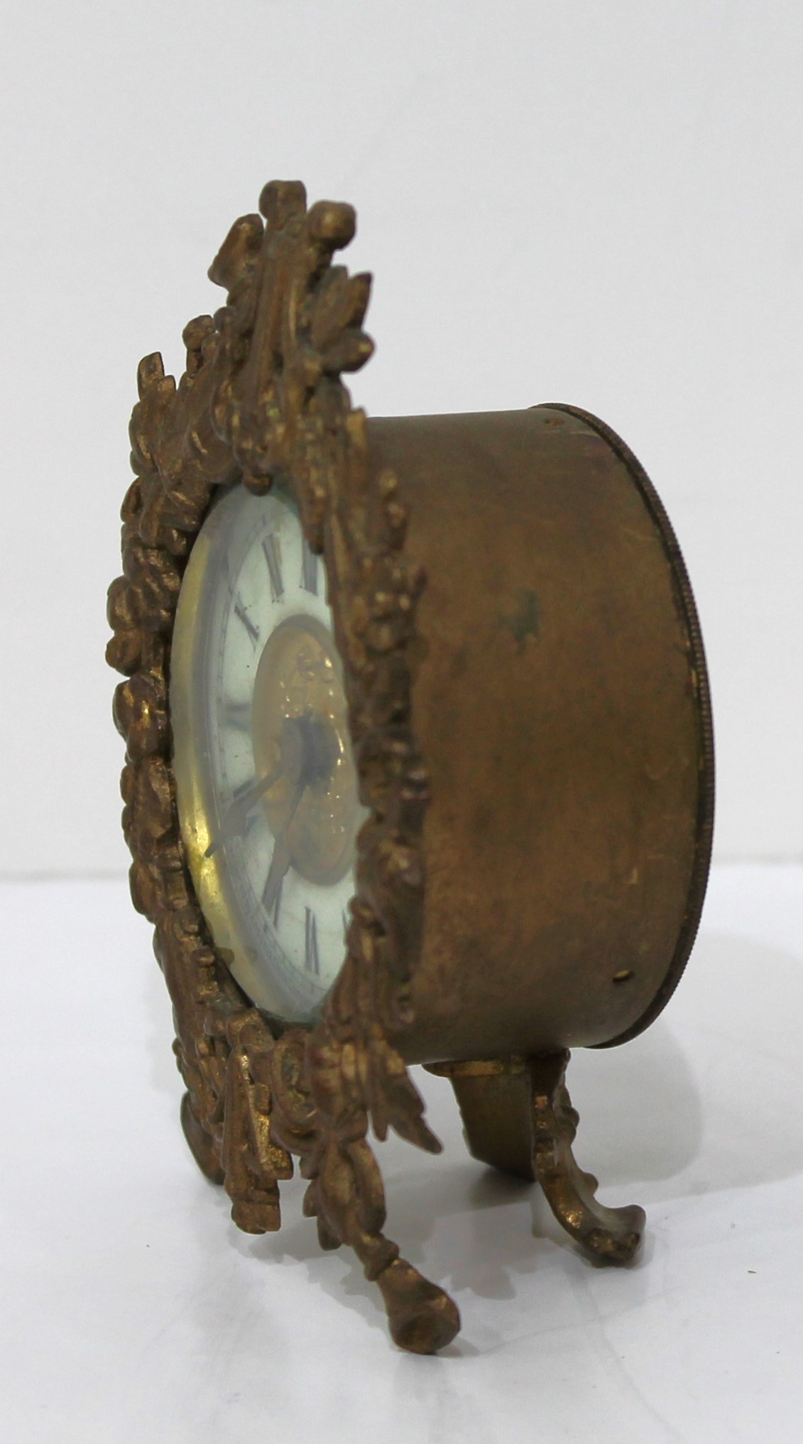 tall backwind with a gilded spelter front with musical instruments around the dial. Most of the gilding has been lost. The glass is beveled; the 2-inch dial is porcelain with a gilt center, with some hairlines. The hands are correct; is has a