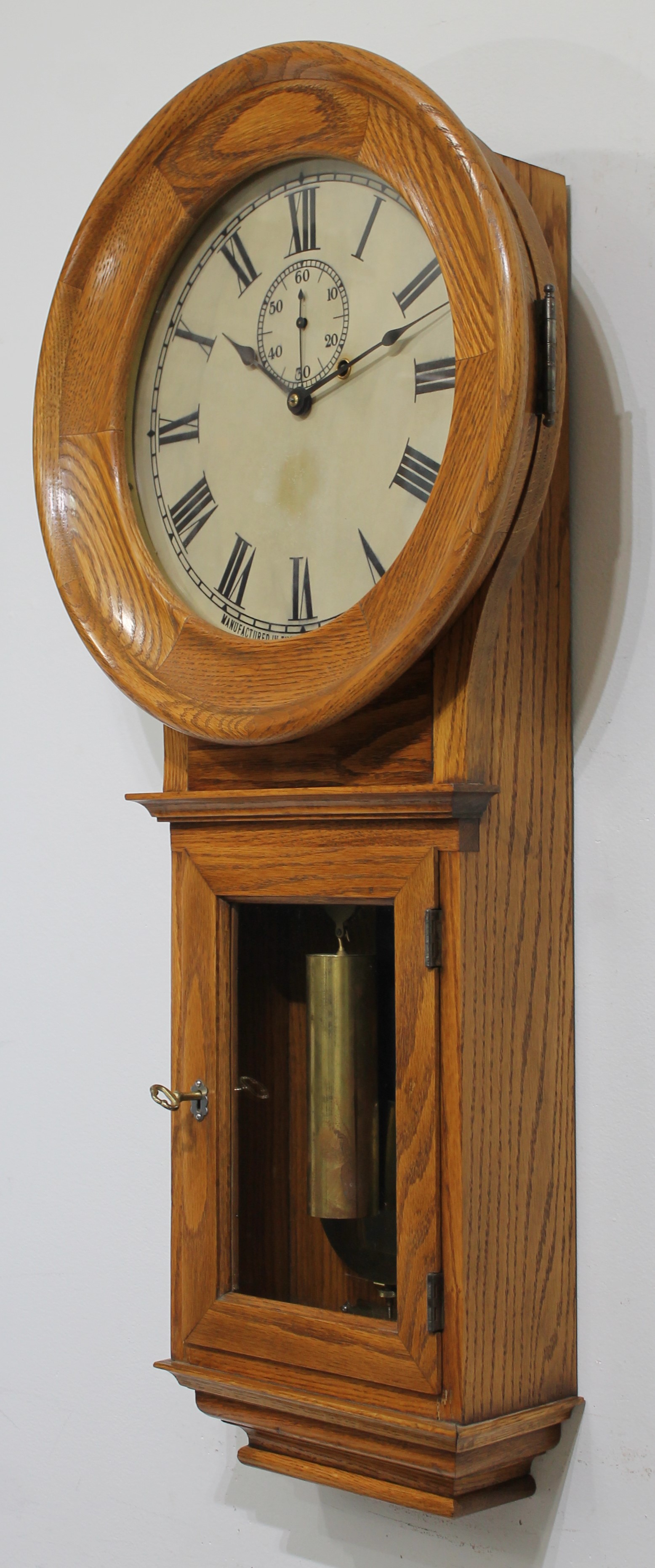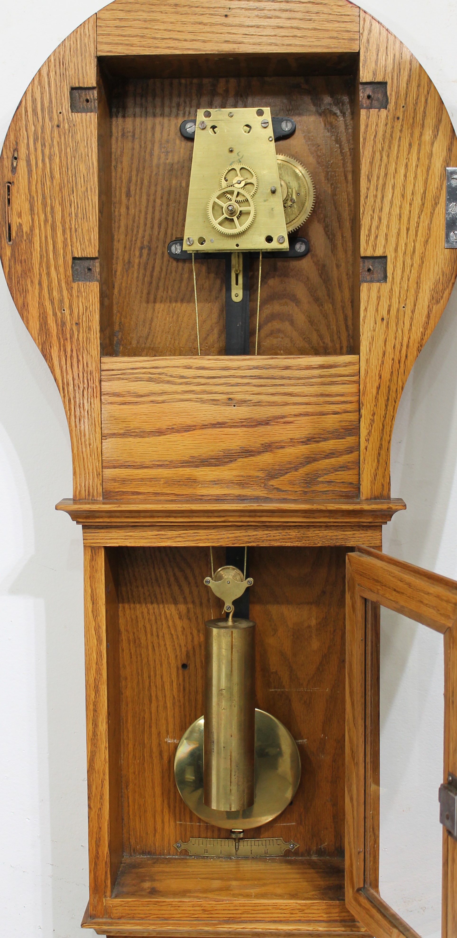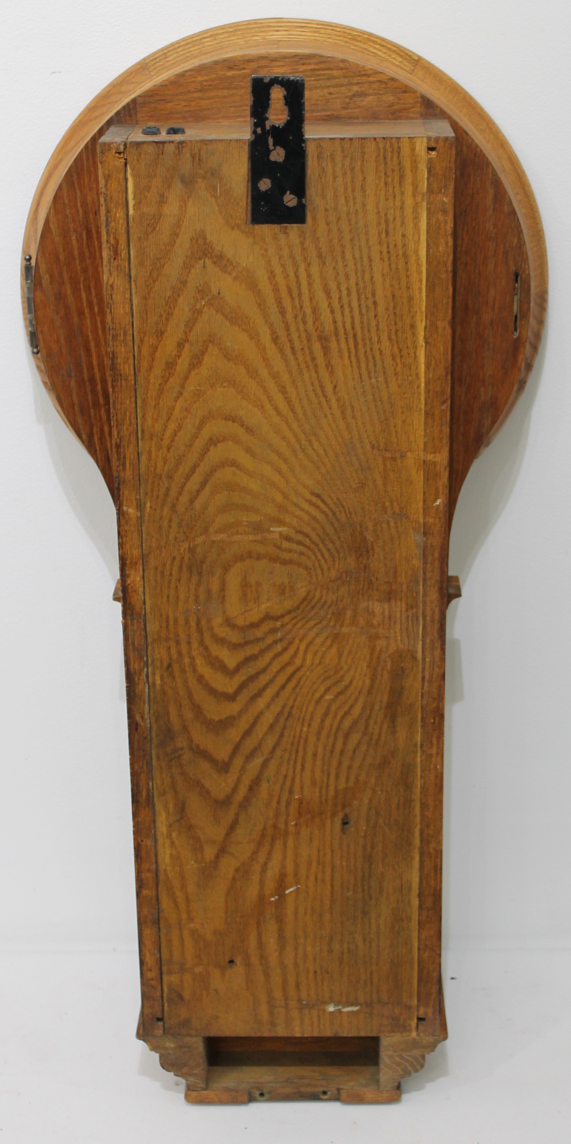 34-inch solid oak case is heavy and once held an electric movement of some sort, given the two electrical holes in the top of the
