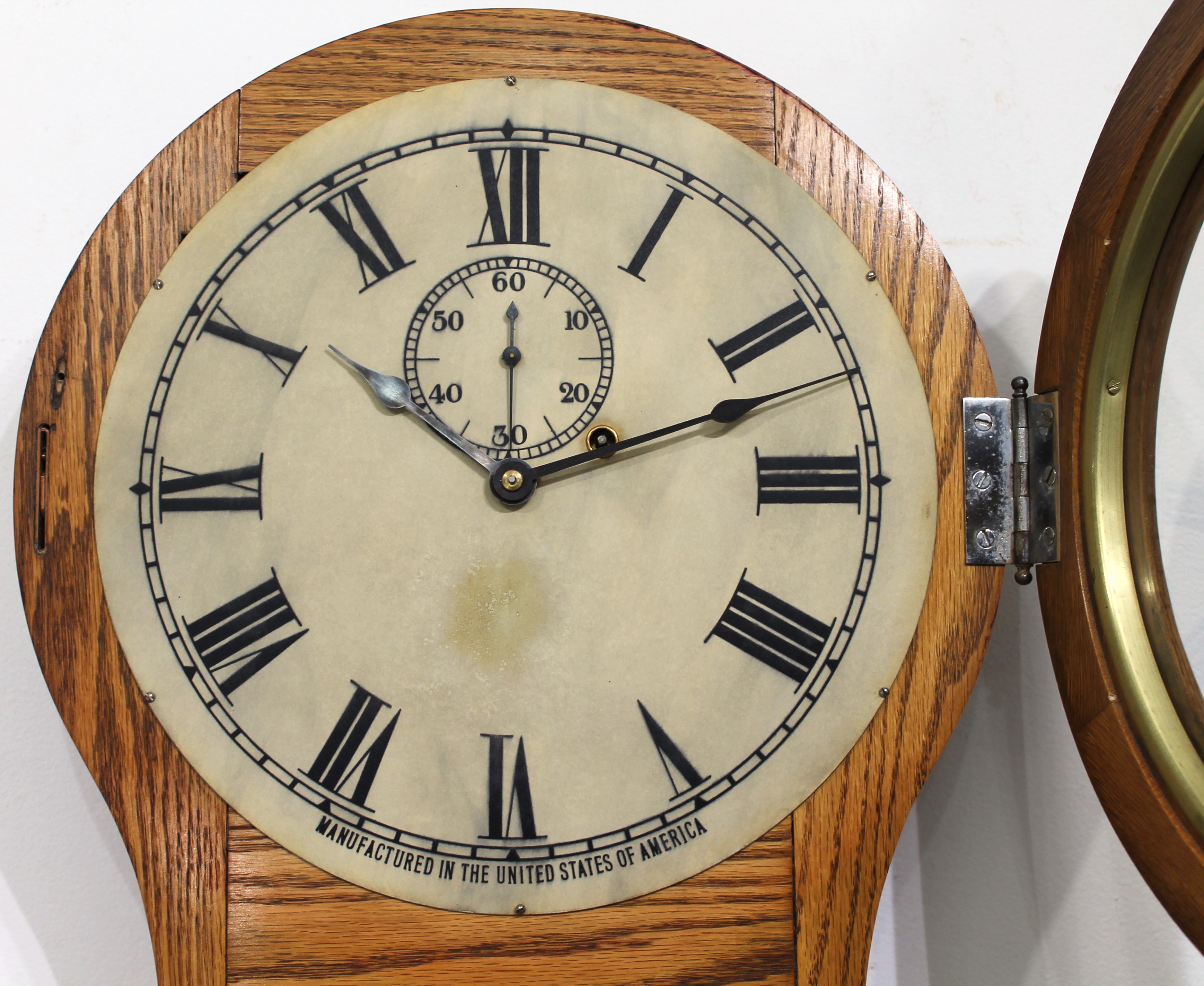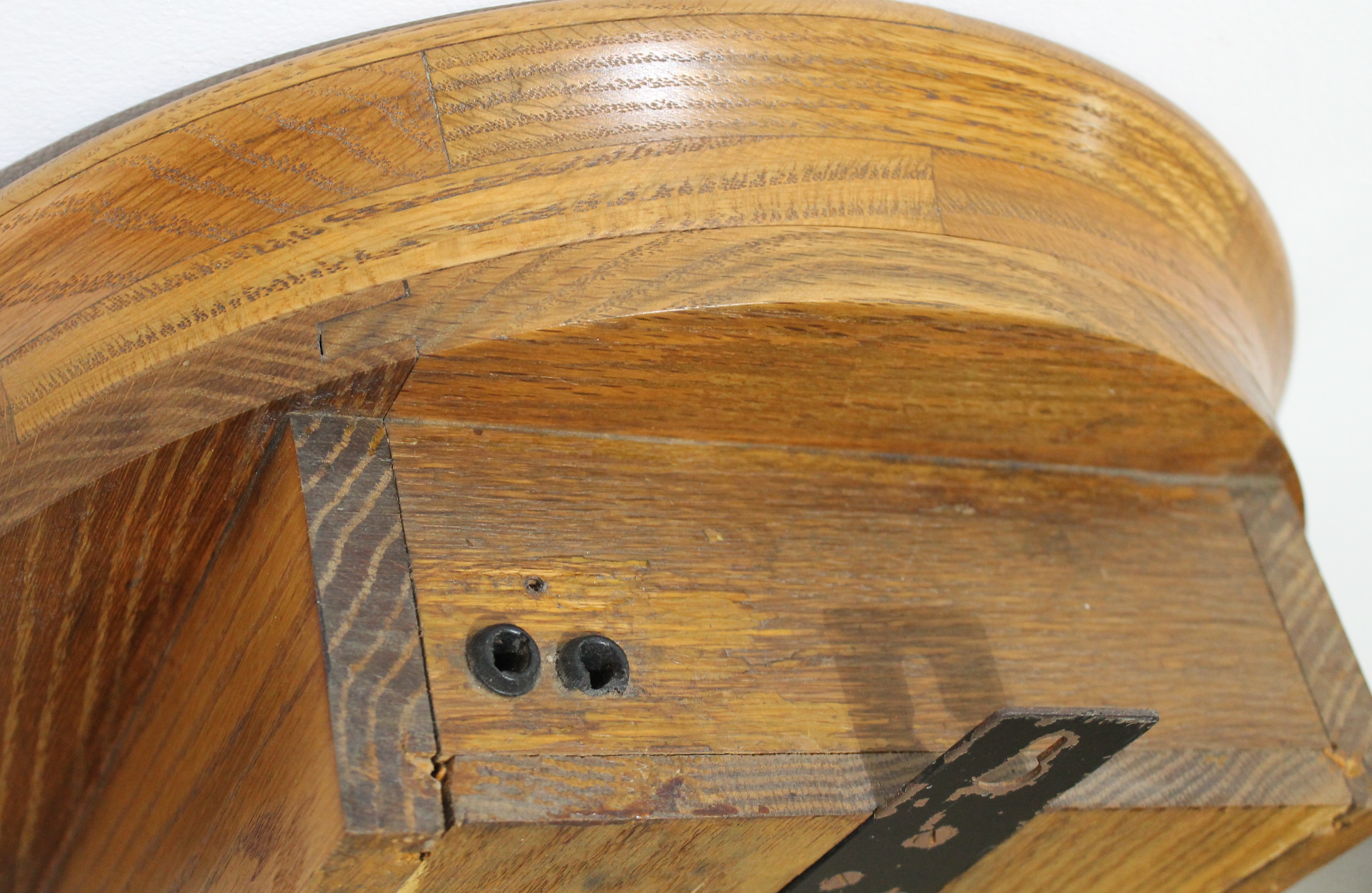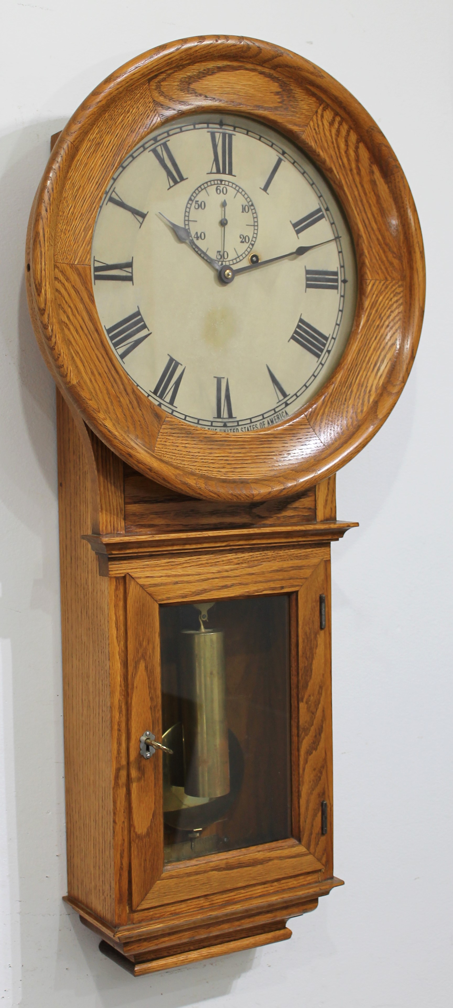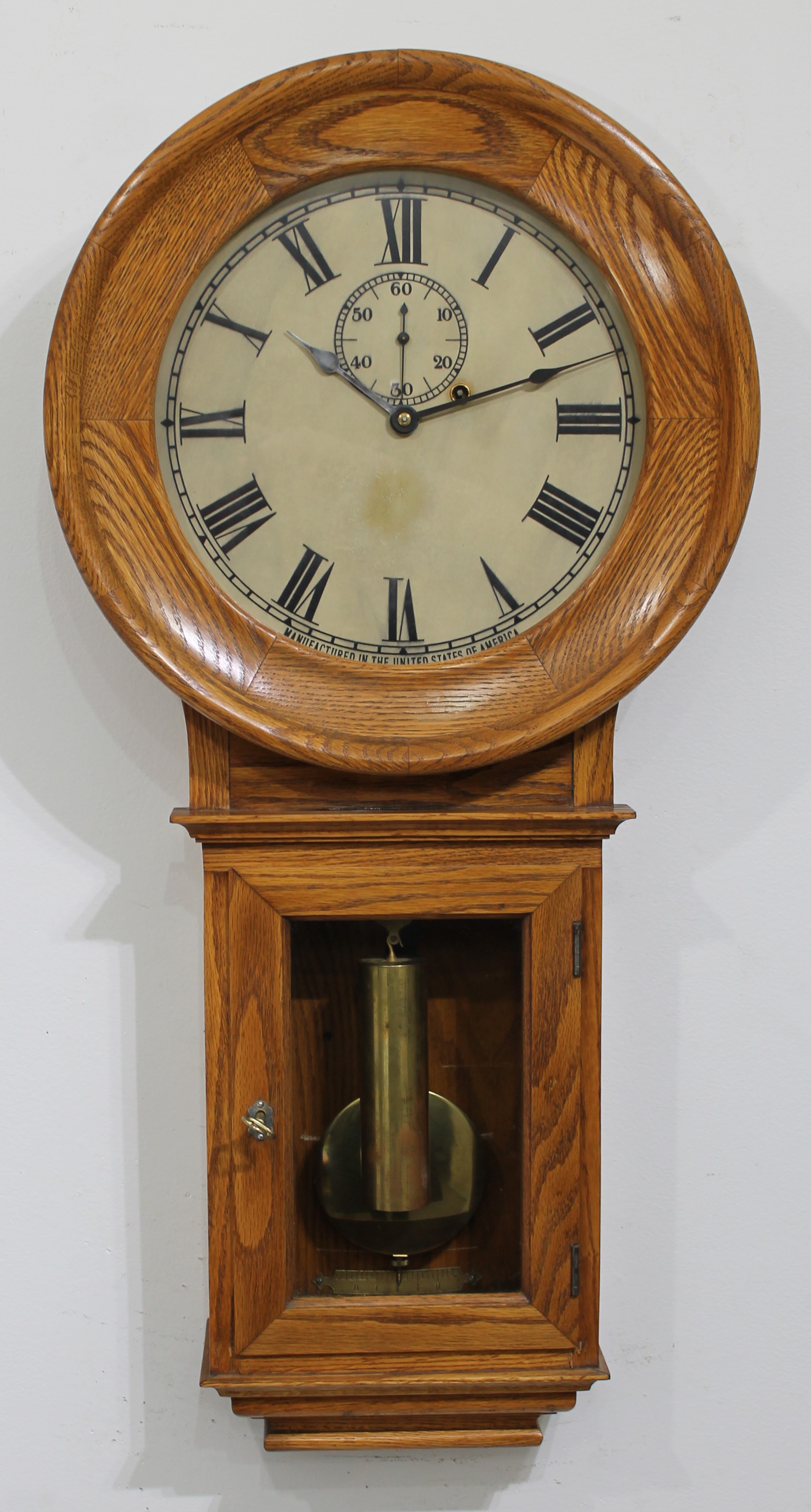 34-inch solid oak case is heavy and once held an electric movement of some sort, given the two electrical holes in the top of the