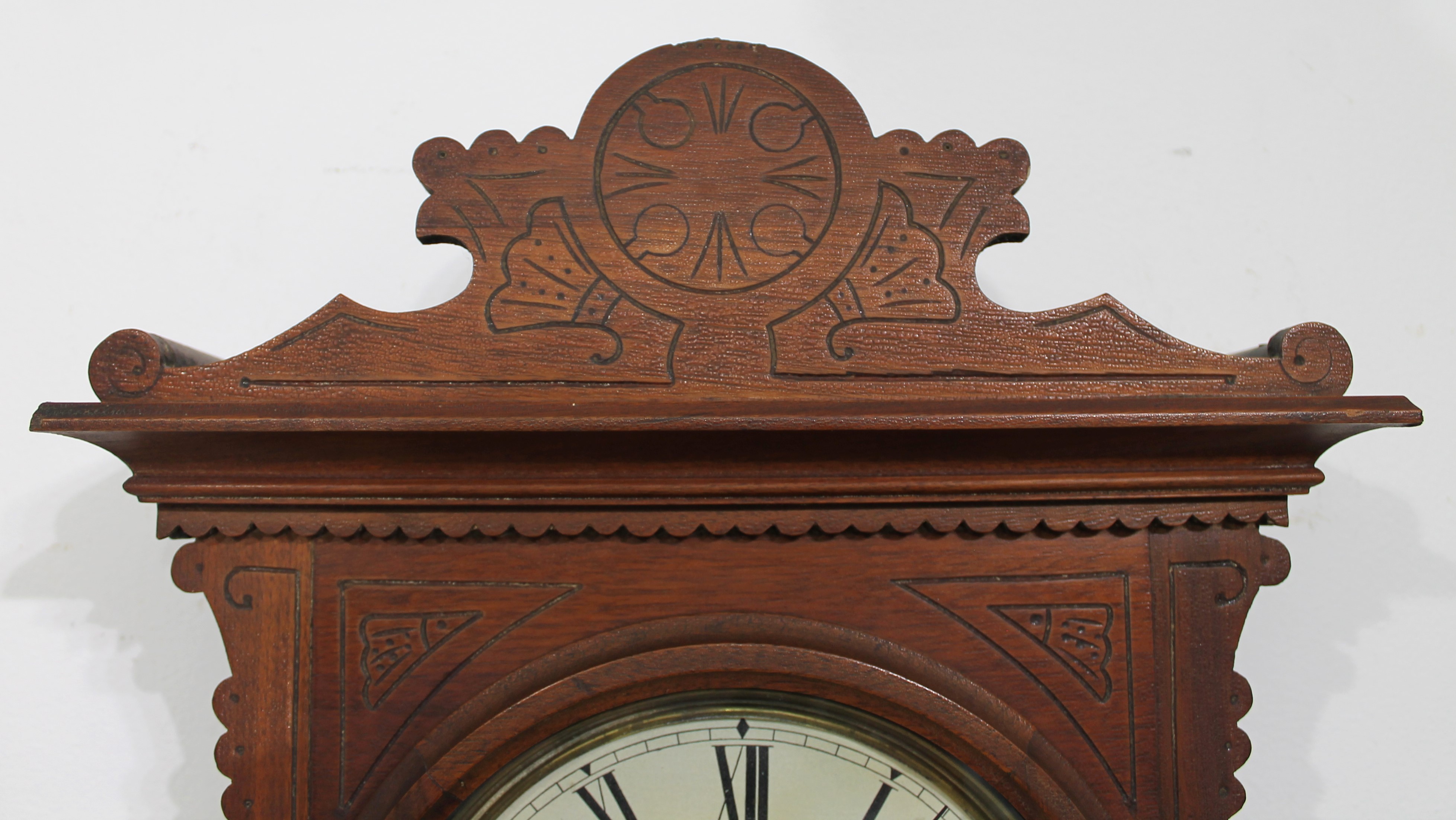 walnut case with an old, alligatored, and likely original finish. The top of the crest has been knocked off but if you didn’t