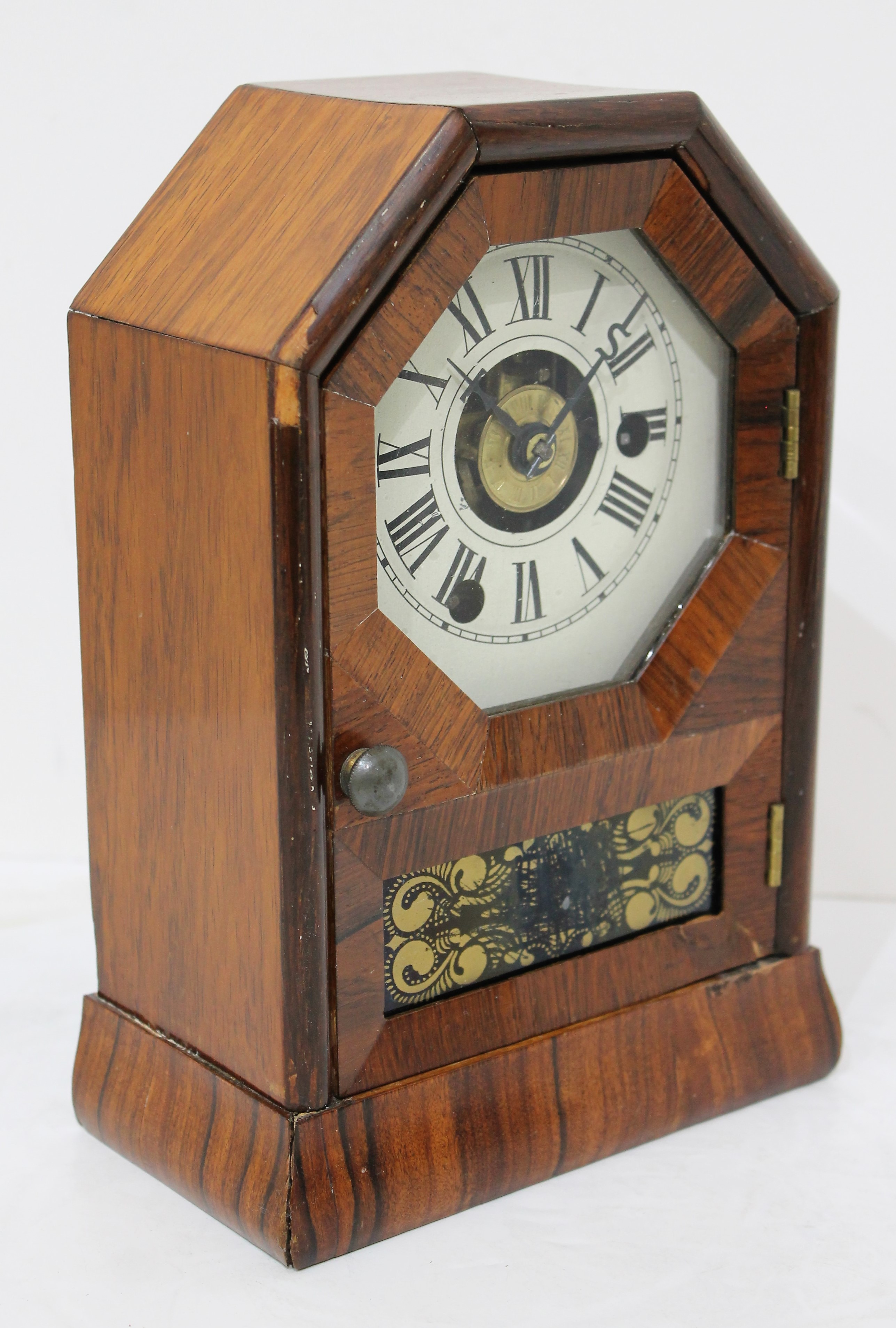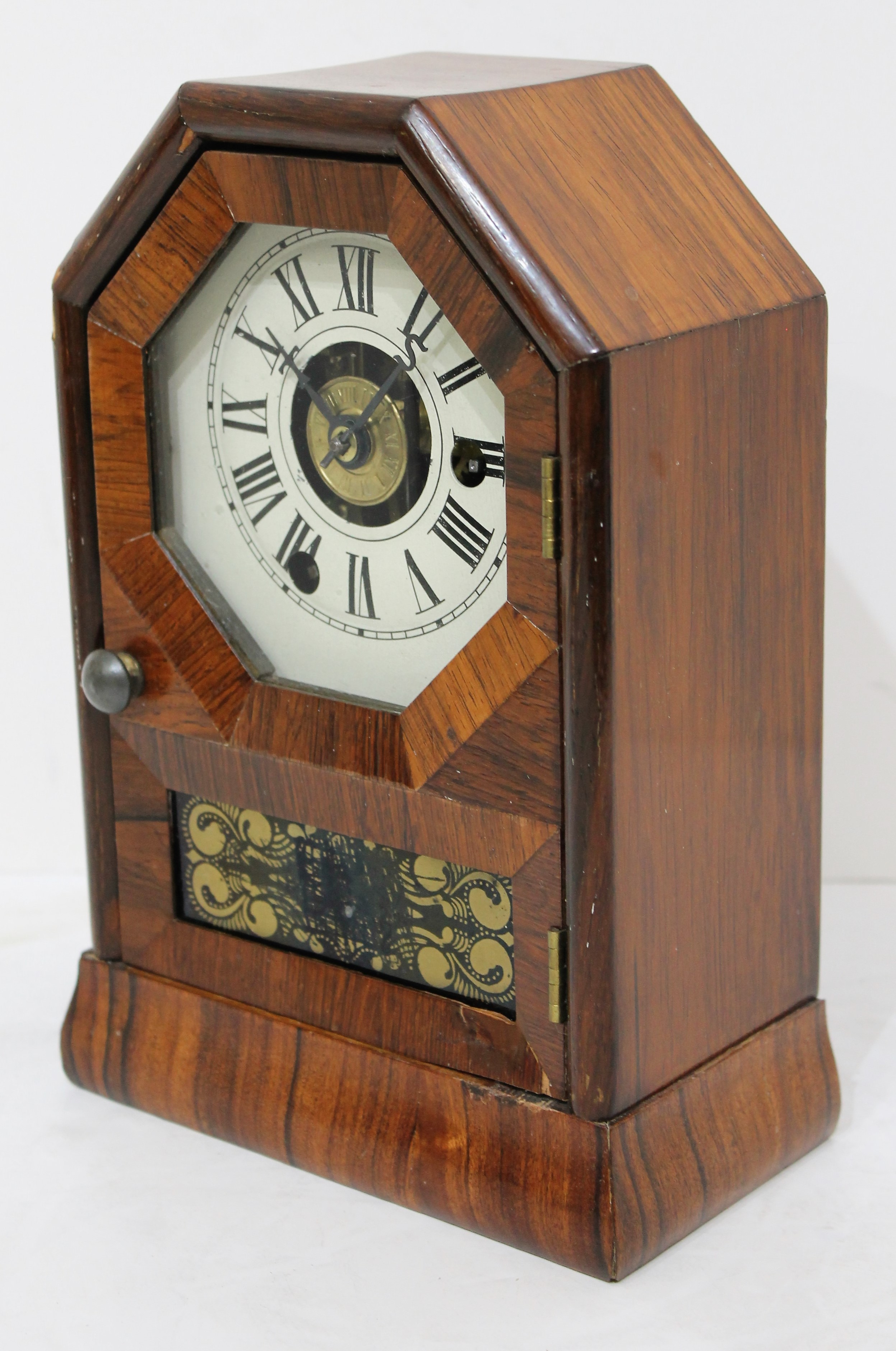 is veneered in rosewood with at Type C 30-hour, time-and-alarm movement signed Plymouth Conn. It is running just fine; the alarm