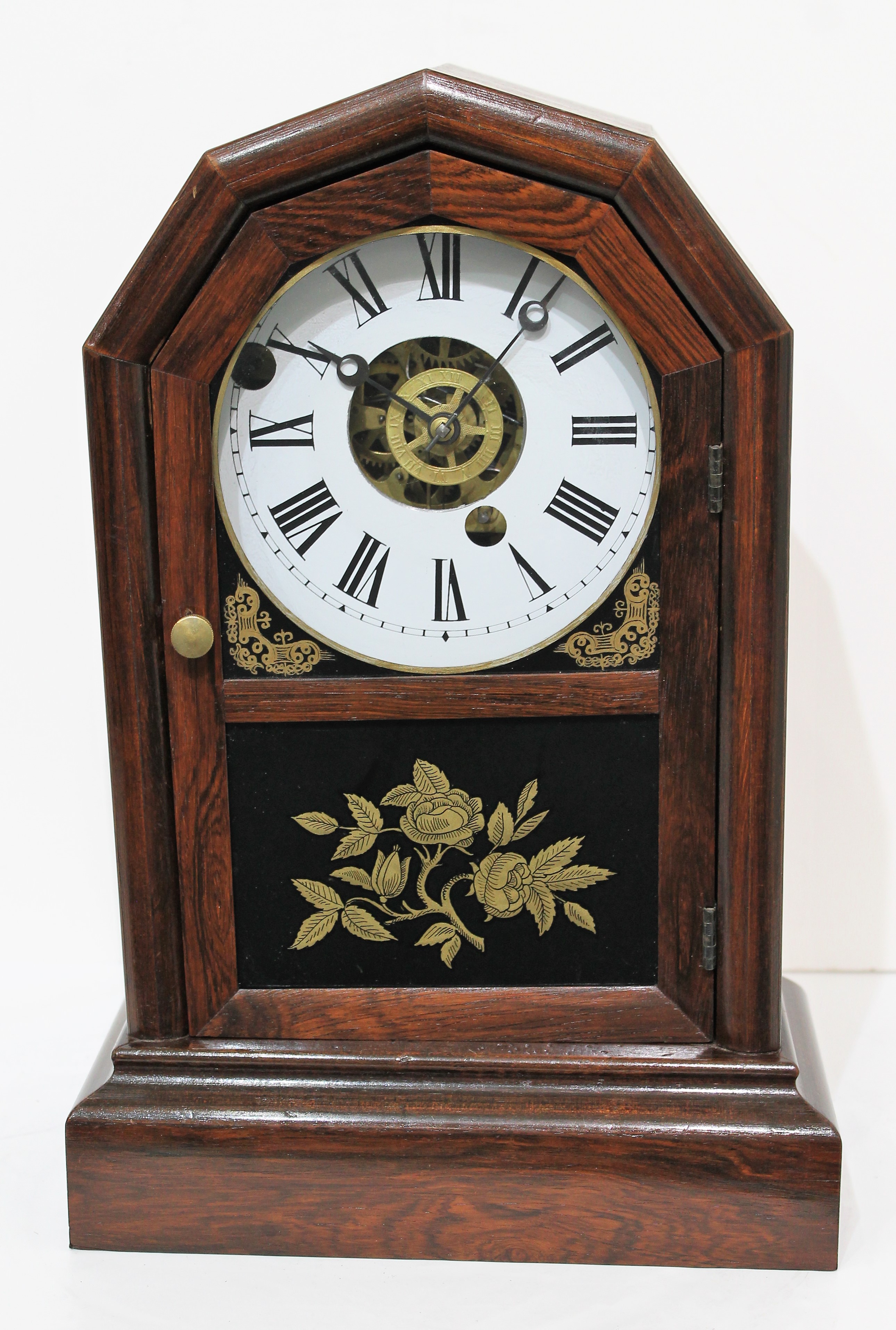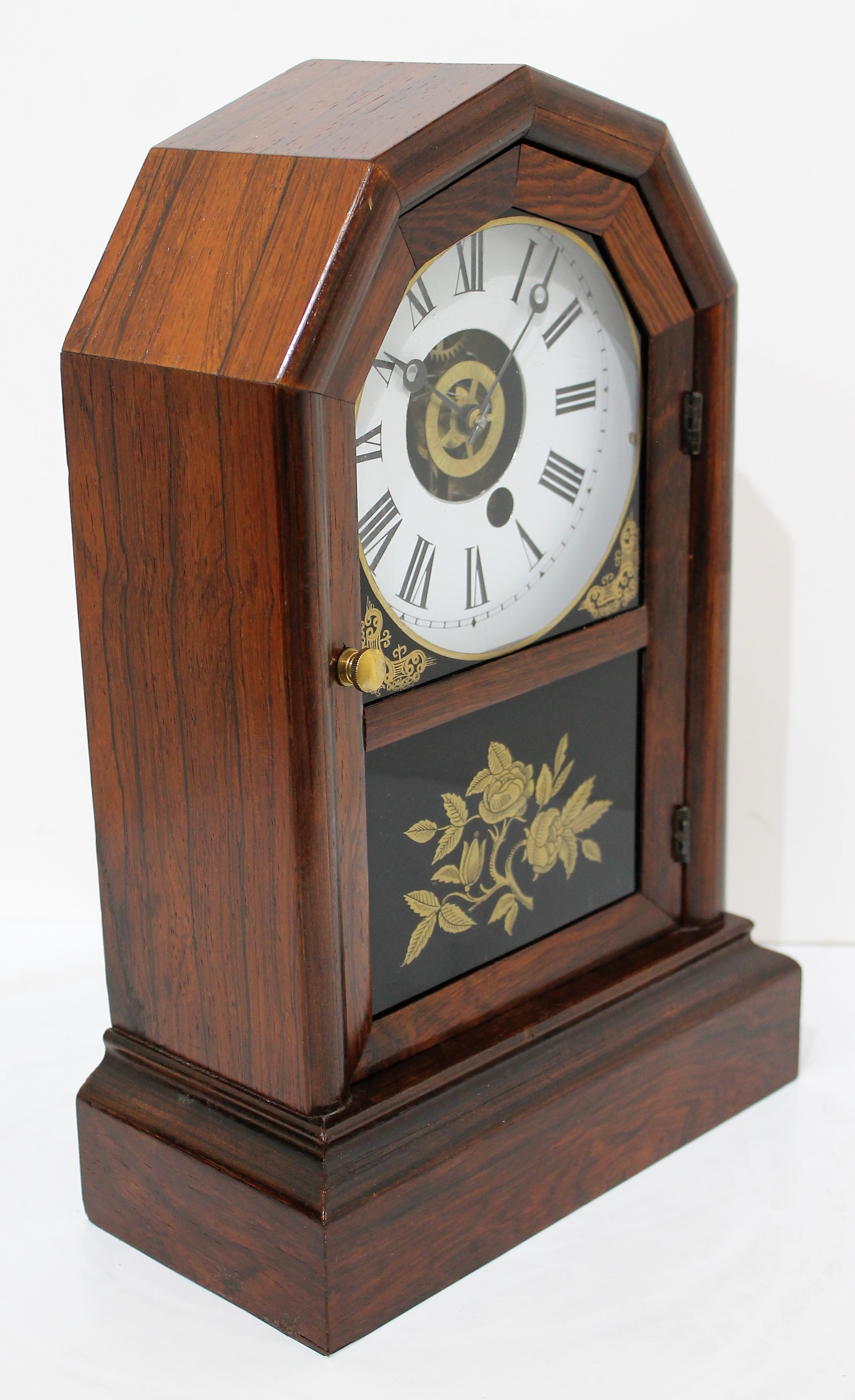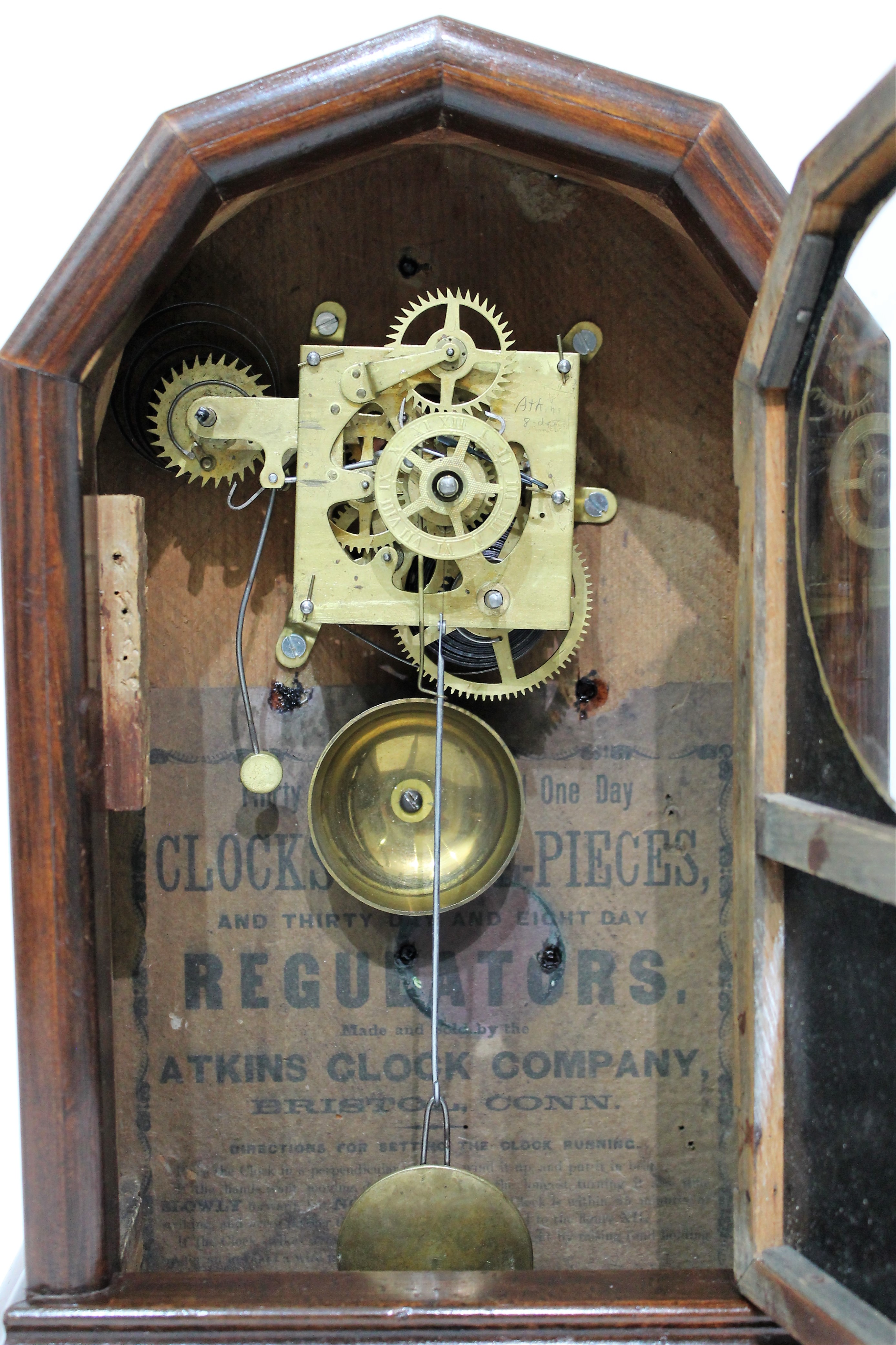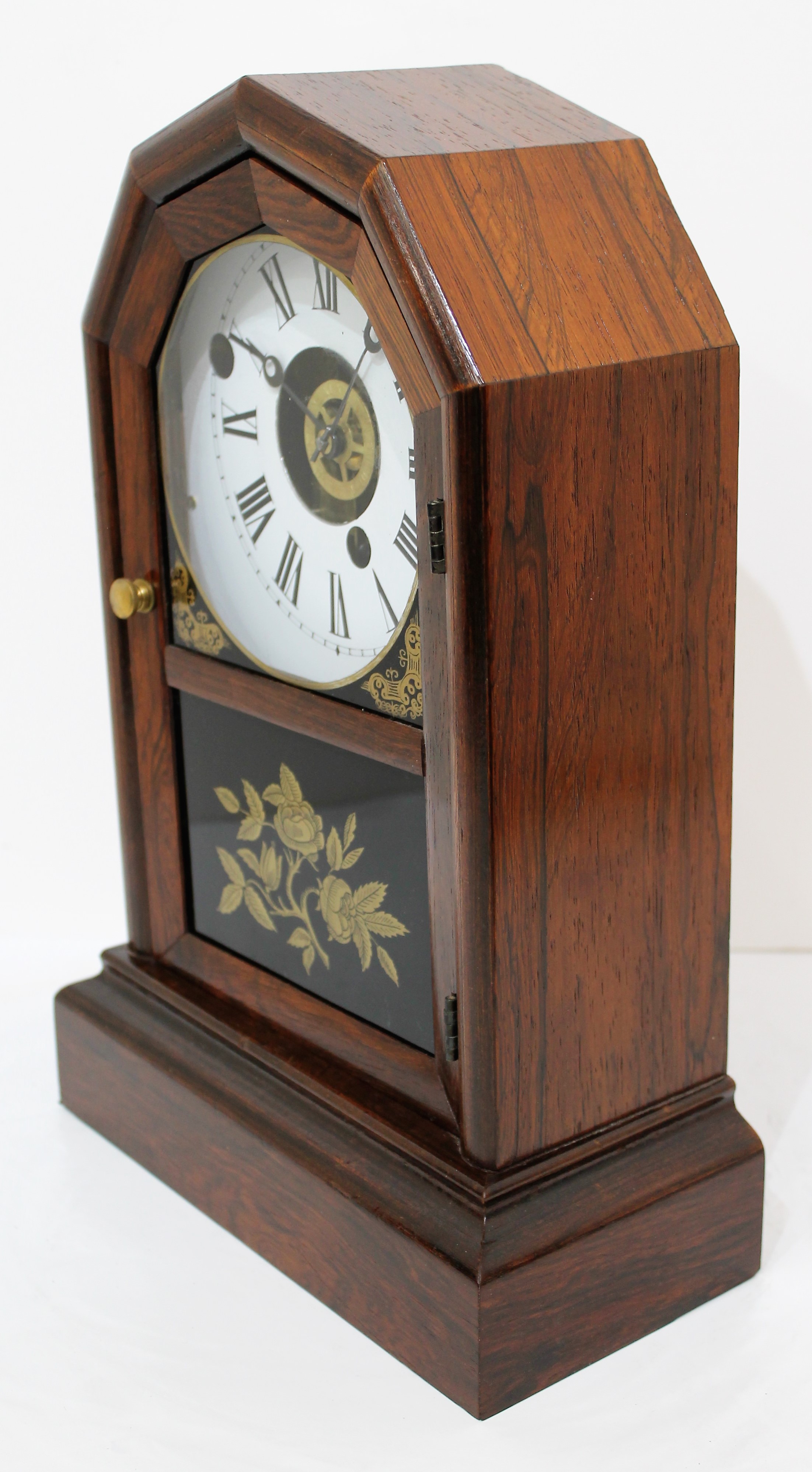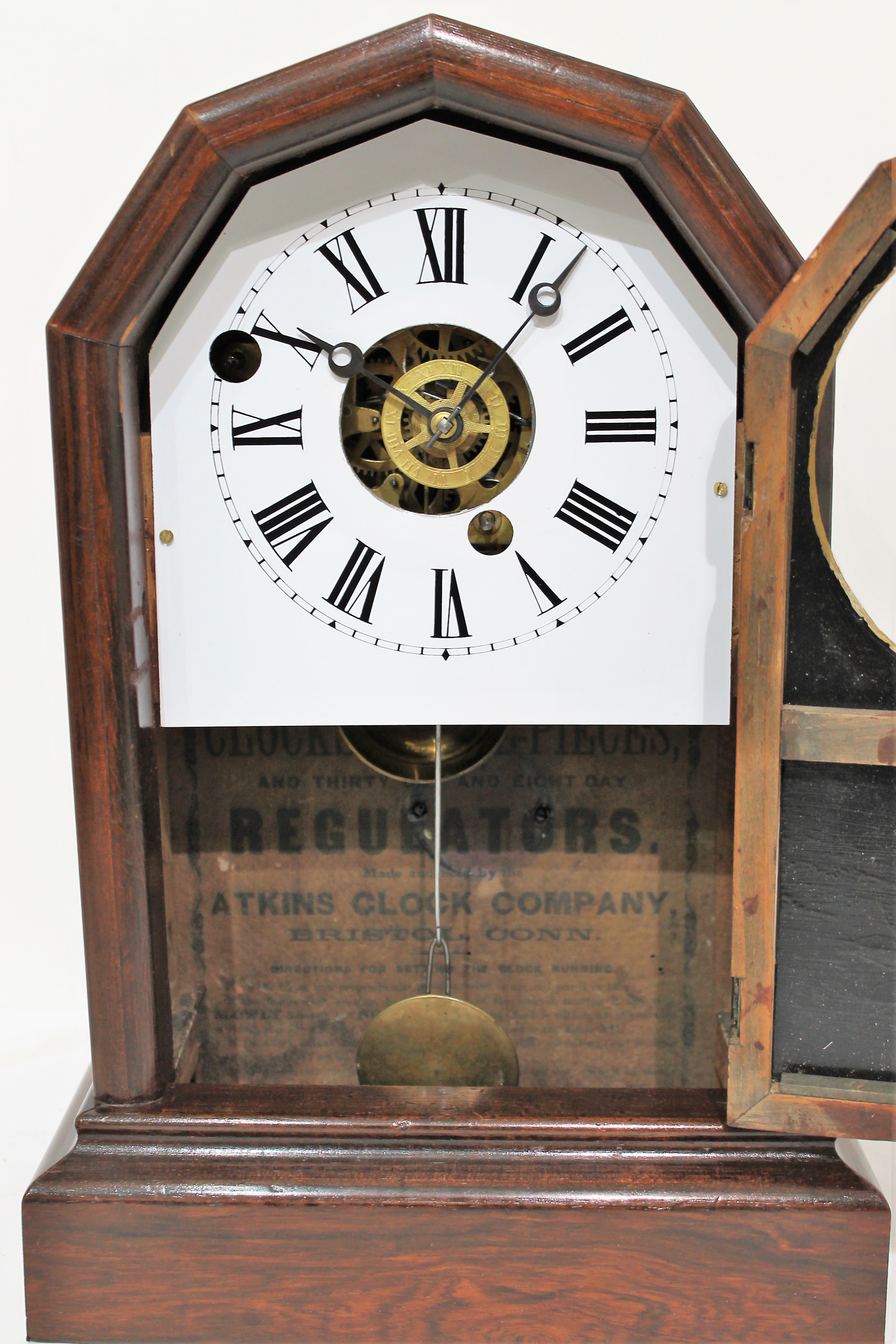 Atkins Clock Co. “Extra Octagon Top” 1859-1879. An Extra Octagon Top, this one unusual for the 8-day time-and-alarm movement. The case is 14 inches tall, veneered in rosewood;