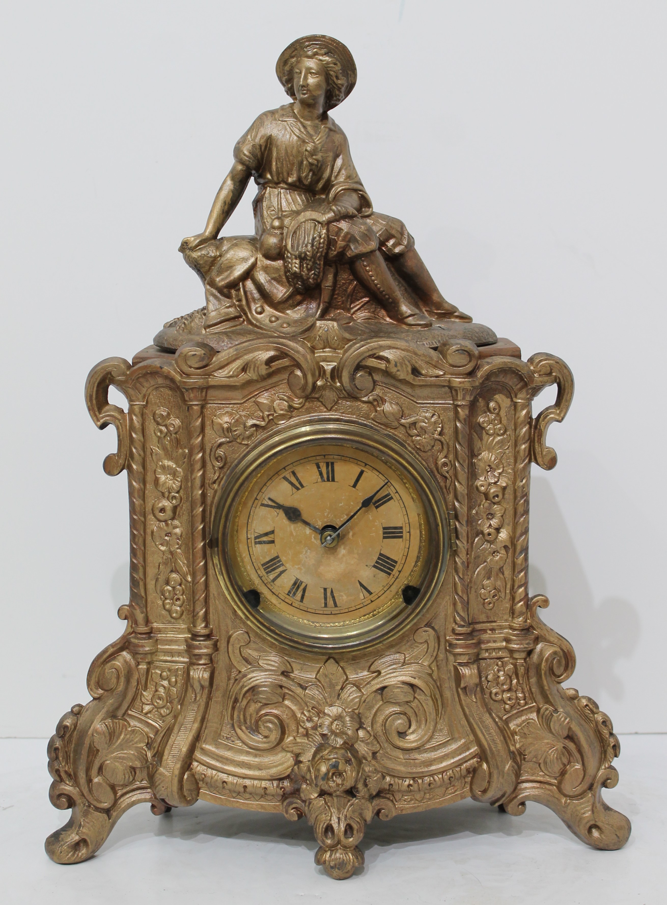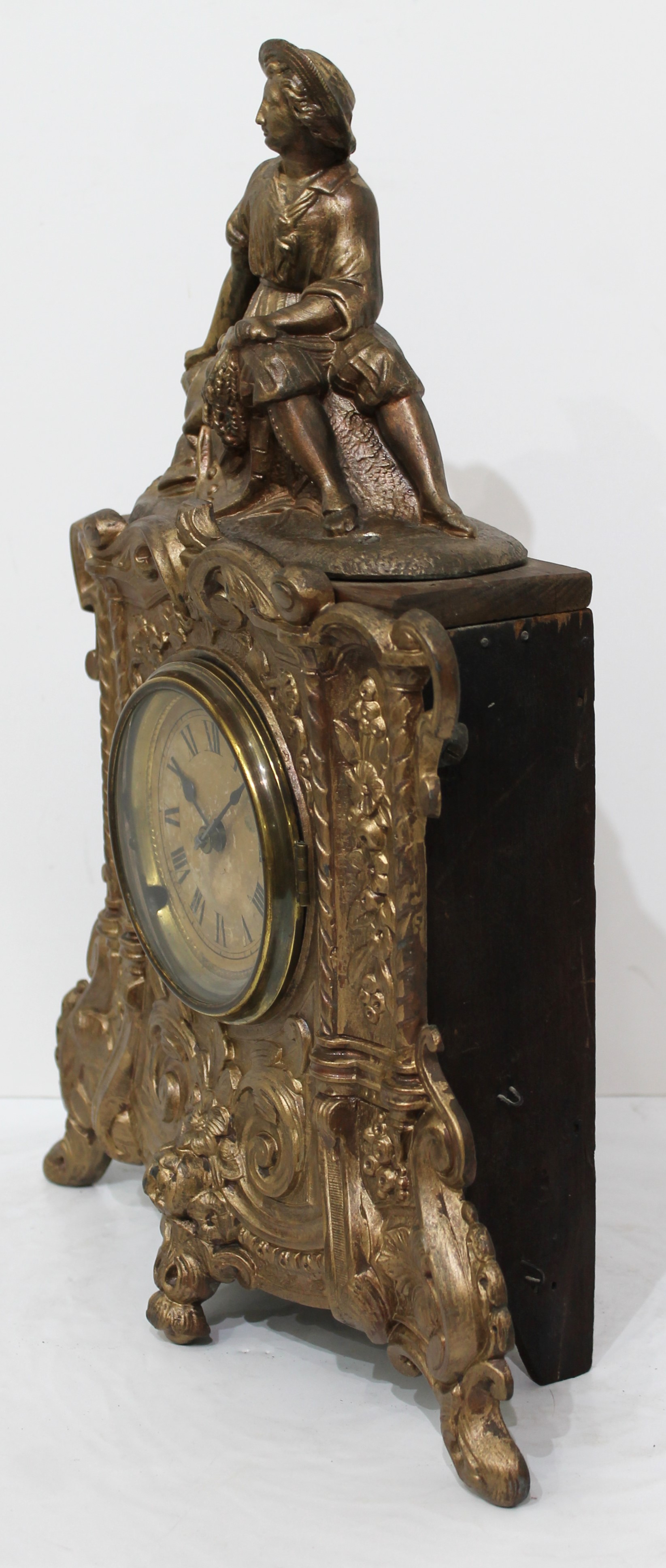 the wooden box and is separate from the spelter metal case-front. Both have been painted/touched up. The dial glass is