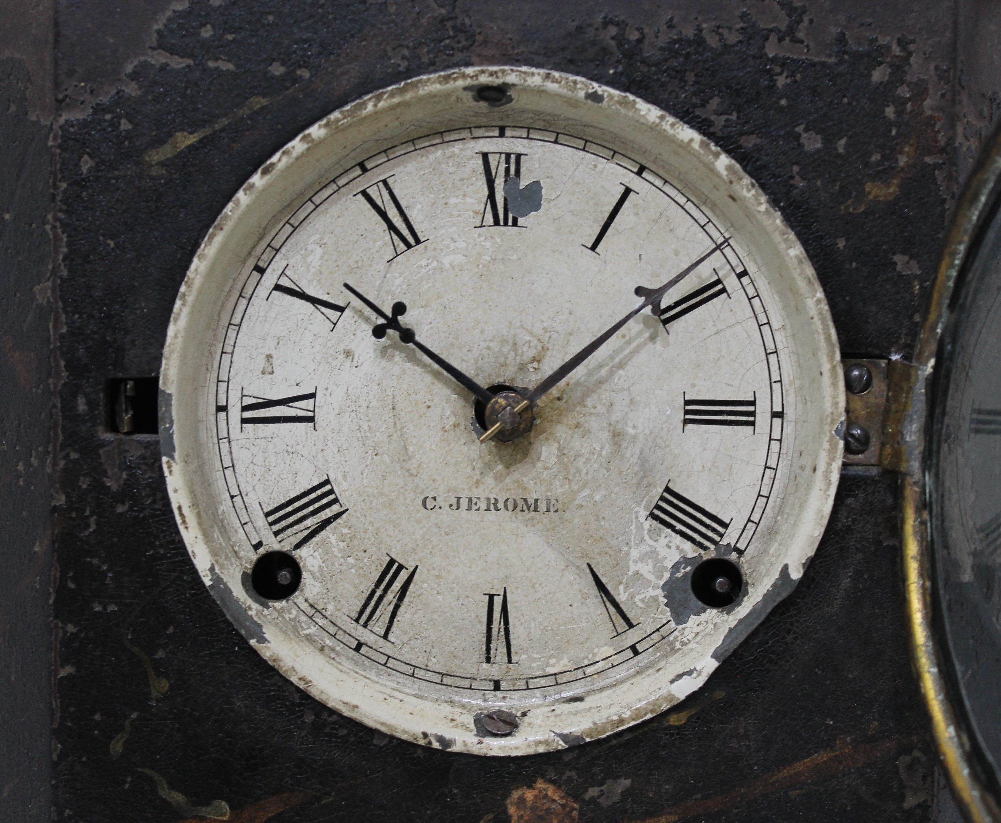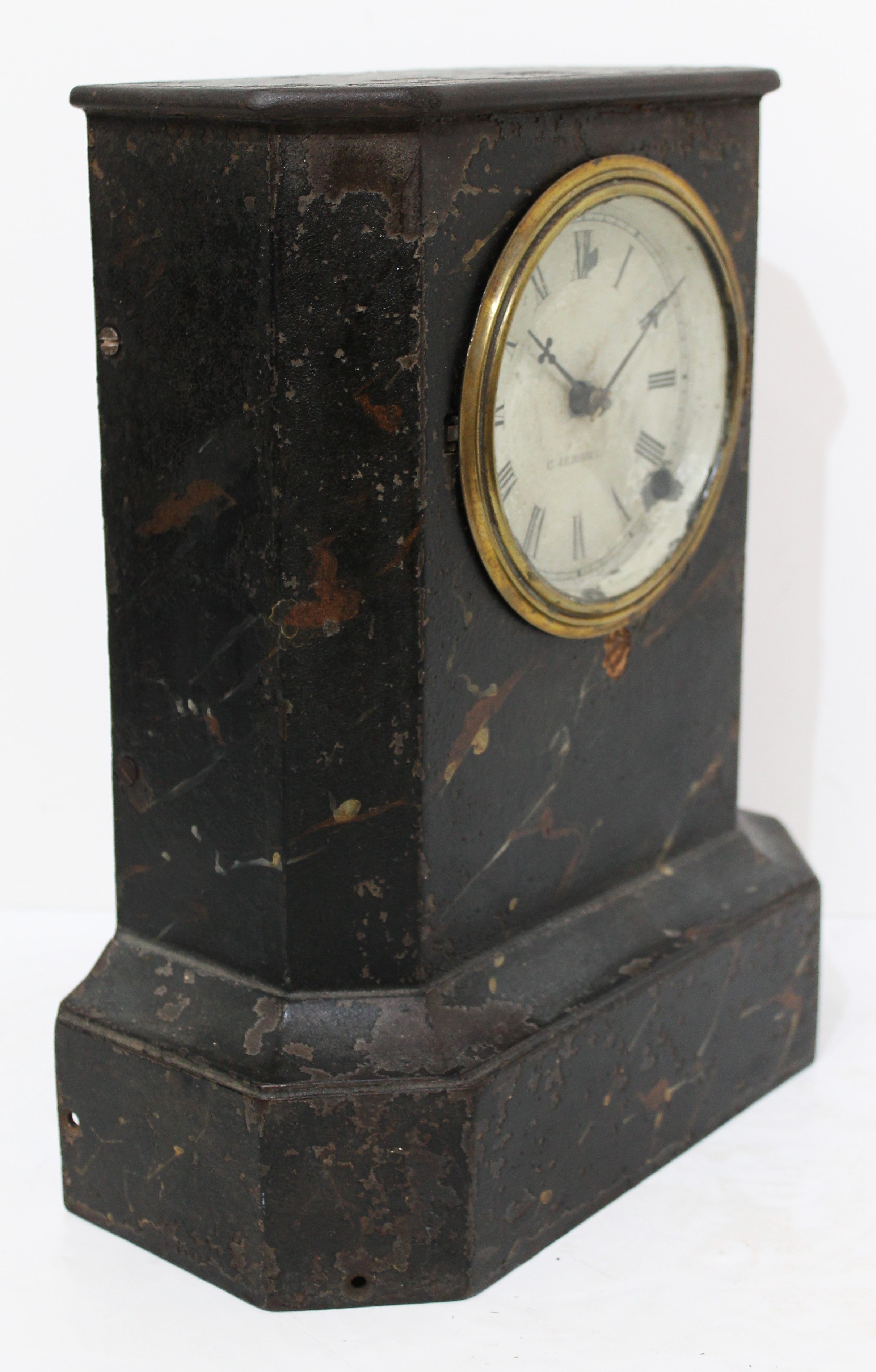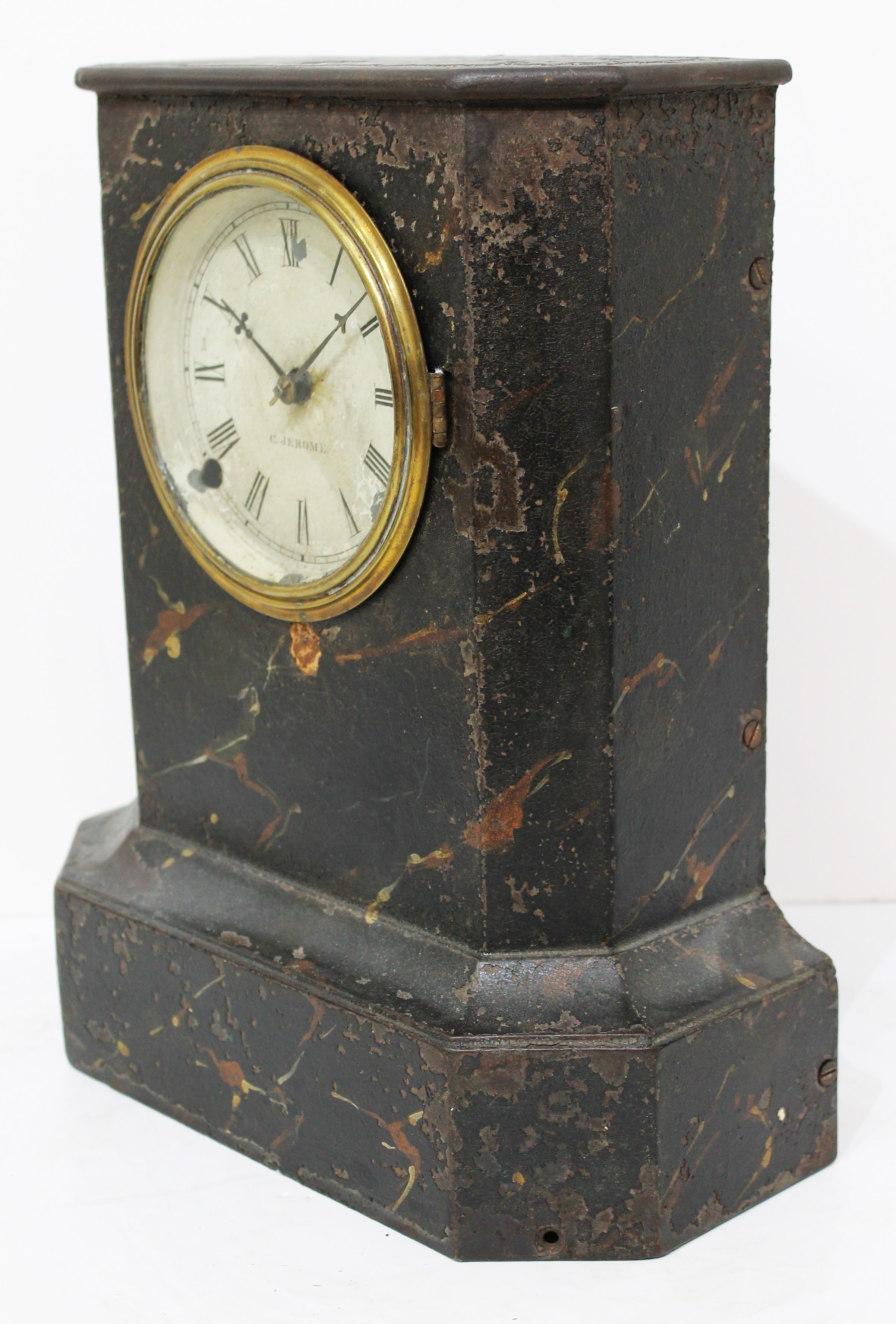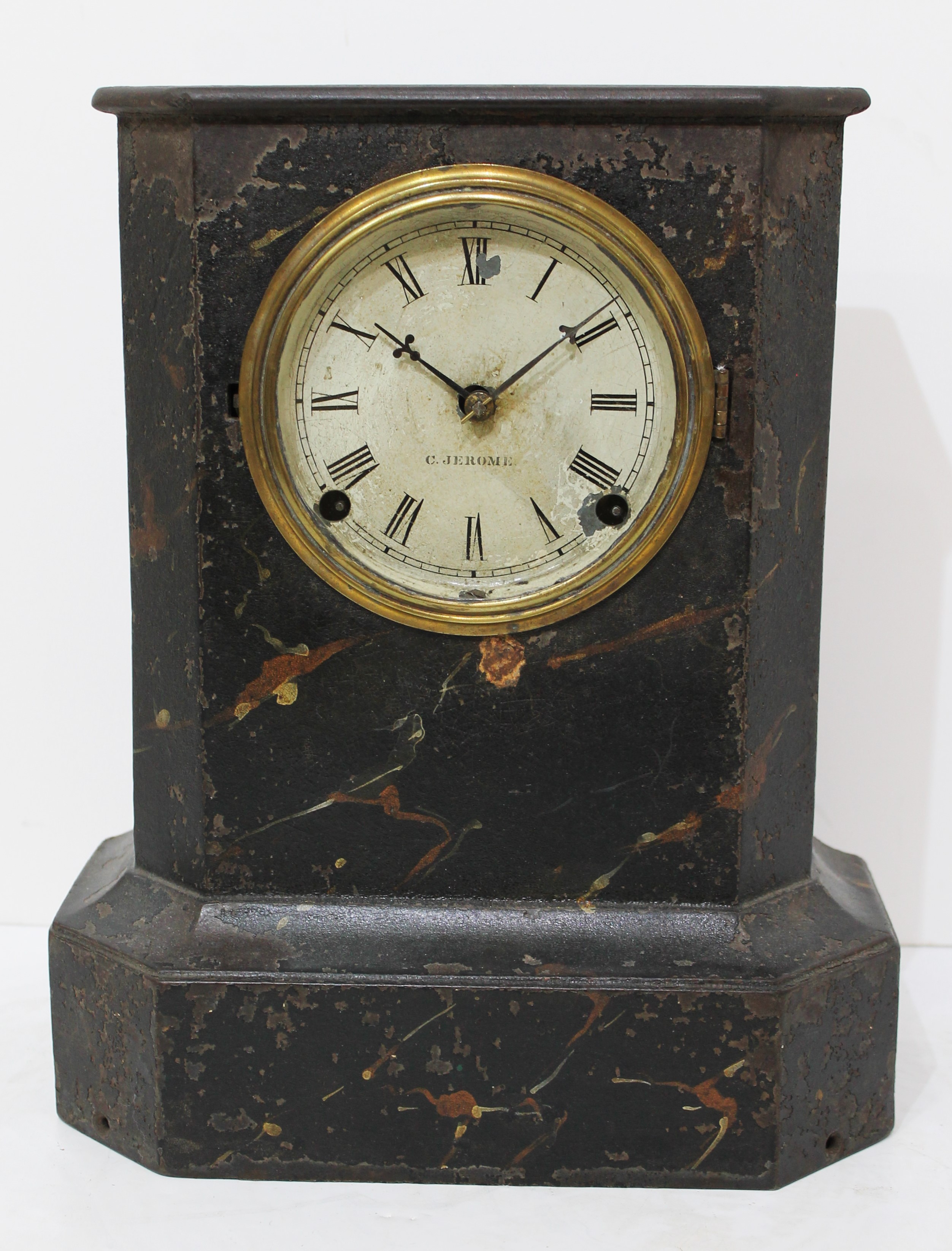 iron case painted black with a faux marble finish. Considerable loss to the finish. The dial glass is period, in a brass