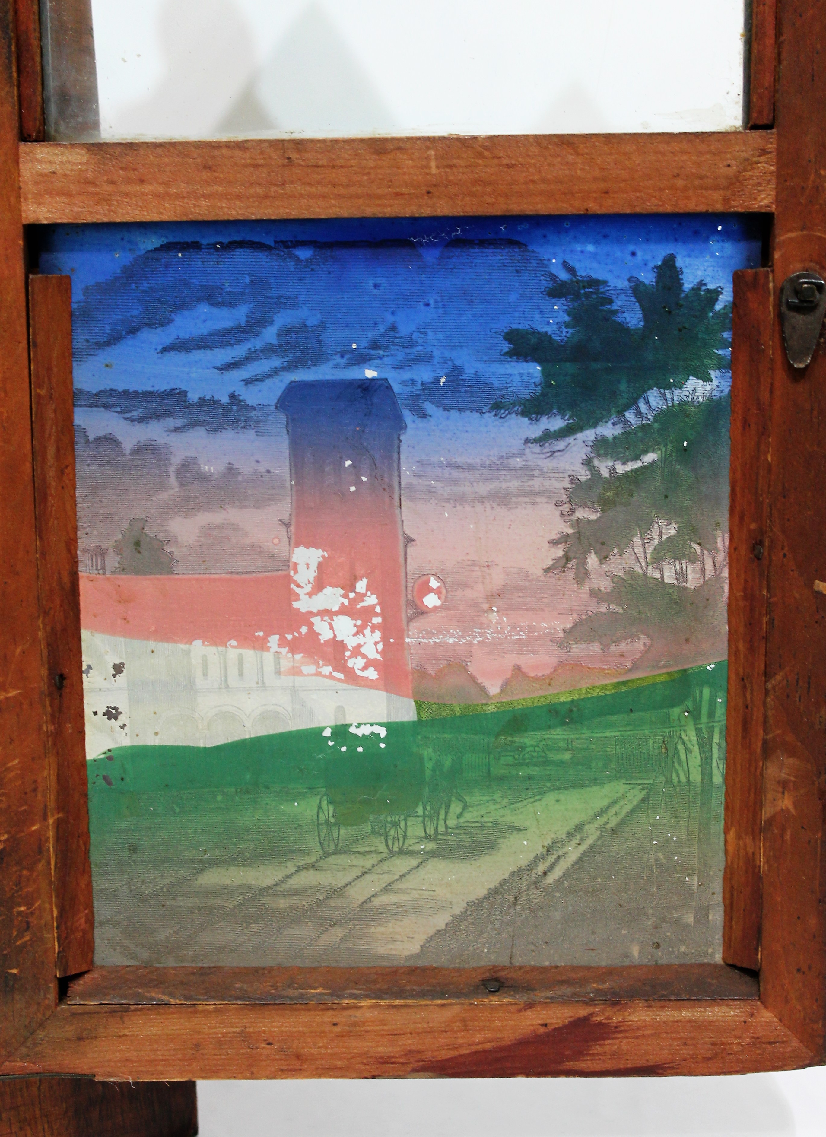 have been rather crudely decapitated. Not good. Both glasses are old, the lithograph tablet in excellent condition. I do not recognize the image. The metal dial has been repainted and crudely numbered; the hands are period/original. The