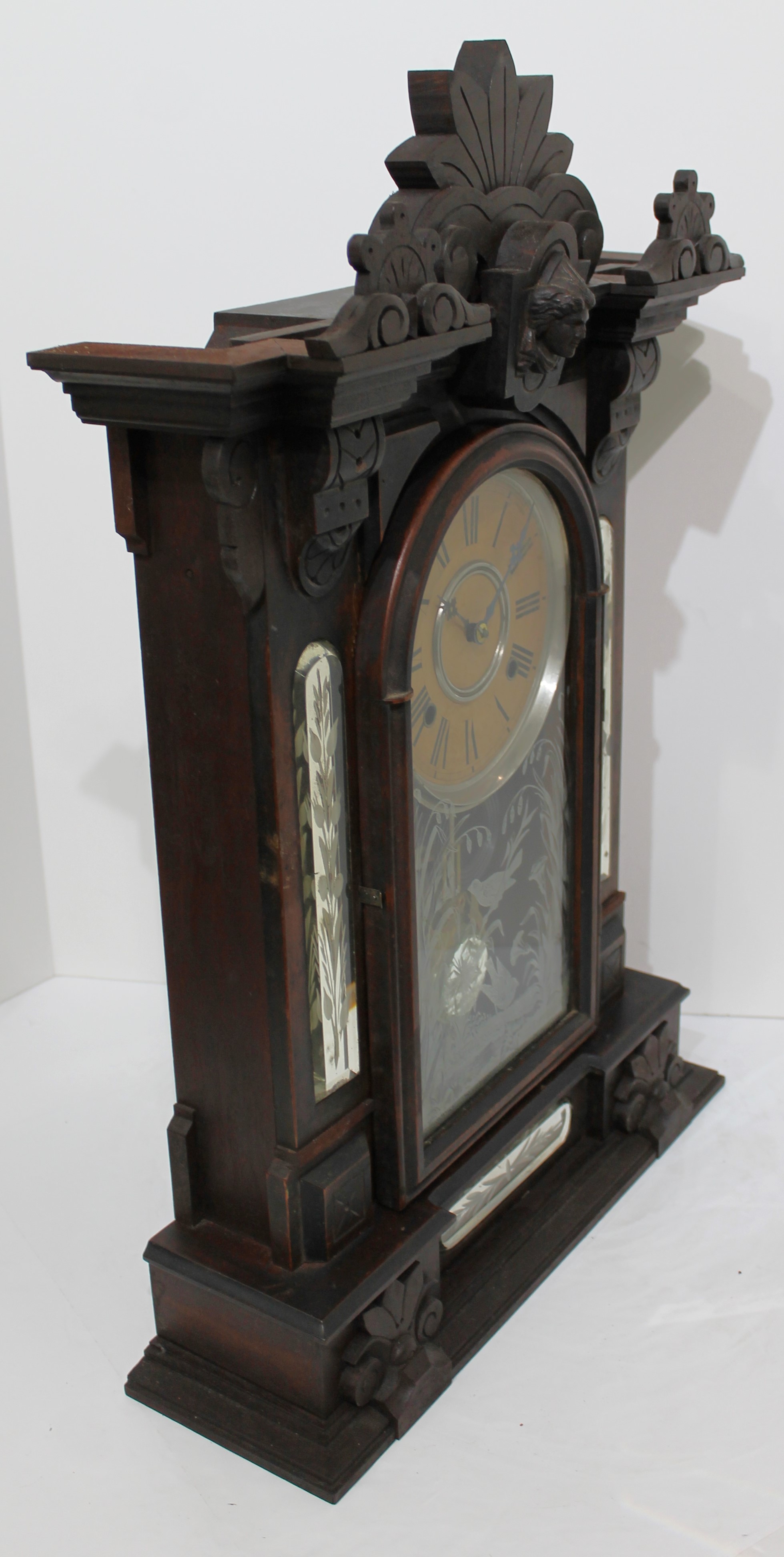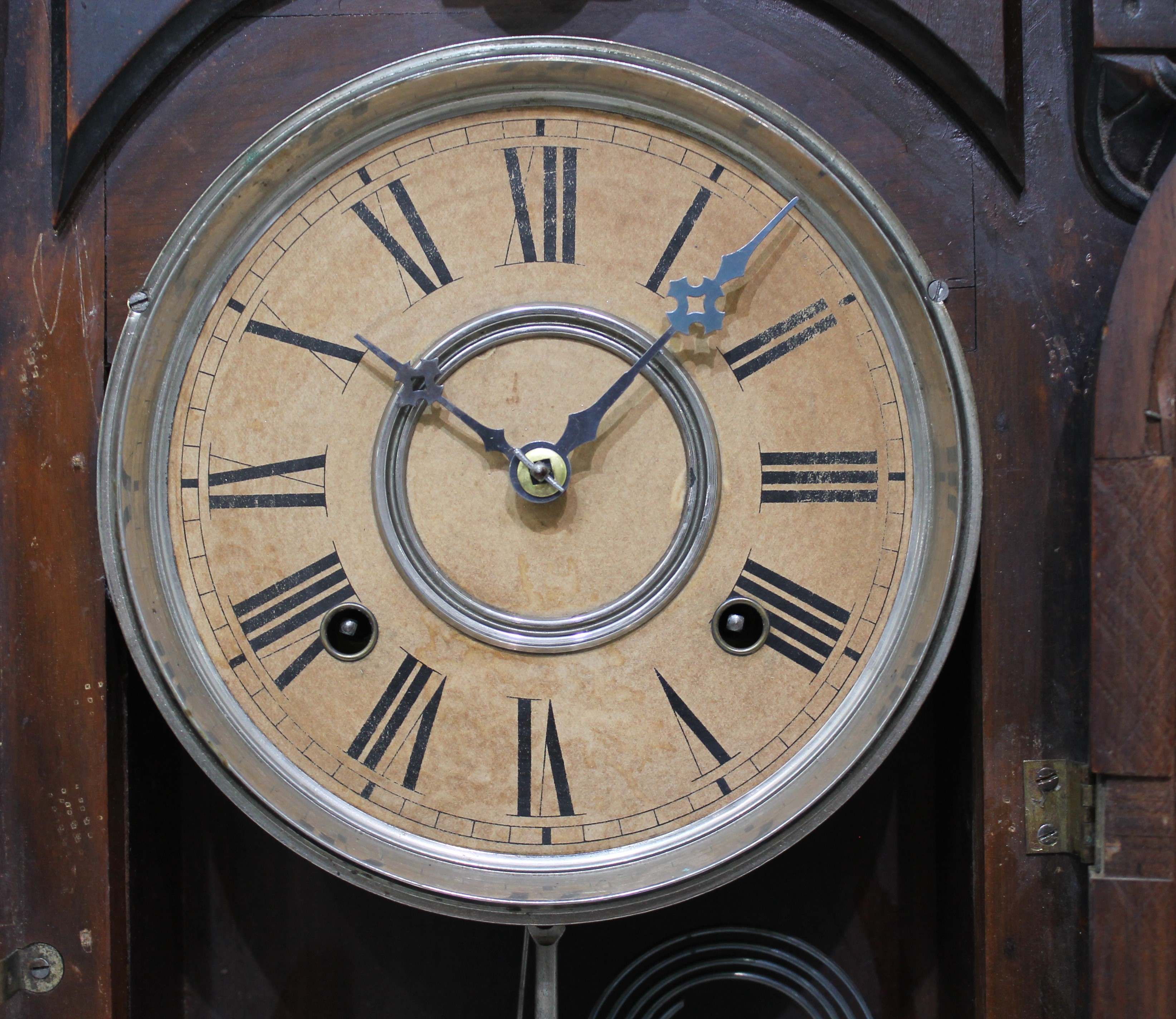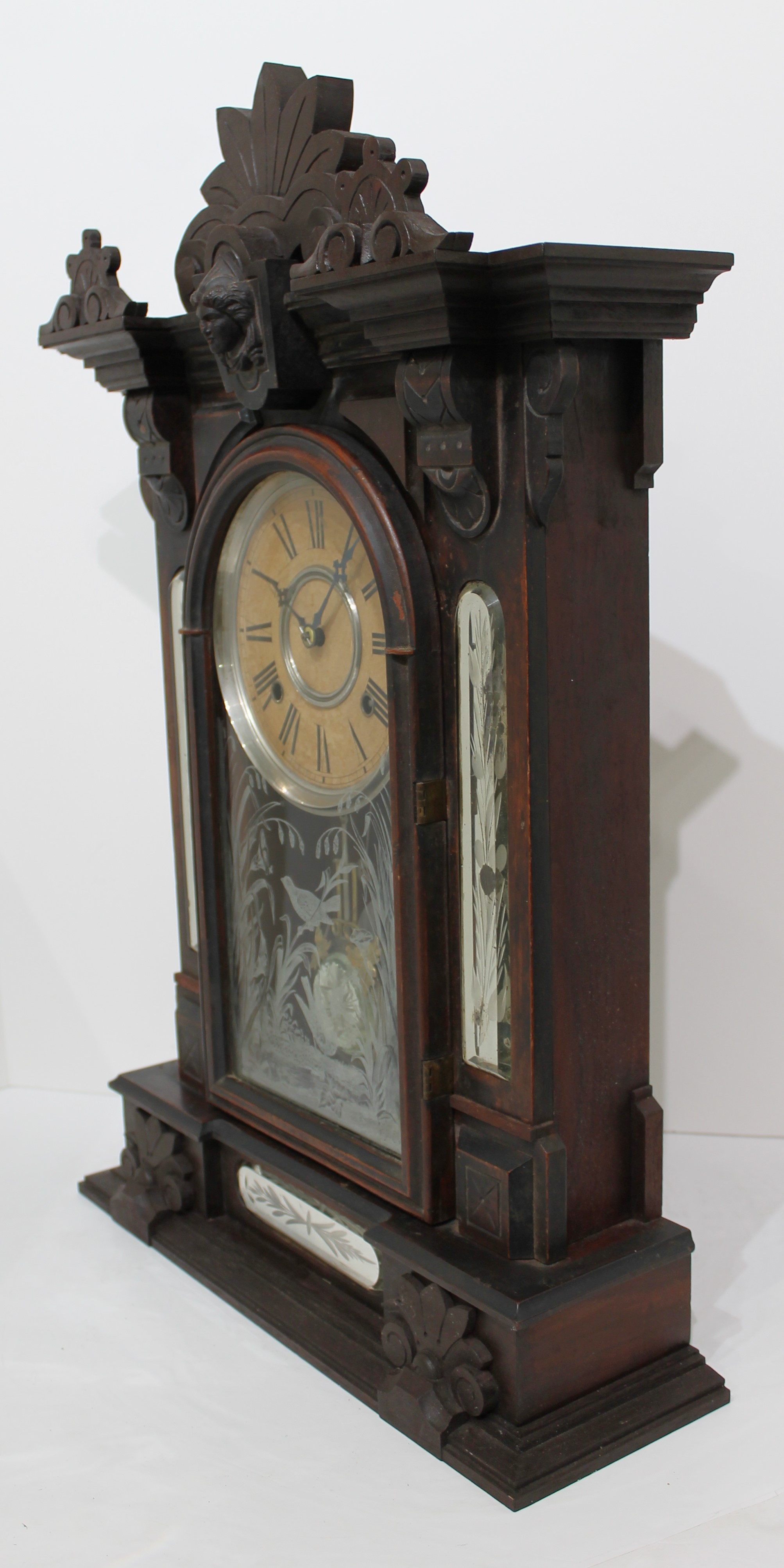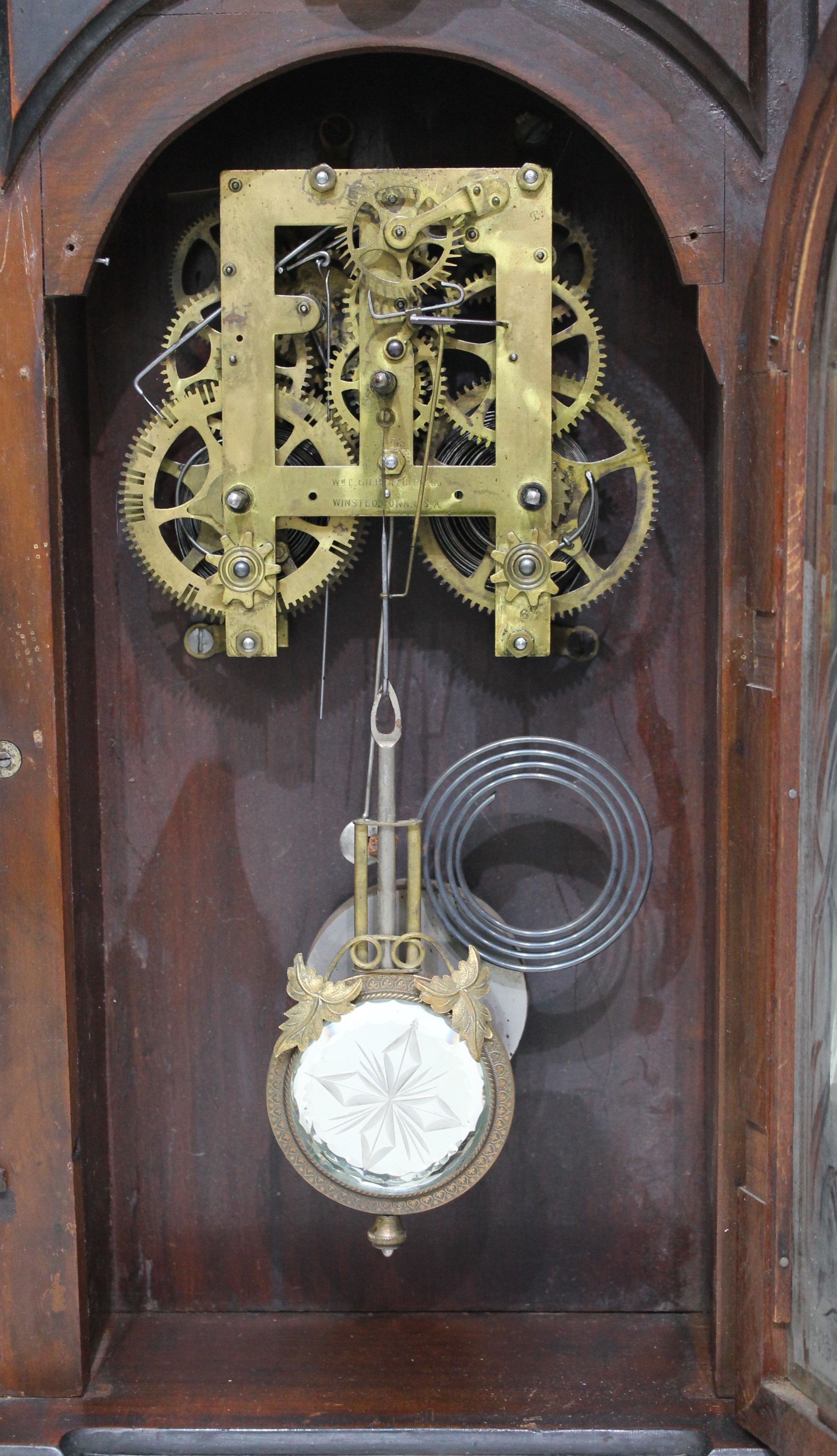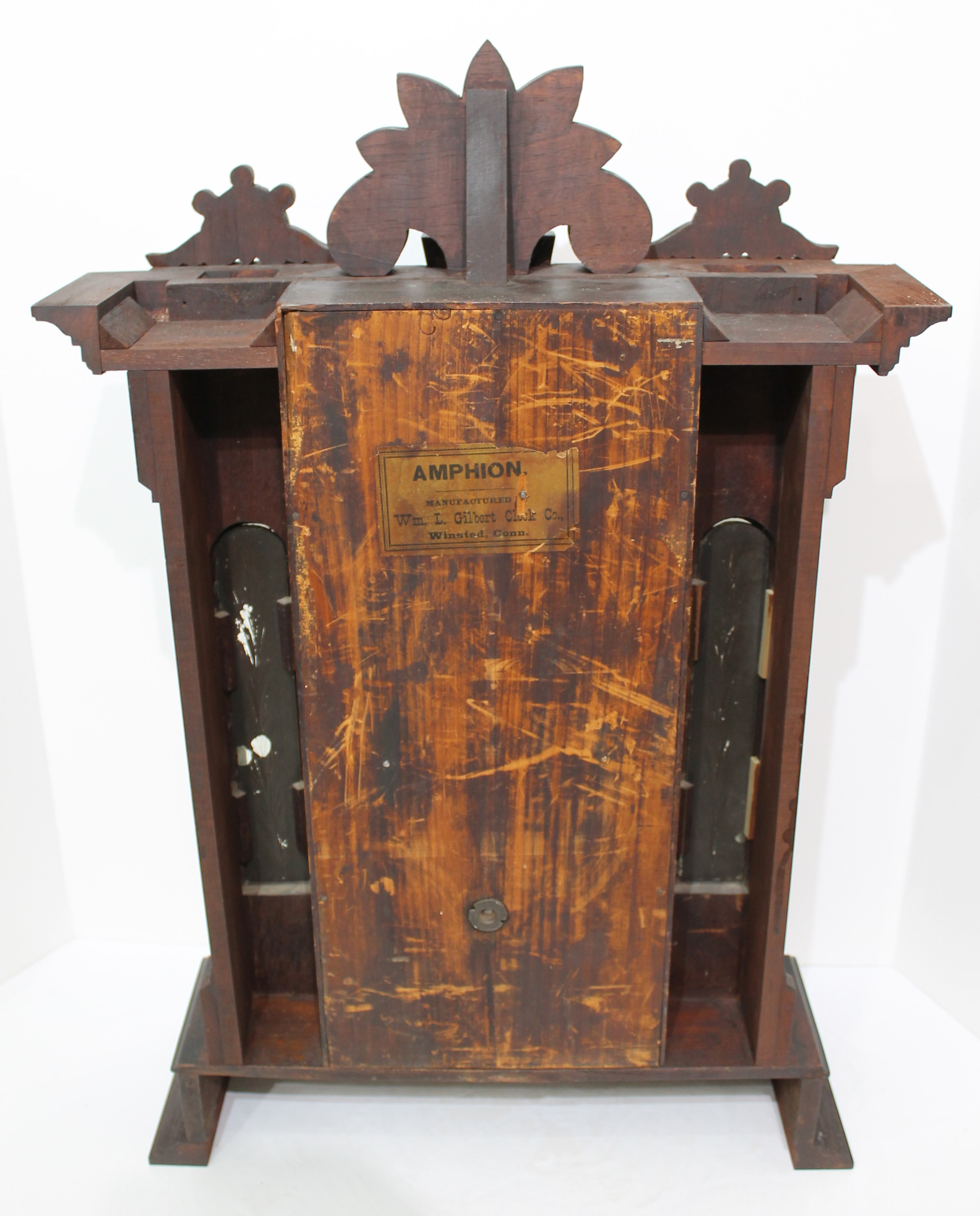Wm. Gilbert Clock Co. “Amphion”, ca. 1885. The 25-inch walnut case has undergone considerable restoration: the crest and the base, with their ornamental elements, are replacements; the figure head and mount may be original. The upper right decorative piece and the upper left trim piece are also replacements. The original casework has a considerable patina. On the positive side, the mirrors are original and the door glass is probably so. The paper dial is strongly toned, the hands are correct, but the minute hand is a replacement. The Gilbert 8-day, time and half-hour strike movement is running and striking without problem, regulated by the Amphion cut-glass mirror pendulum. There is a good label on the back. Original Amphions sell for $400-$800. $200-$400.