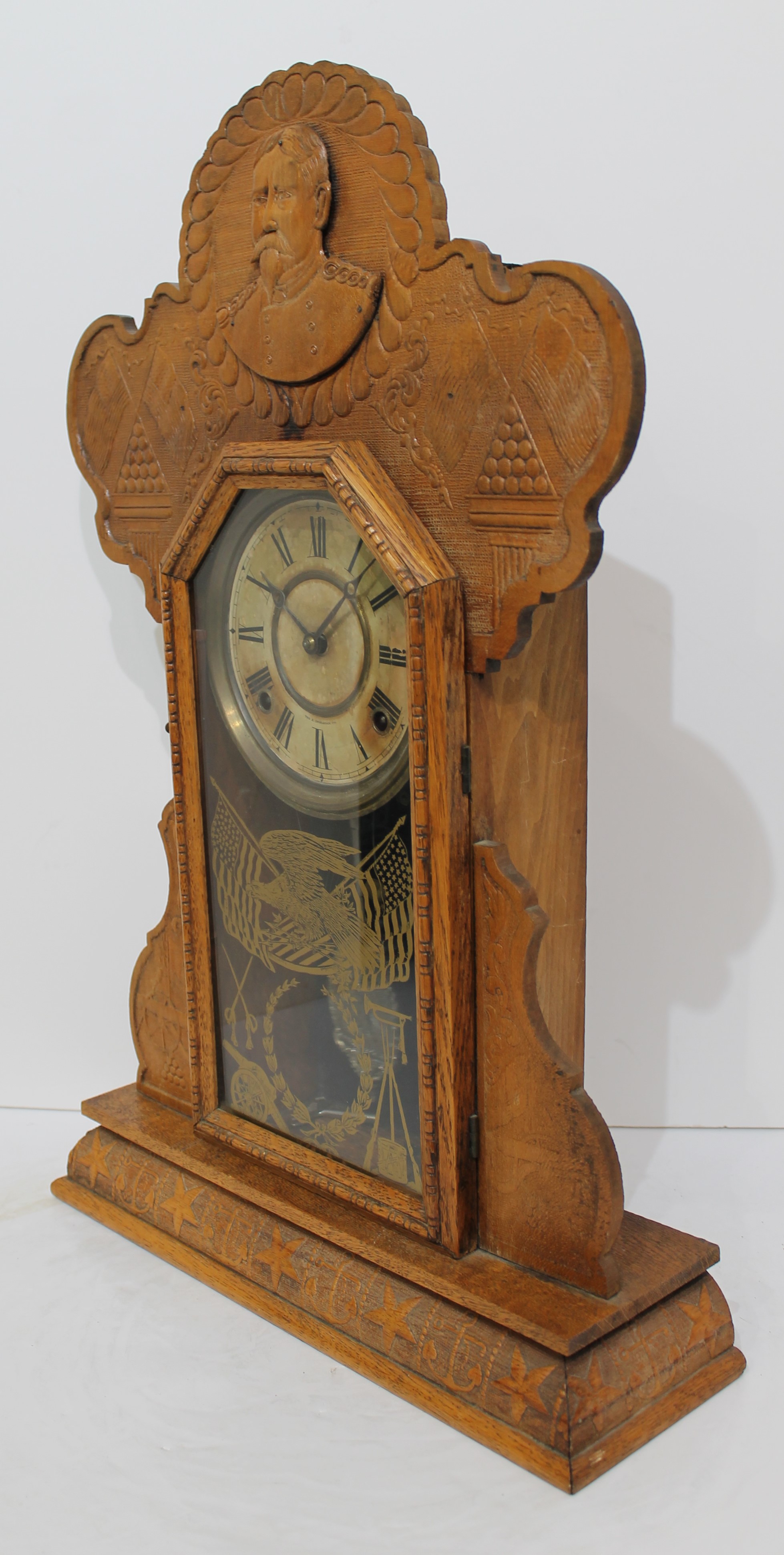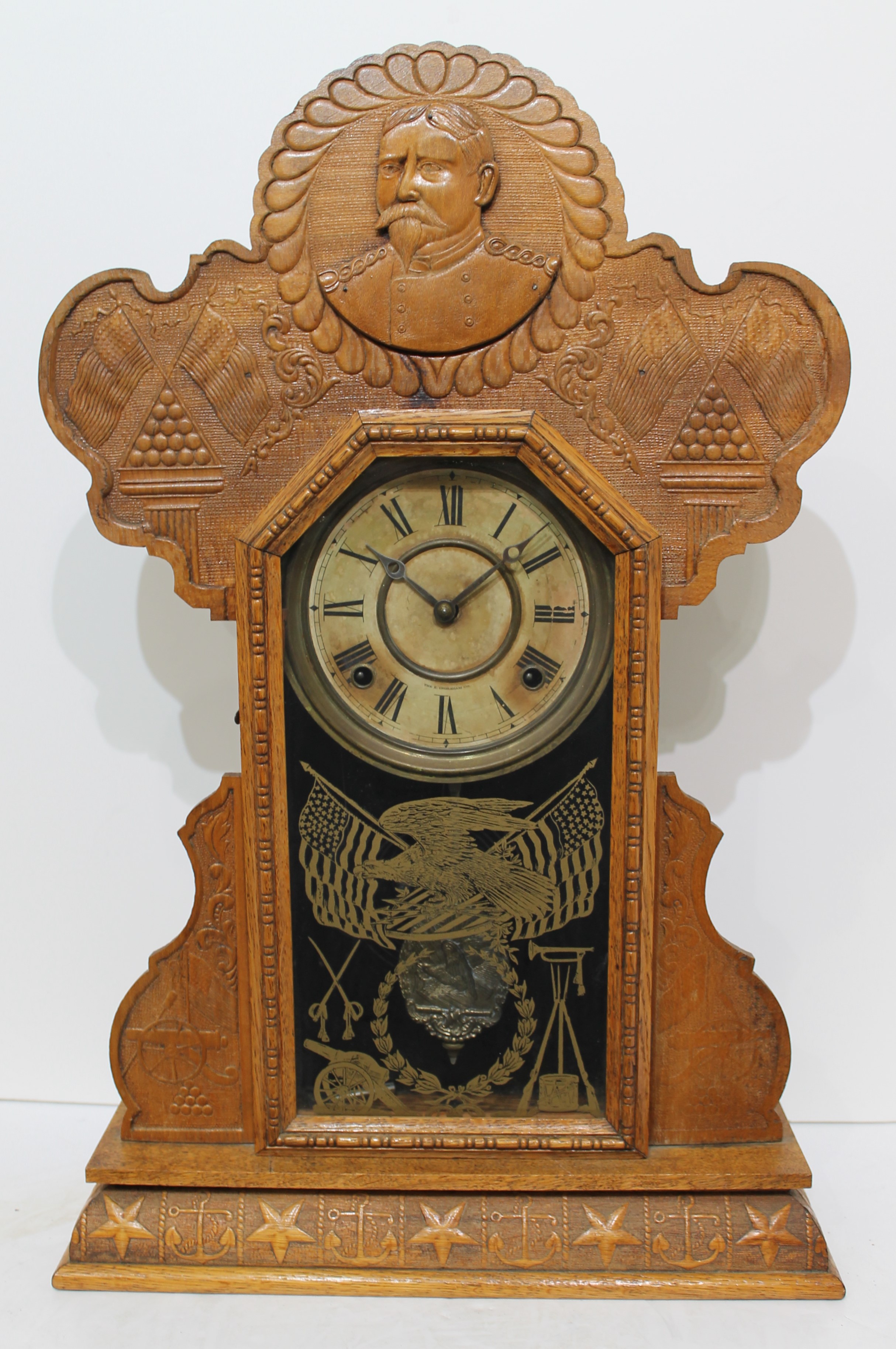 The Lee is one of the more difficult “Spanish-American War series” clocks to find. The 23-inch pressed wood oak case has been