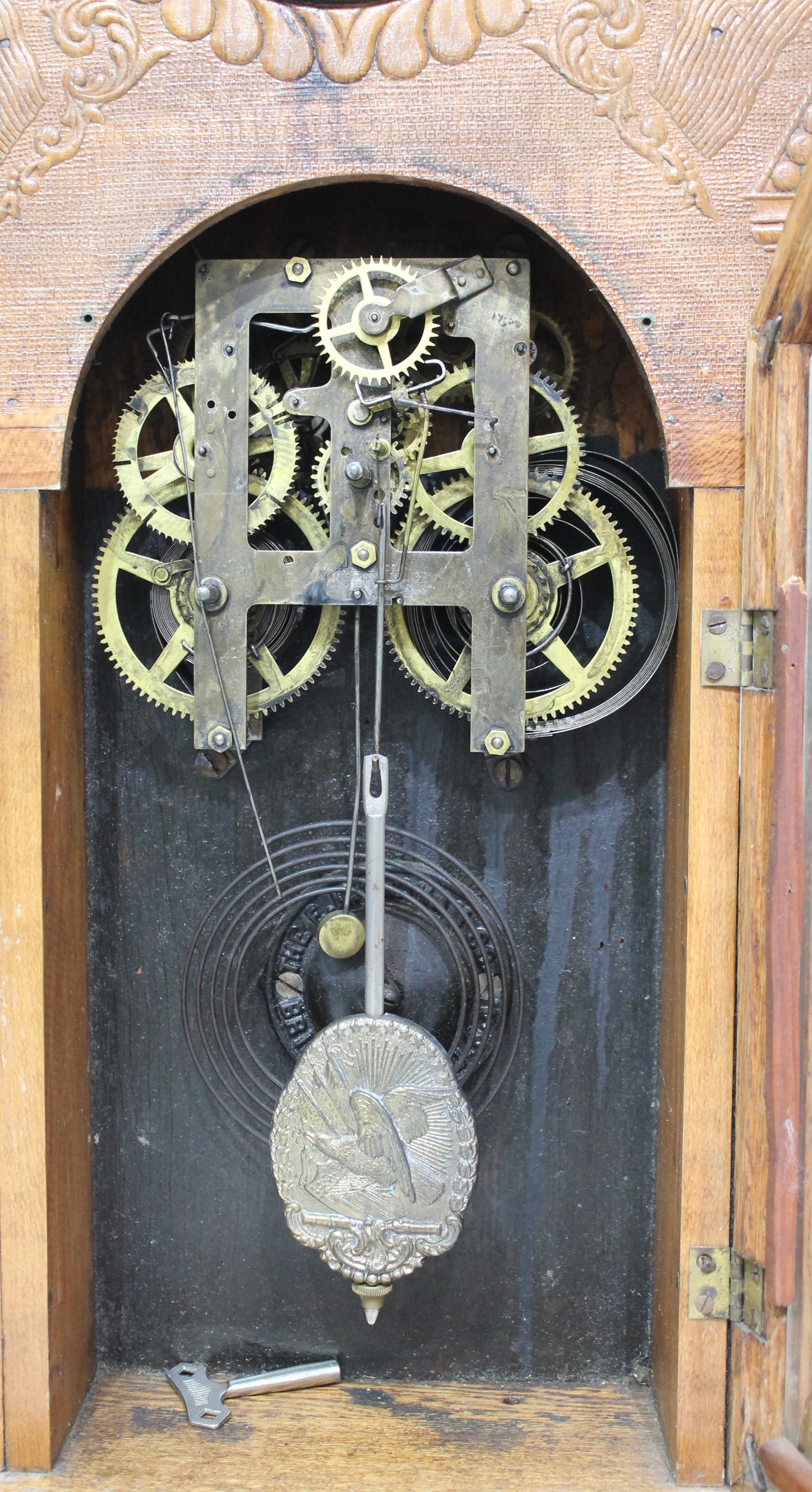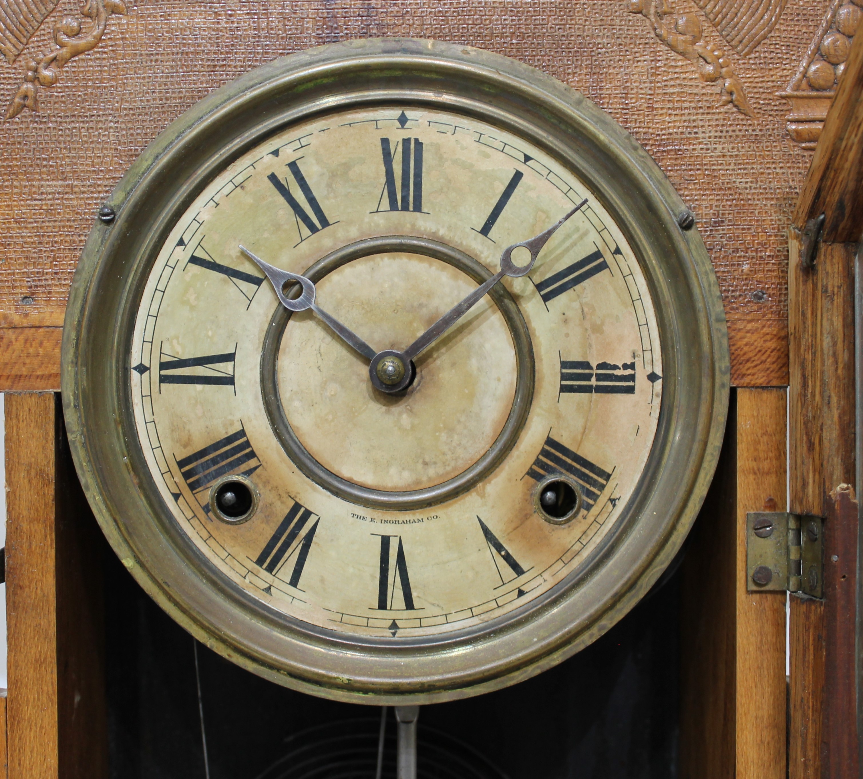 is working, striking on a wire gong on an Ingraham base. The ‘eagle and shield’ bronze pendulum is correct. There is an