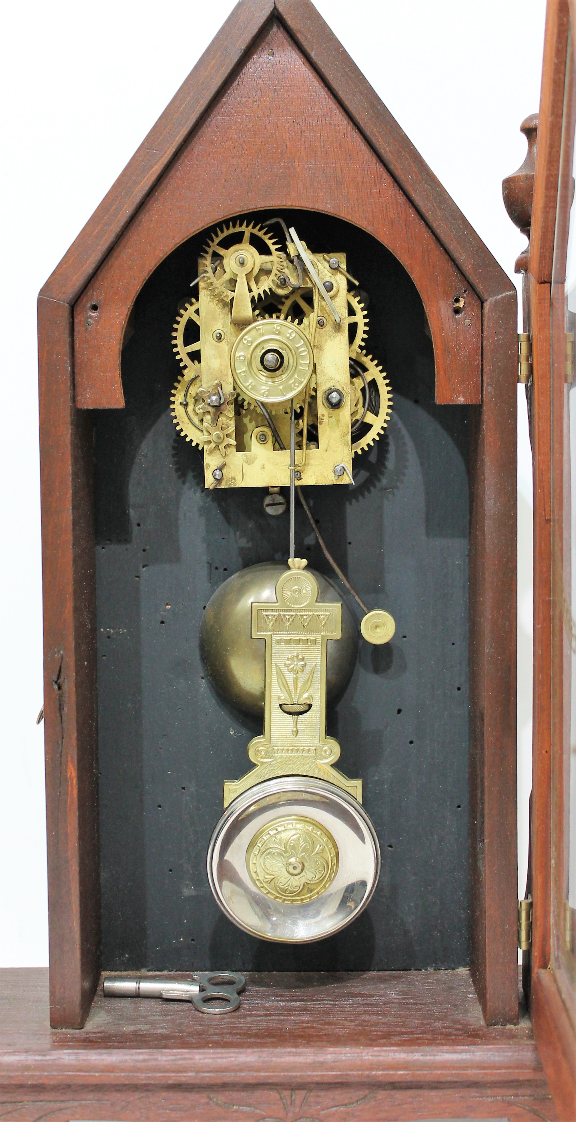 walnut case with a time and alarm 30-hour movement. The finish has been cleaned, the stenciled glass may be a replacement, the