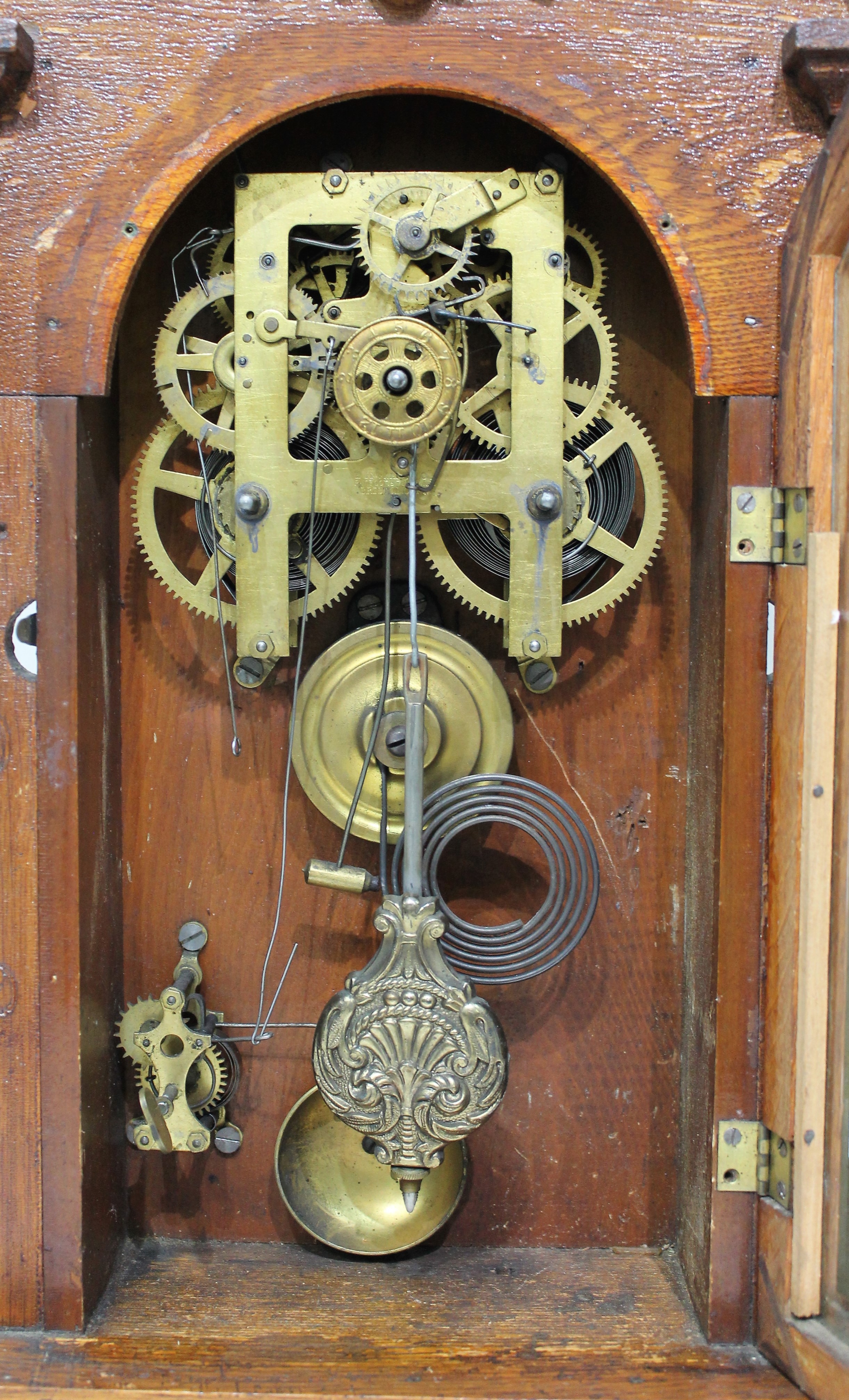 and a bubble level on the bottom. The door glass is period but may not be original. The dial is paper with proper hands. The 8-day, time-and-strike movement is signed and will run for a minute or two, having not been run in over a decade. It will