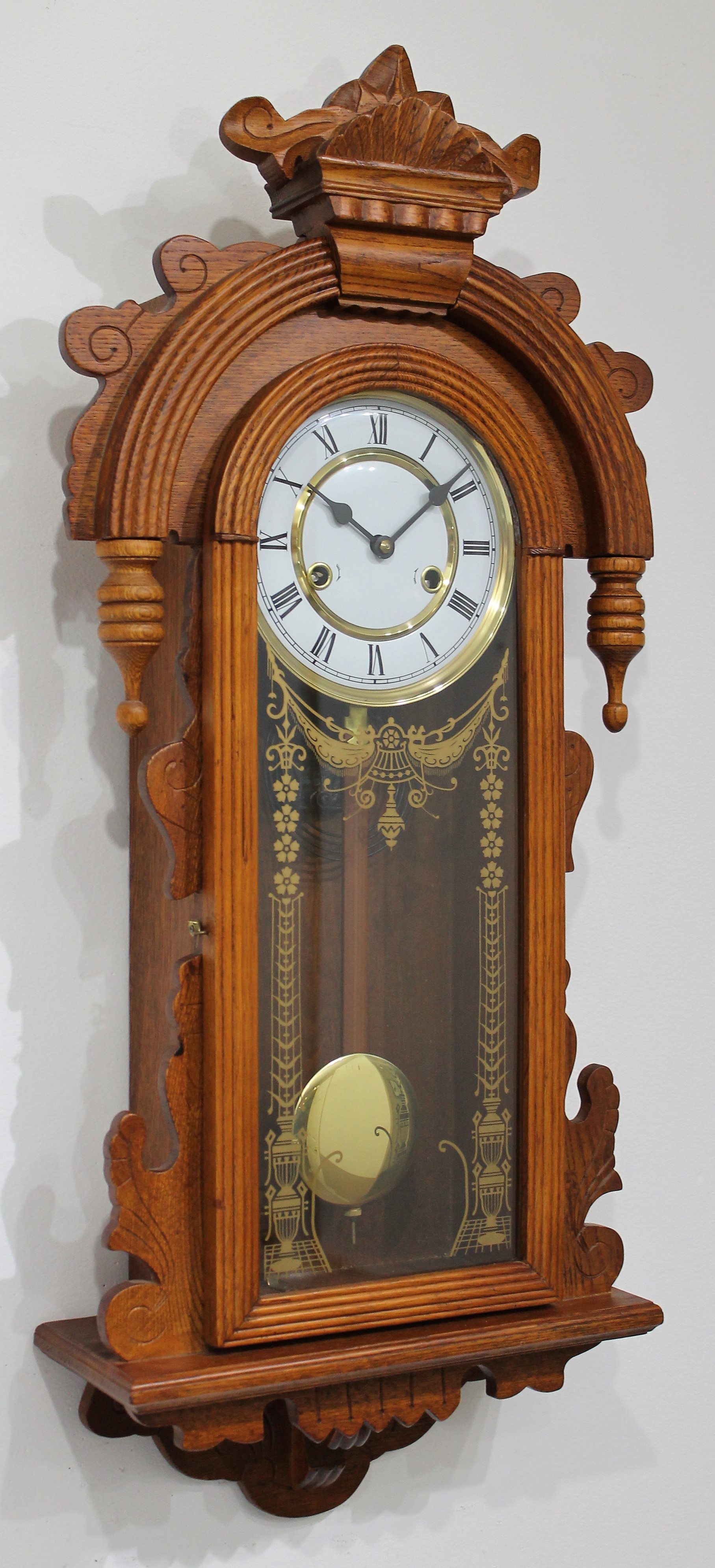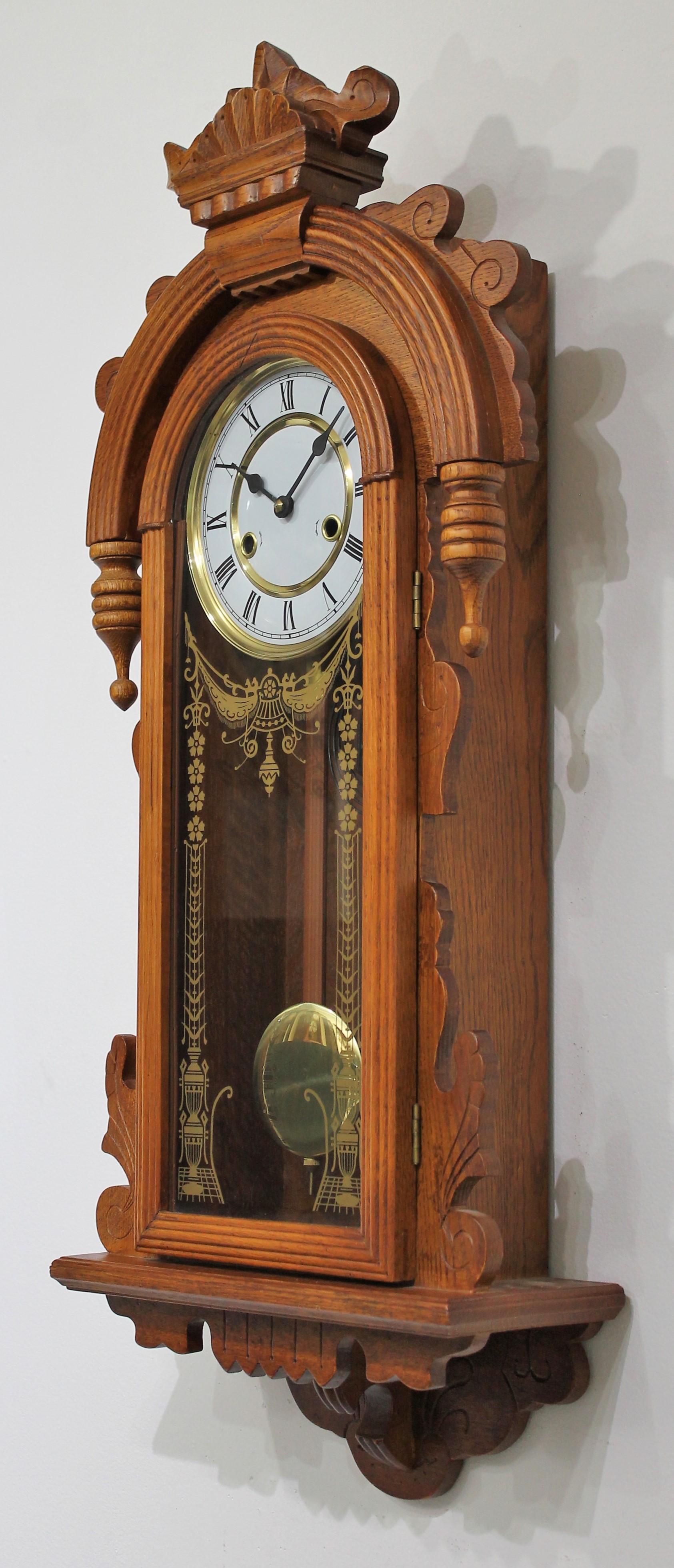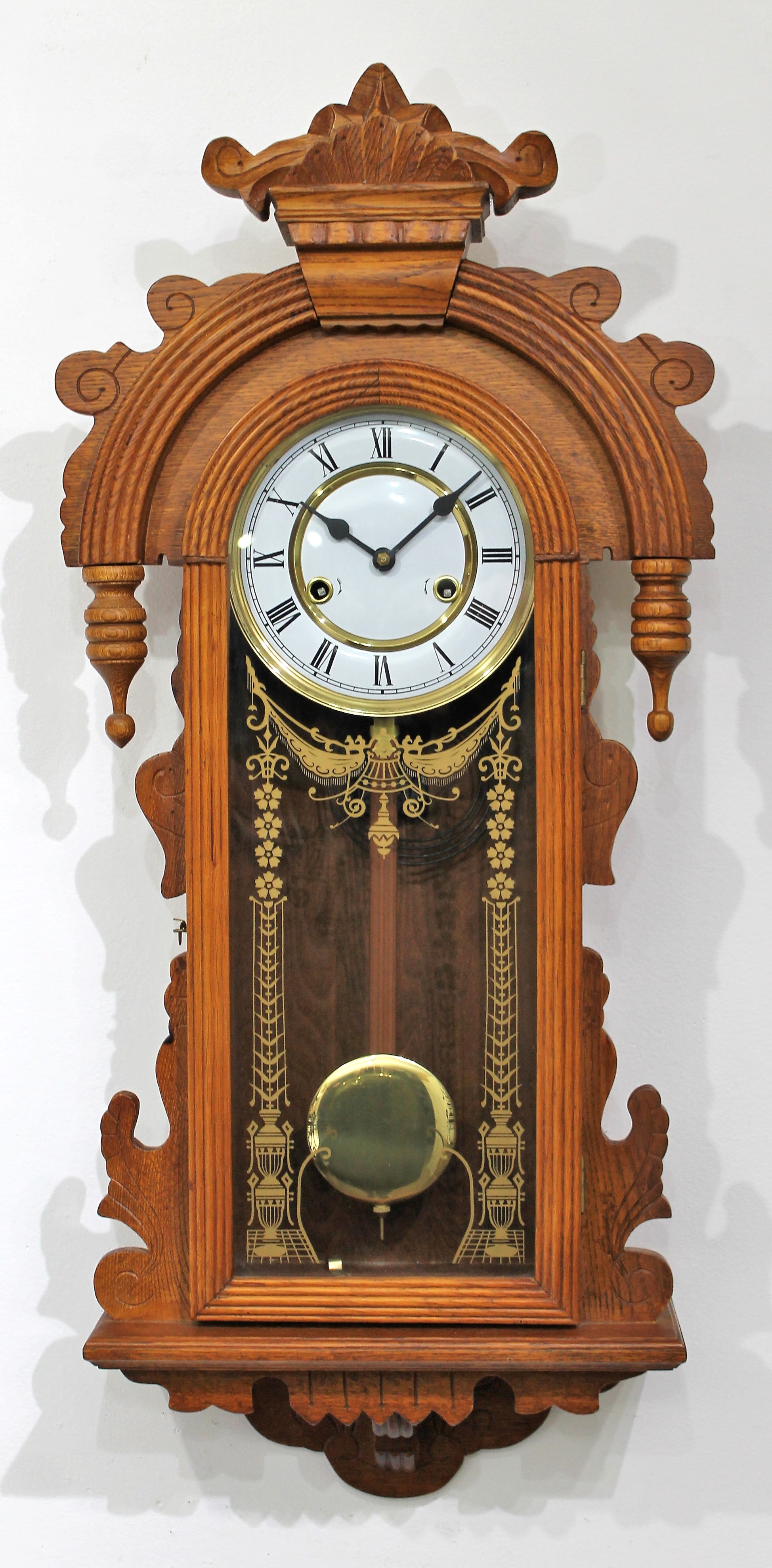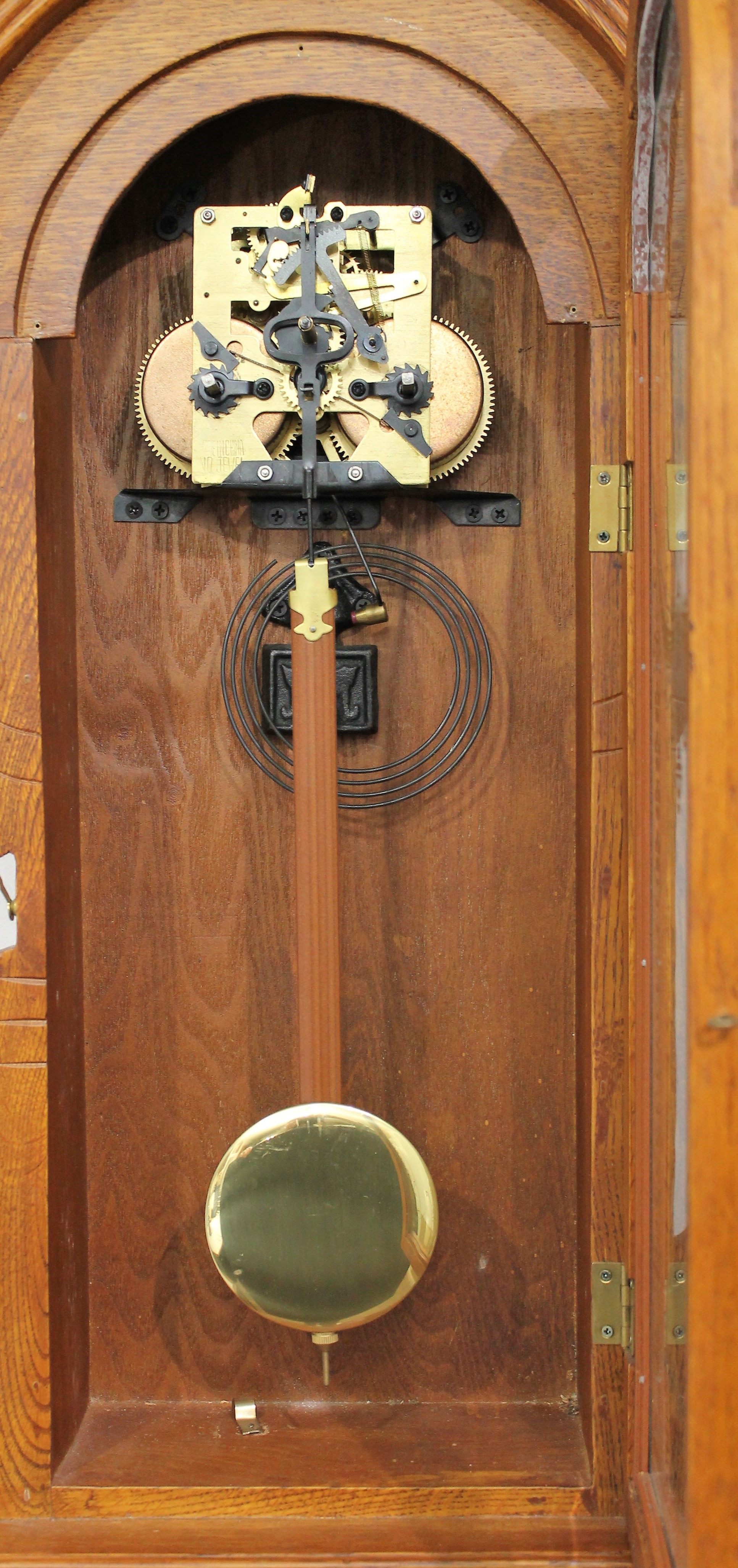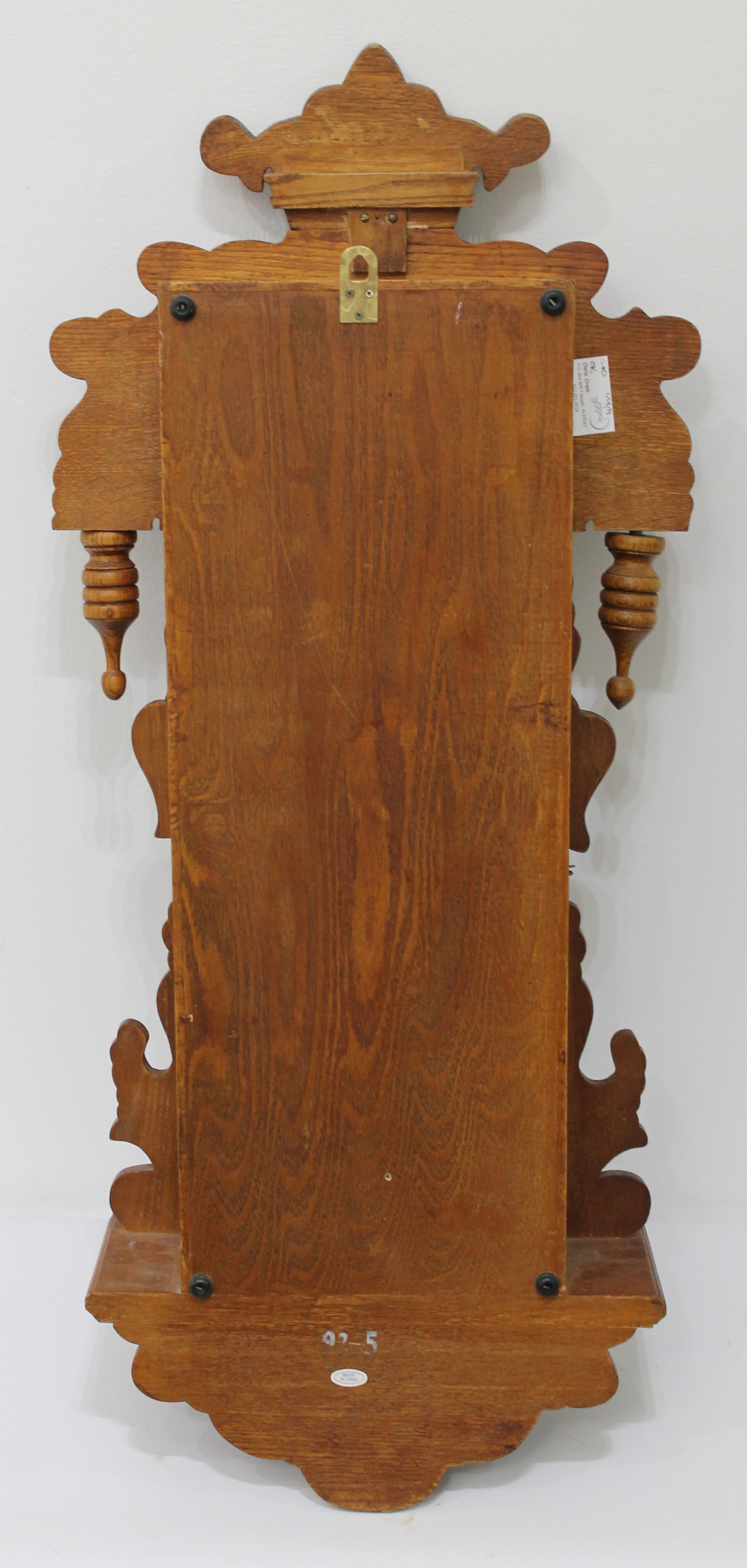 Chinese oak wall clock, ca. 1980. A 32-inch oak case with a Chinese-made 8-day, time-and-strike brass movement that strikes on the hours and half-hours on a wire gong; it is out of plumb and I cannot keep it running. The dial is porcelain. No label and the movement is marked “Made in China No jewels”. There is also a “Made in China” tag on the back. $25-$100.