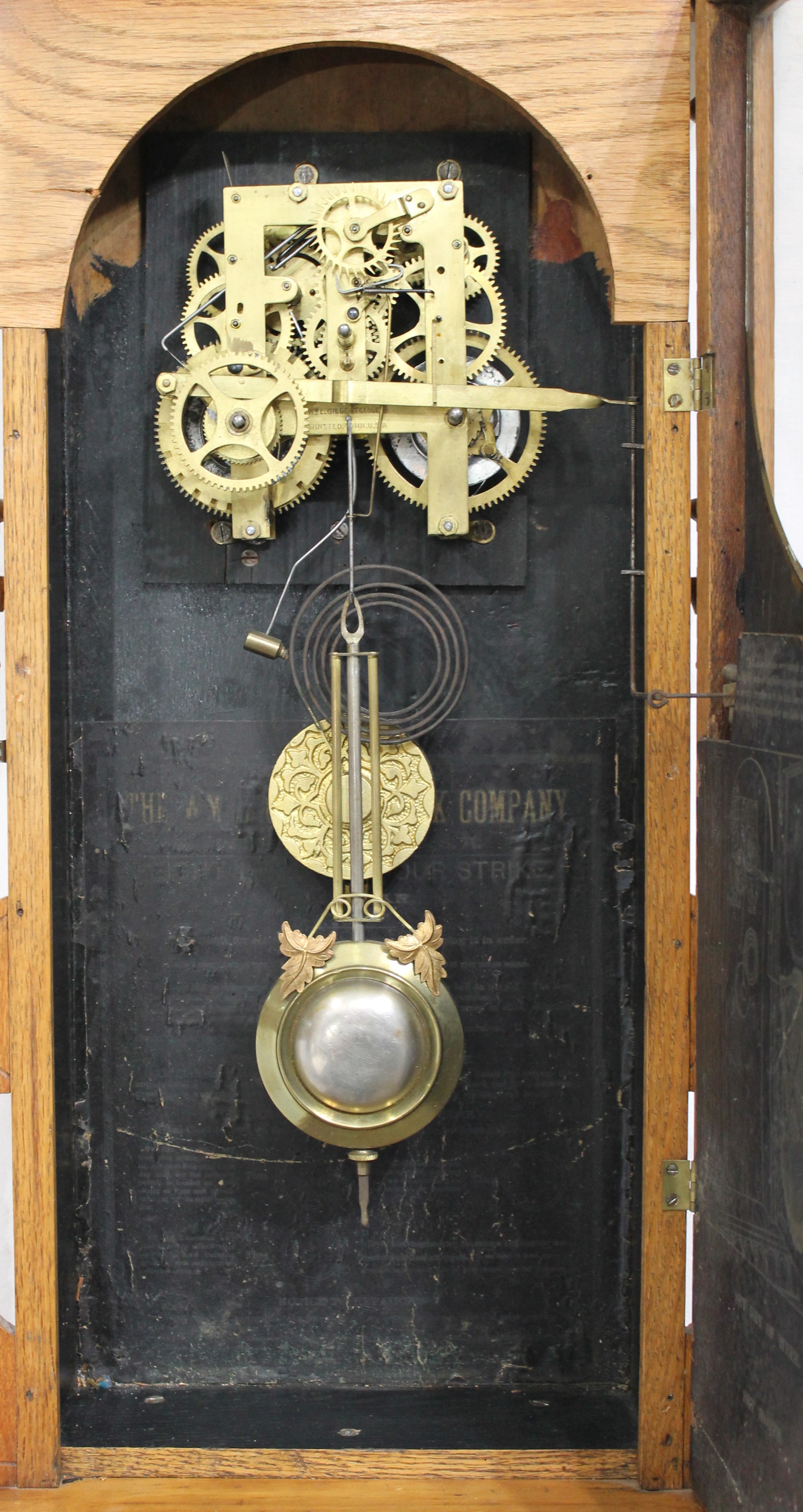 the rod but advancing the hands doesn’t do it. I have yet to find one of these calendar clocks that works without human intervention. The 38-inch oak case is clean as a whistle with all the ornaments, carved side pieces, twisted decorative bars, top and bottom. Only the two drop finials at the bottom appear to be replacements, and do not quite match the catalog illustration (Ly, Gilbert Clocks,
