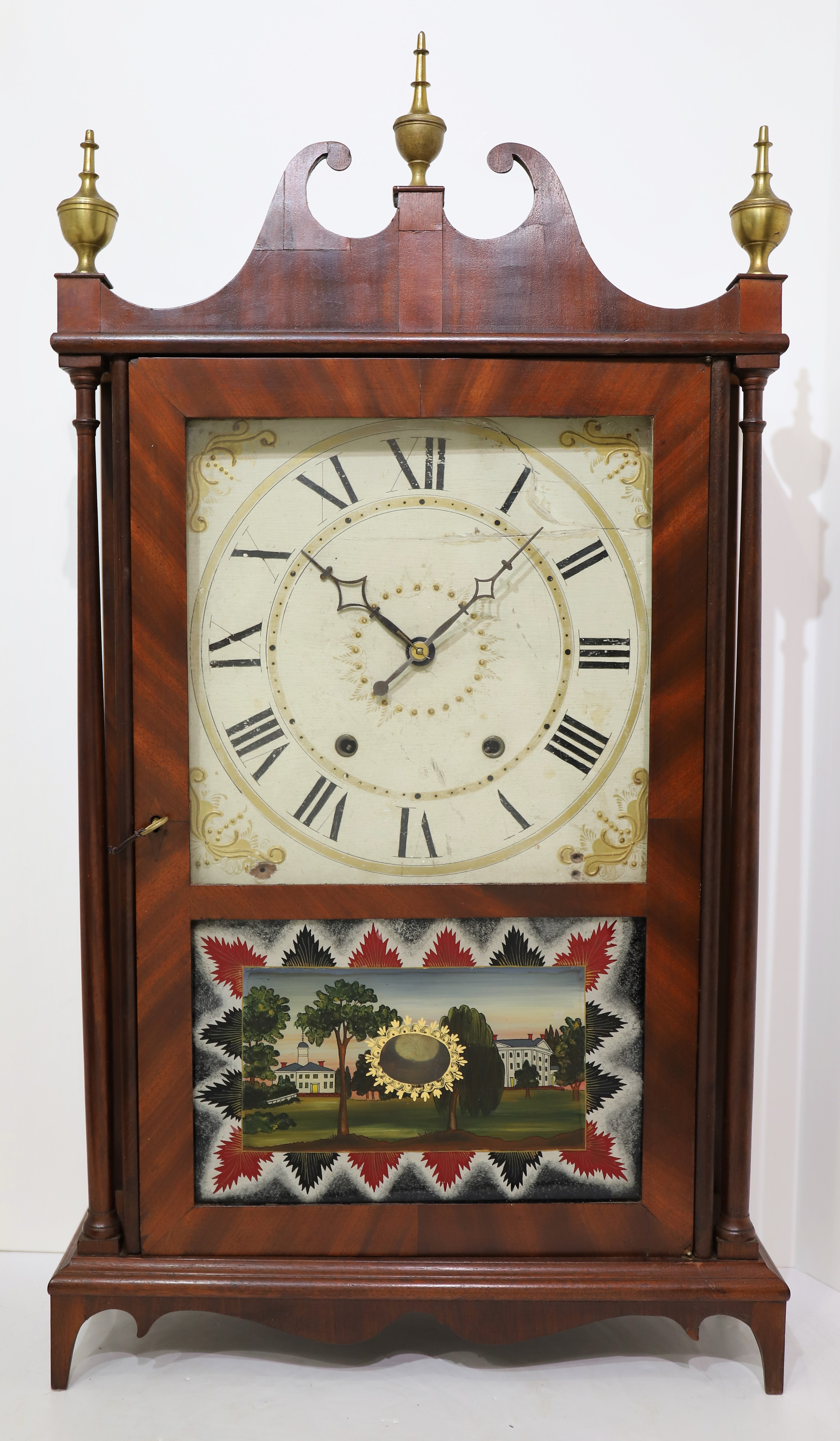 pillar & scroll, 1824-1832. A 31.5-inch case with good veneer – there are two veneer repairs on the scroll top, and the