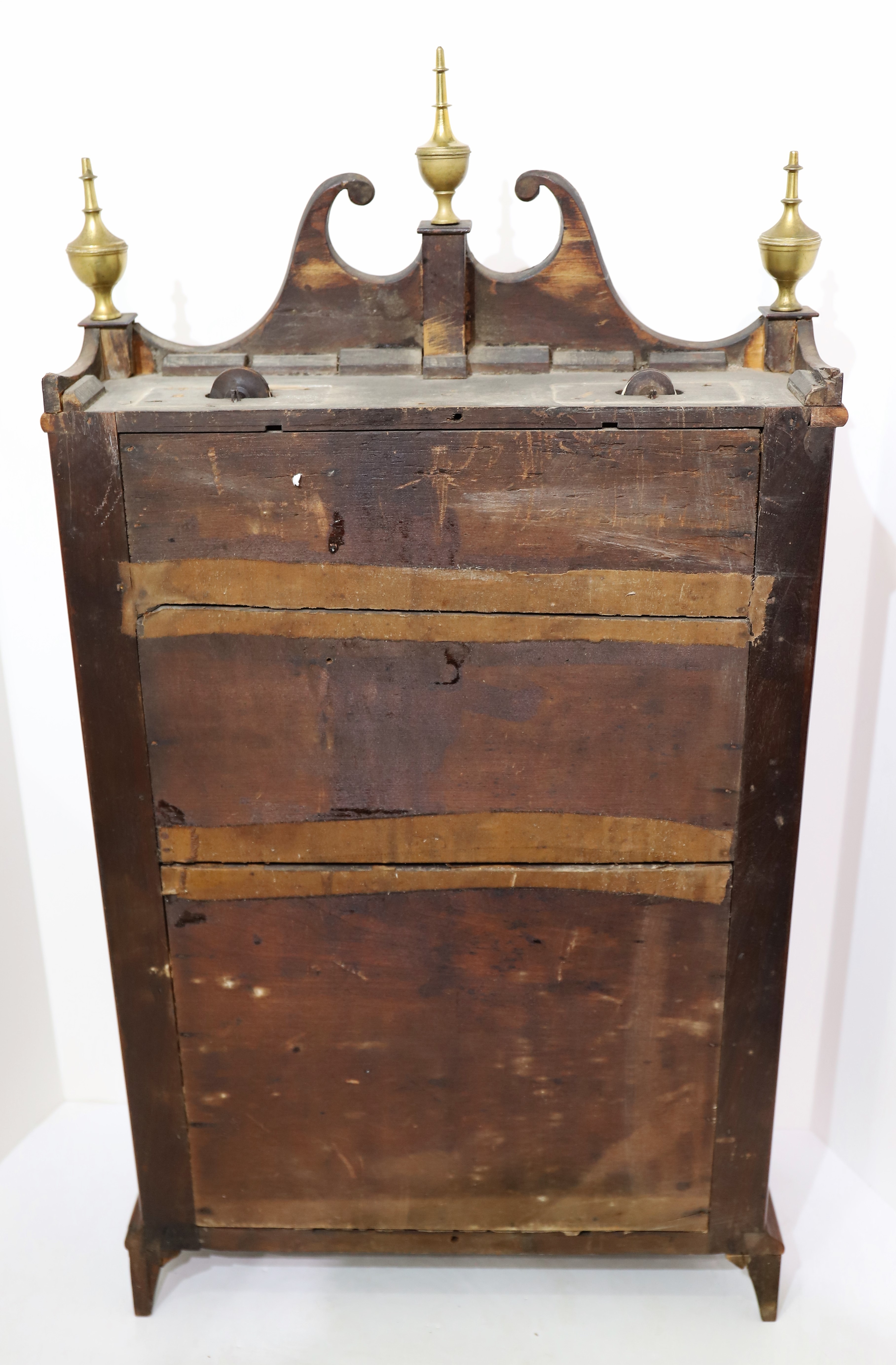escutcheon may have been replaced. Two of the brass urn finials are on wooden posts, one is on a metal post. The feet