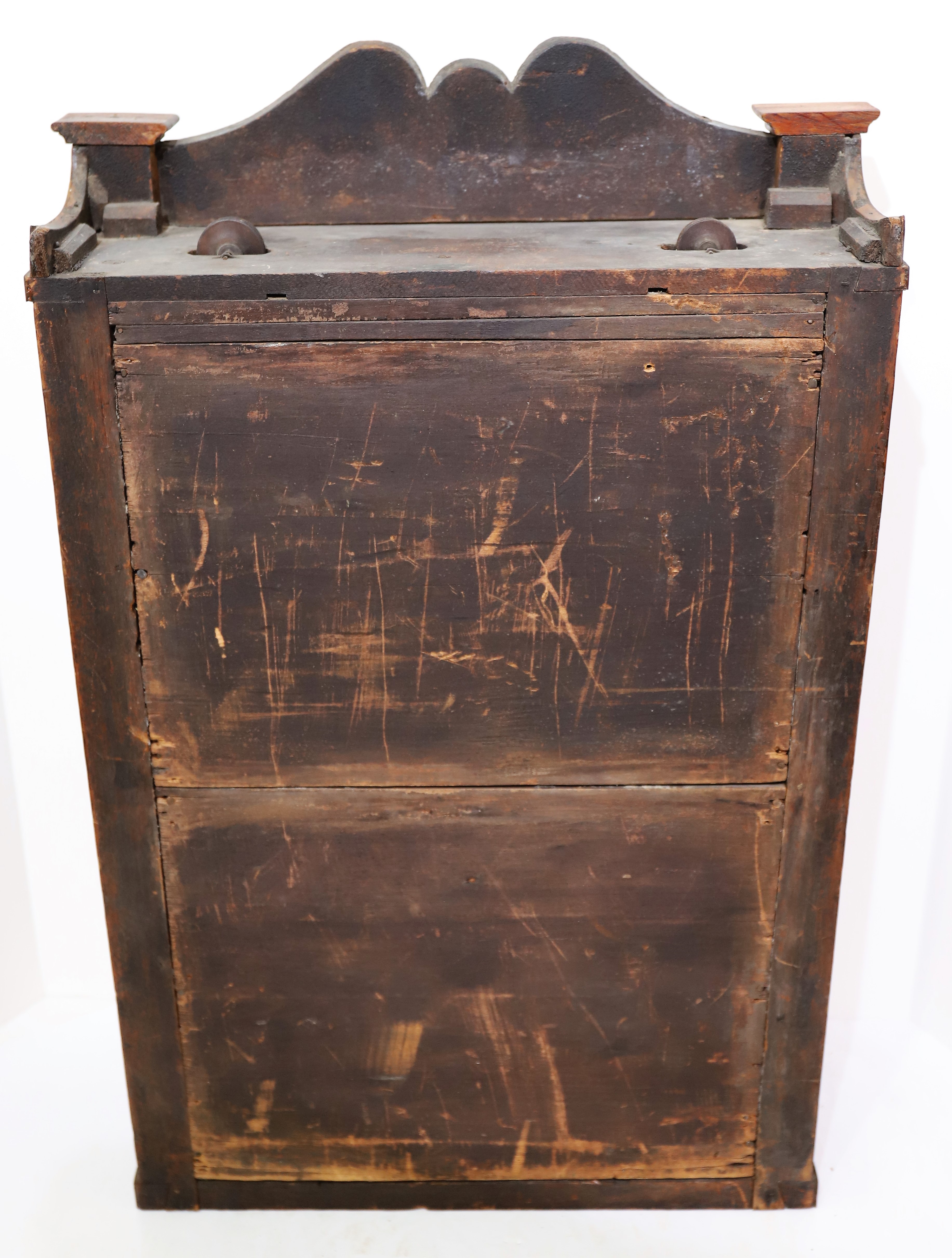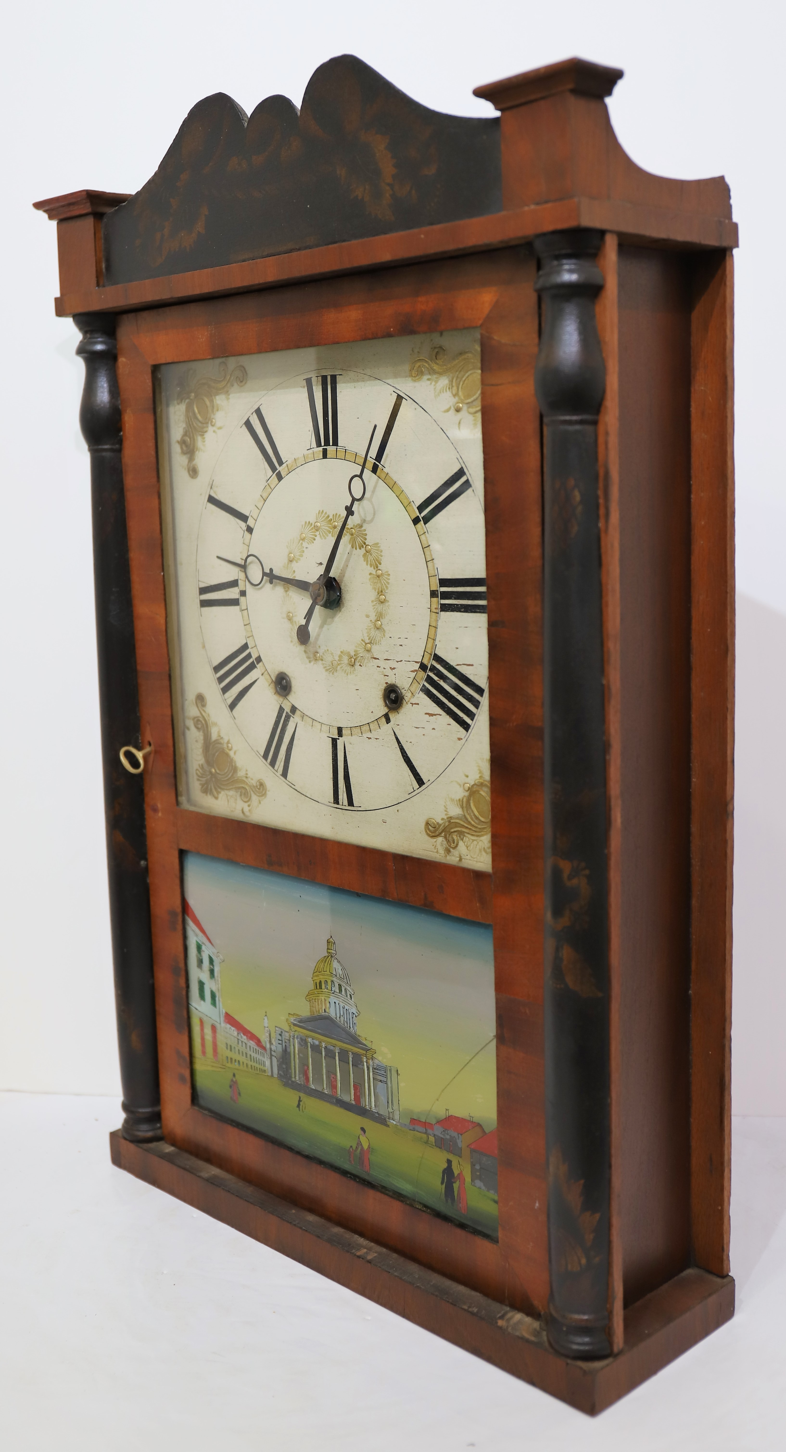 veneer and original bronzed columns and splat. It appears this clock had feet; note the inset sides, reminiscent of pillar &