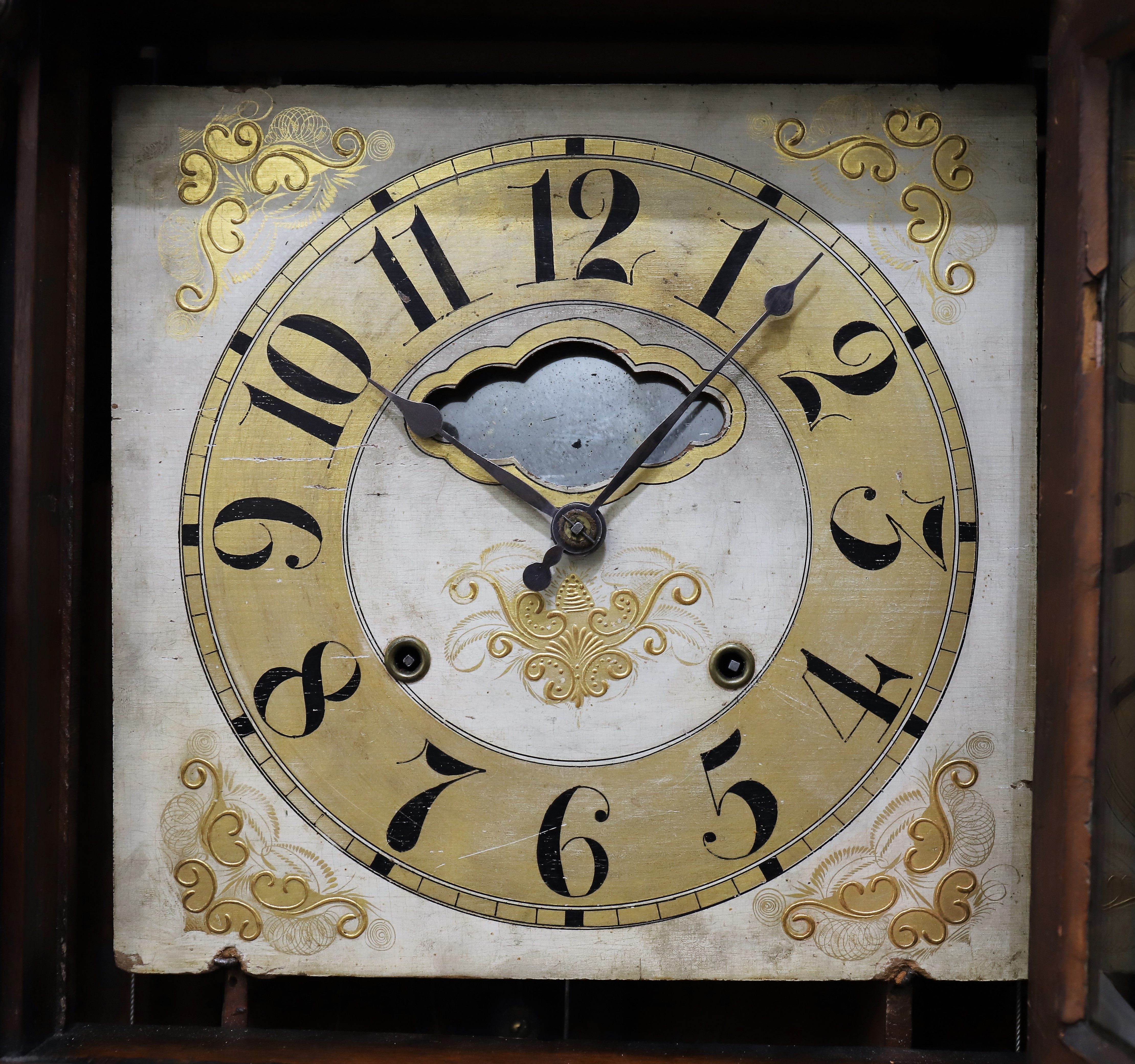 the two tablet glasses are old but may be replacements; both were repainted by Tom Moberg. The wood dial is a bit faded, the